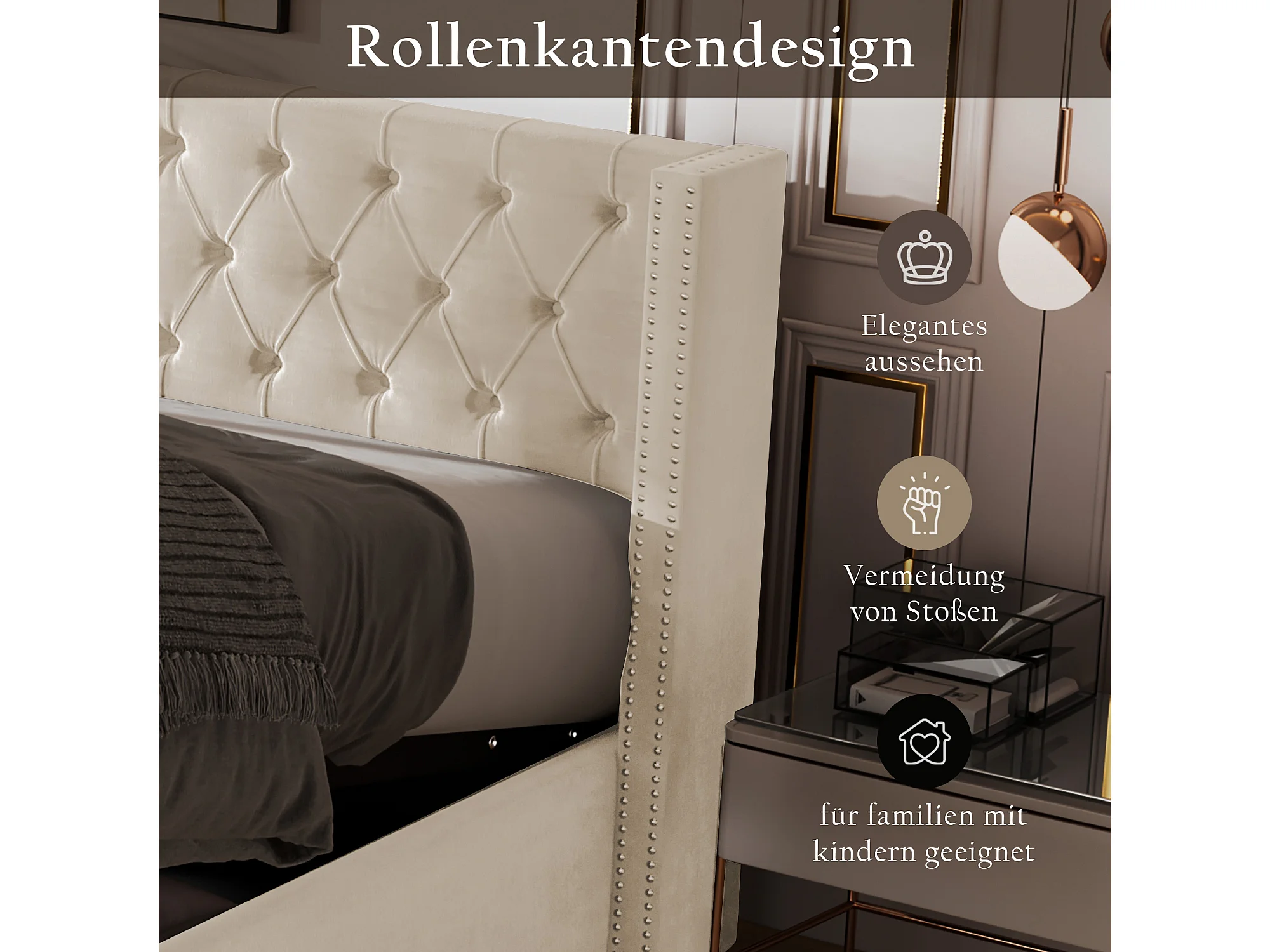 Lit capitonné avec rangement, style Chesterfield, velours beige, 140x200 cm, hydraulique, avec 2 tiroirs
