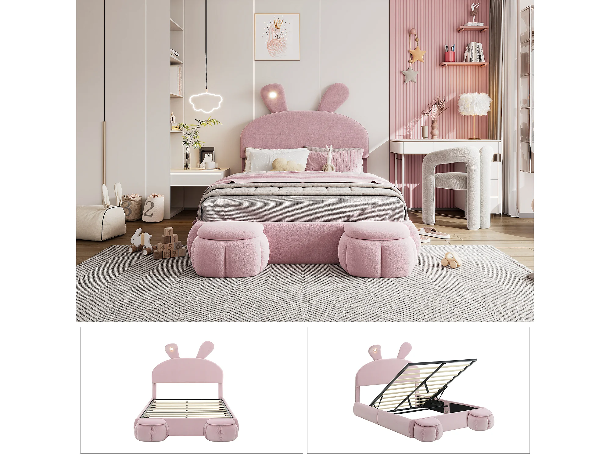Lit capitonné en velours rose, 140x200 cm, design oreilles de lapin avec éclairage LED réglable et rangement, 2 tabourets inclus (238x154x135 cm)