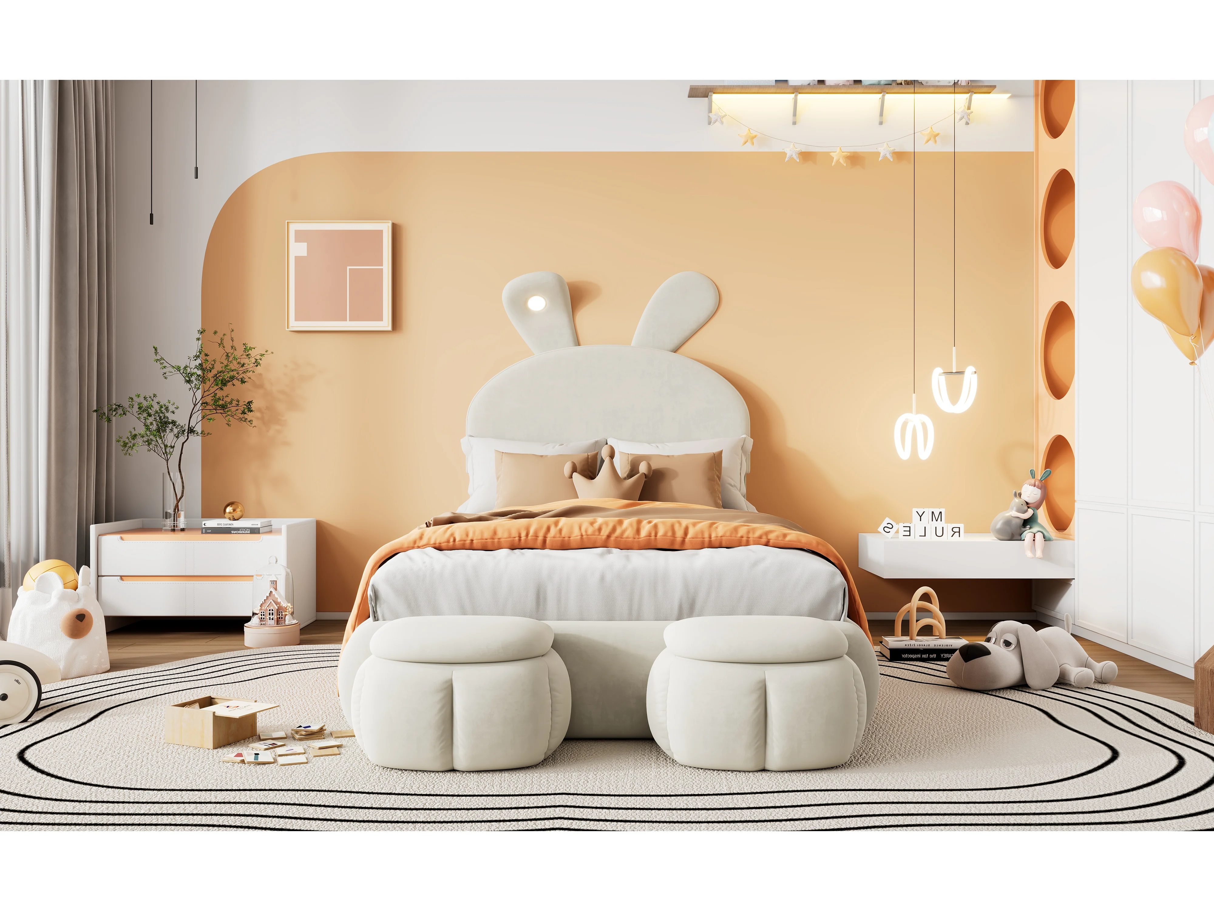 Lit capitonné en velours rose, design oreilles de lapin, avec éclairage LED réglable et rangement, 90x200 cm (237x104x135 cm)