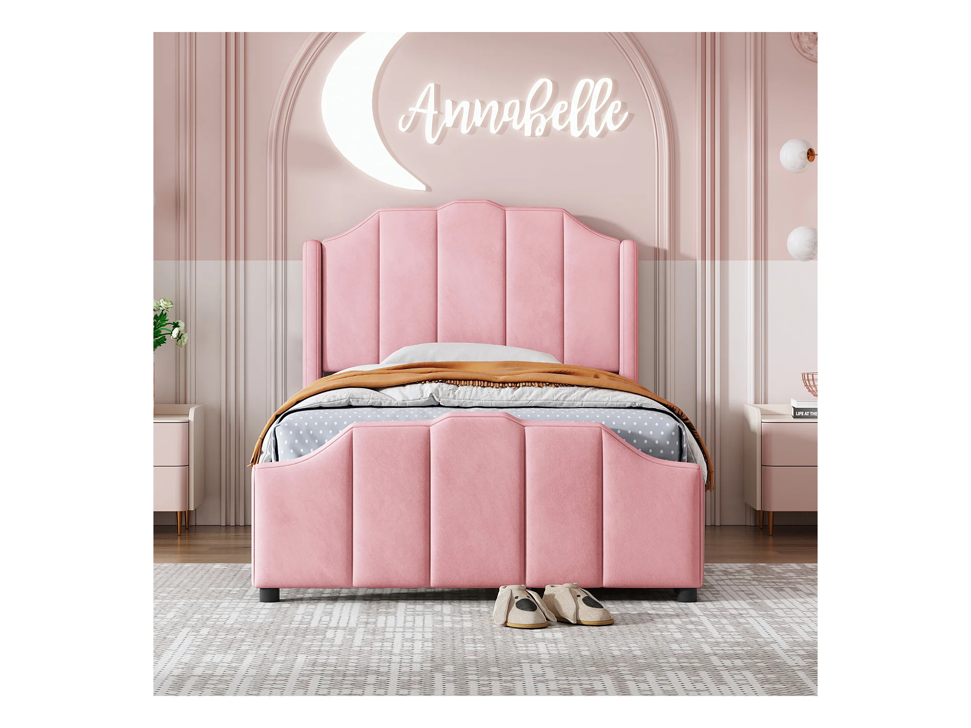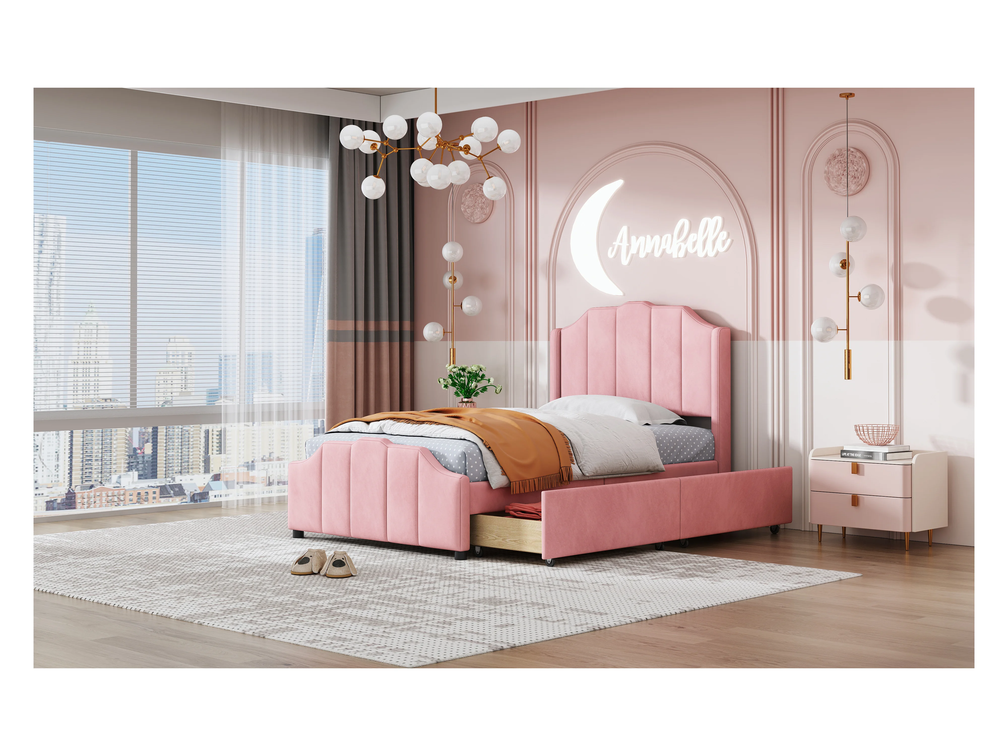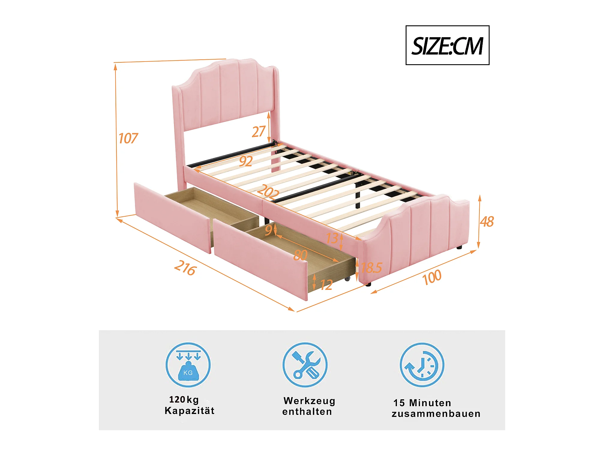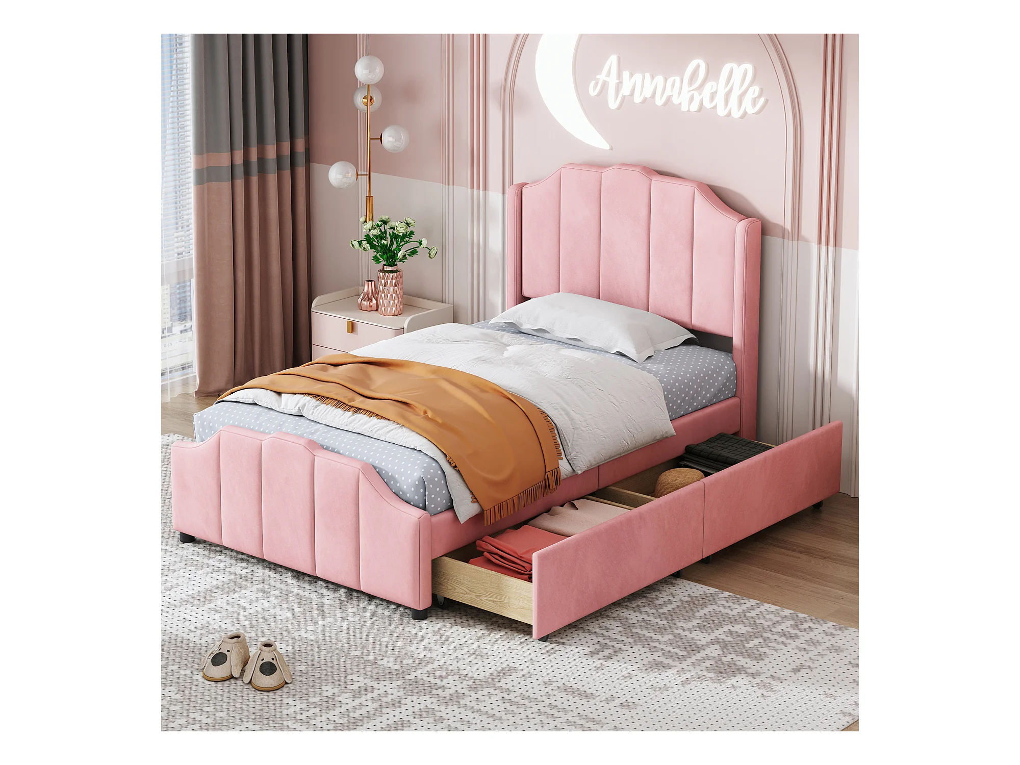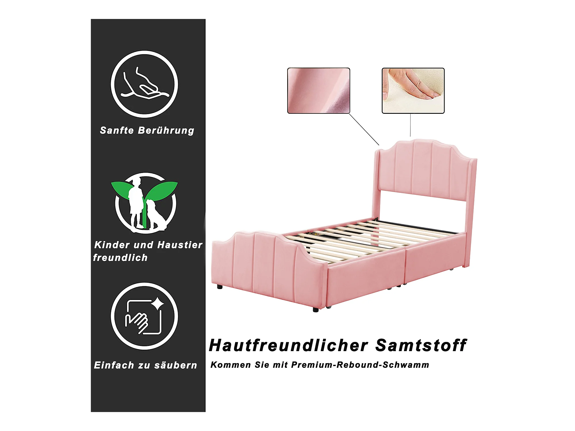 Lit capitonné enfant 90 x 200 cm avec tête de lit et 2 tiroirs - velours - rose