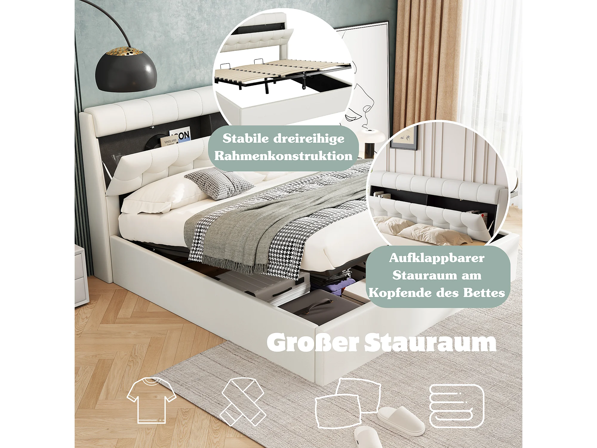 Lit capitonné hydraulique avec rangement 2-en-1, PU, blanc, avec sommier à lattes (189x31x19 cm)