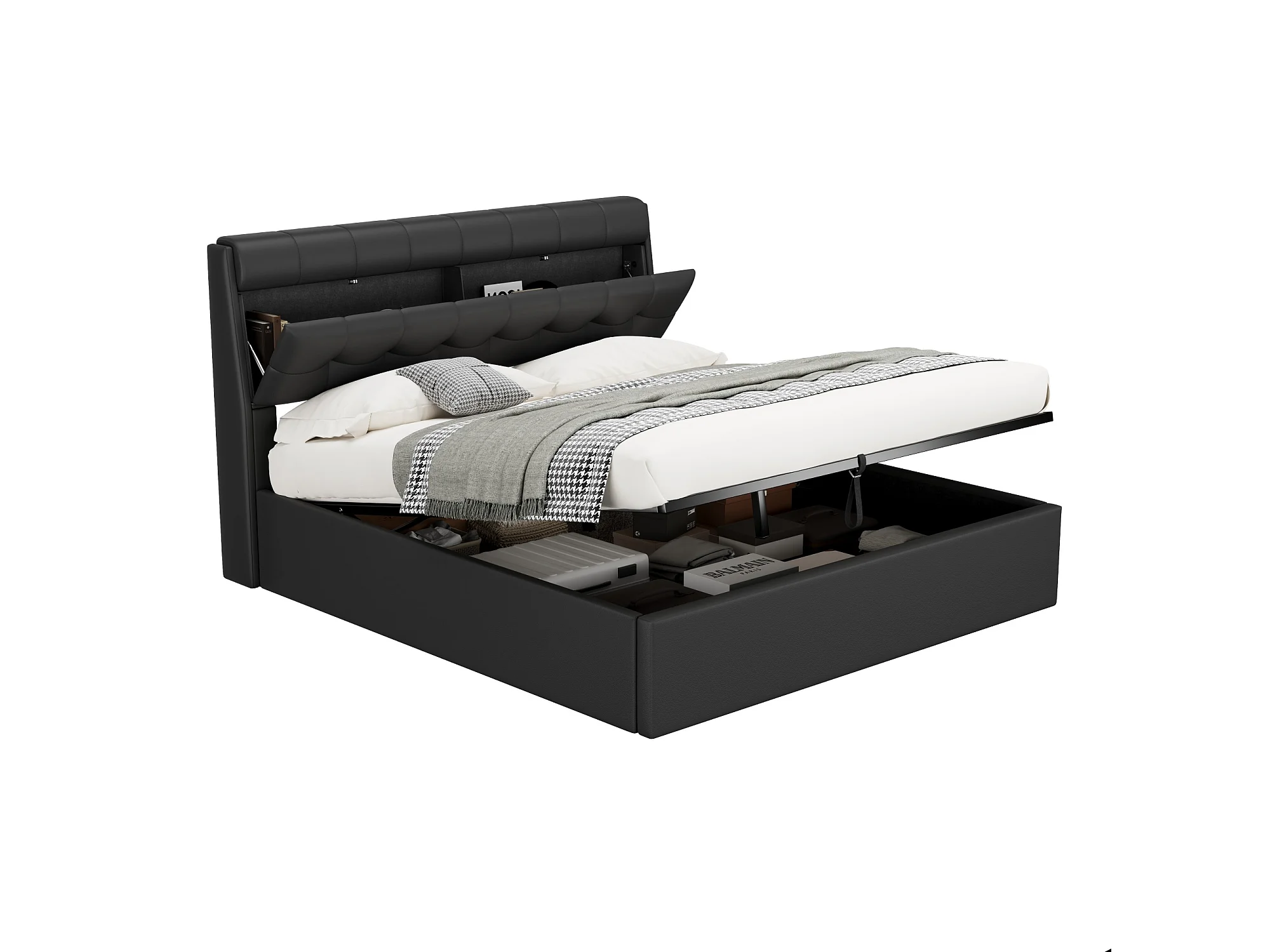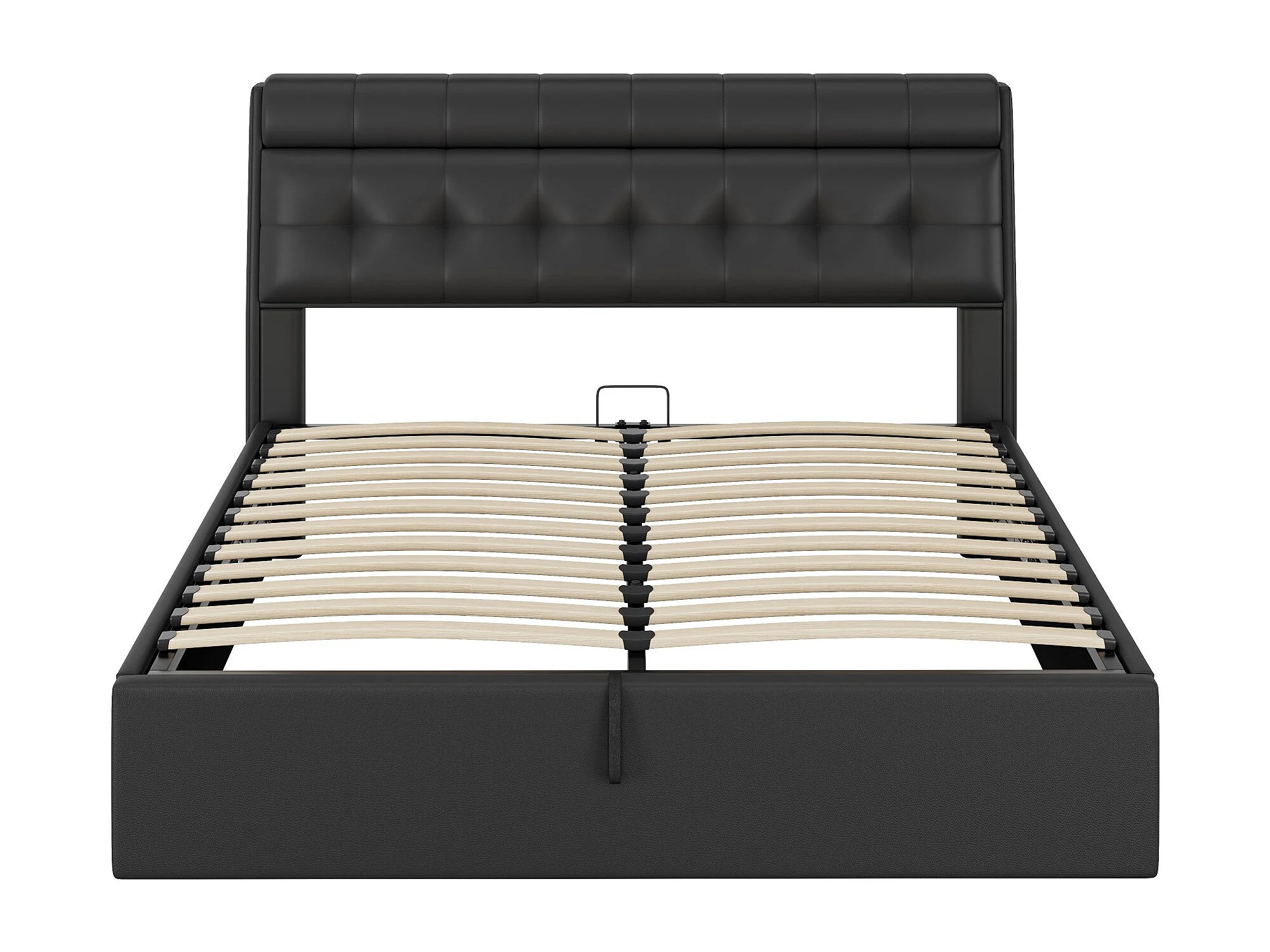 Lit capitonné hydraulique, PU, noir, avec rangement 2-en-1, sommier à lattes (197.5x30.5x19 cm)