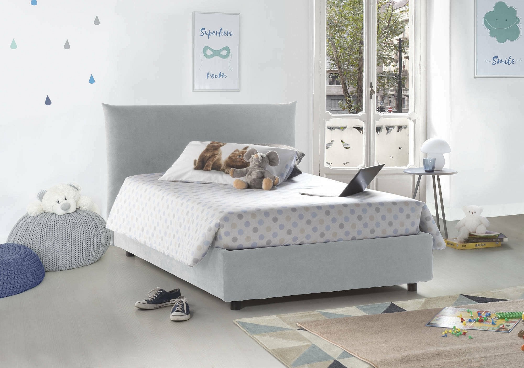 STRUCTURE - La structure du lit est en fibre de bois surélevée avec pieds en ABS et est recouverte d'un tissu doux en polyester déhoussable et lavable en machine à 30° - La tête de lit linéaire associée à des coutures apparentes en tissu est solide et résistante - Le sommier à lattes en contreplaqué est inclus dans la structure - Mécanisme d'ouverture en fer - L'ajout de la boîte de rangement pratique et peu encombrante permet au lit de se transformer en un coffre spacieux pour les draps, les oreillers et les couettes.