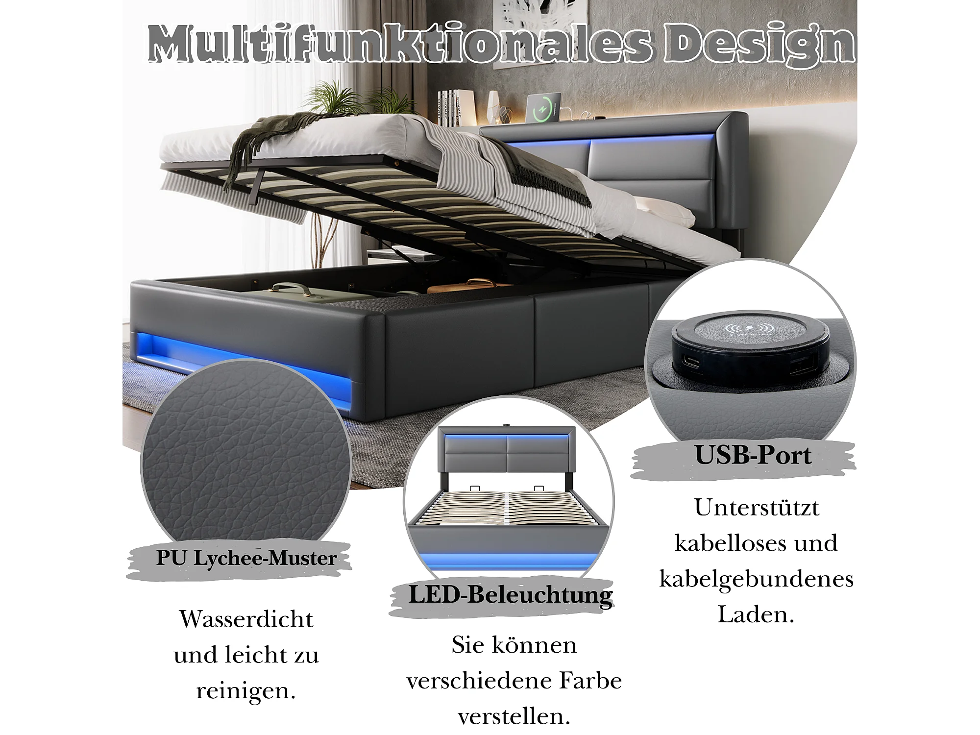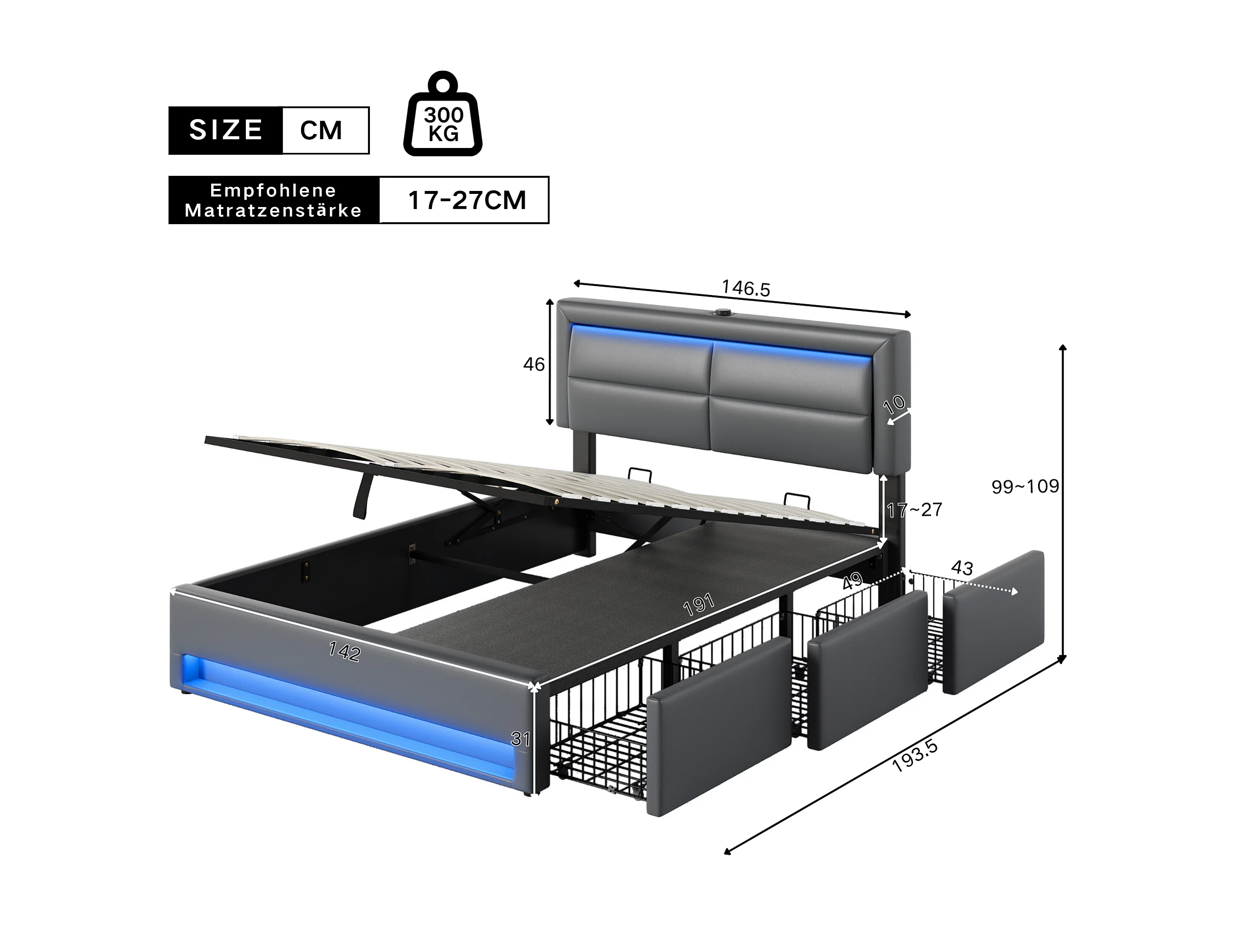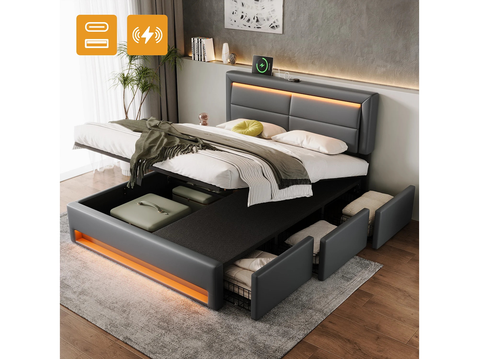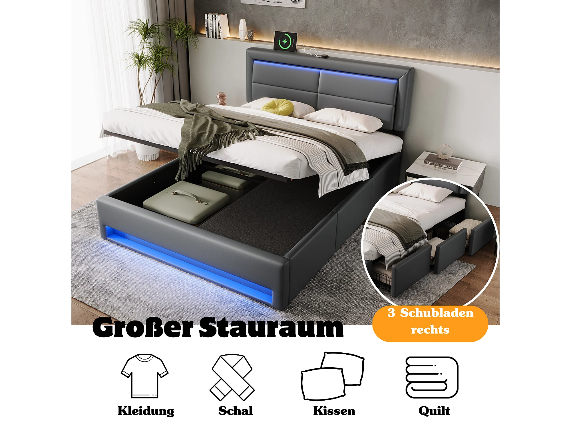 Lit coffre 140 x 190 cm avec tête de lit et 3 tirois - LEDs et port USB - Cuir PU - Gris (sans matelas)