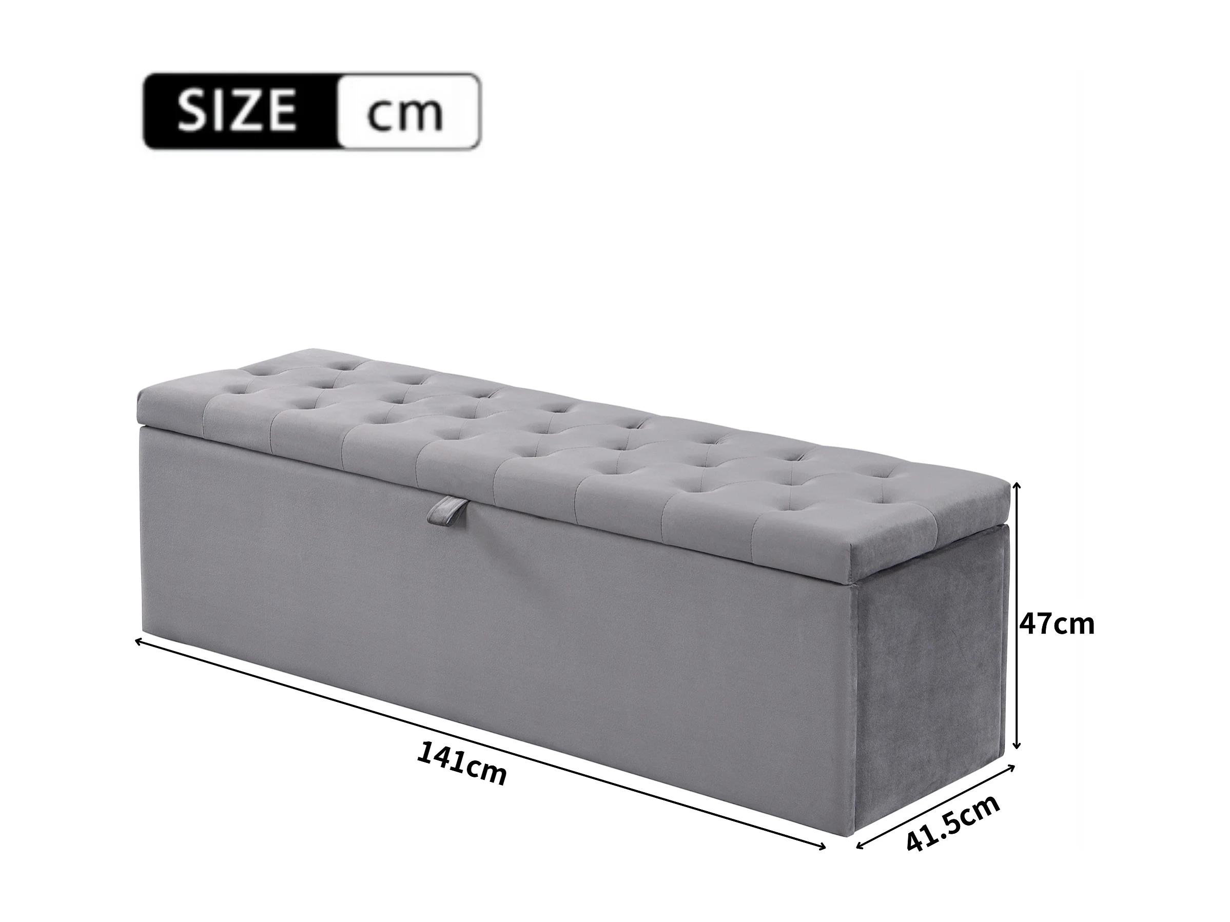 Lit coffre 140 x 200 cm avec banquette de coffre - velours - décor avec boutons - coloris gris