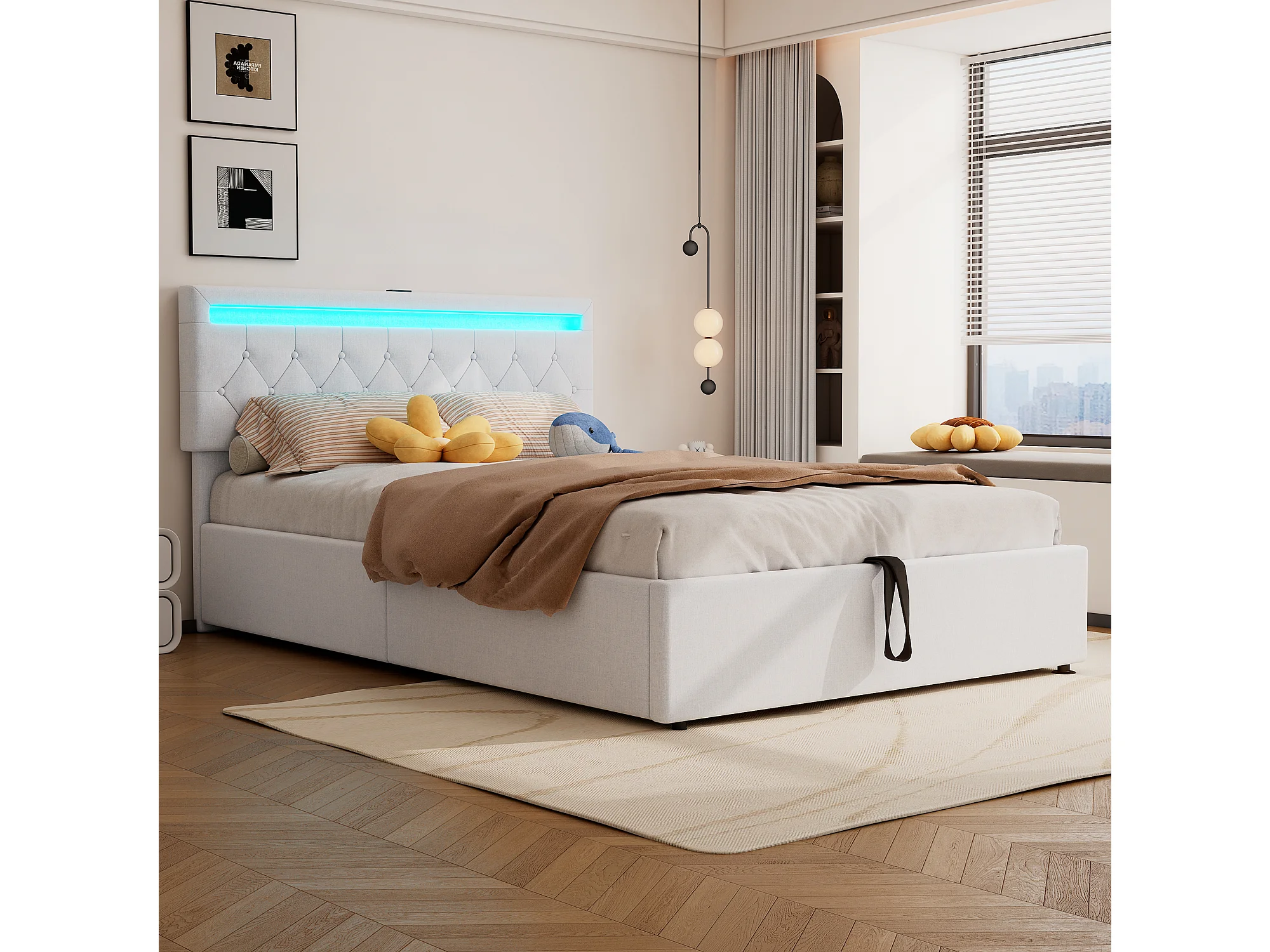 Lit coffre 140 x 200 cm avec prises USB, Type-C - LEDs - Tissu en lin - Coloris blanc