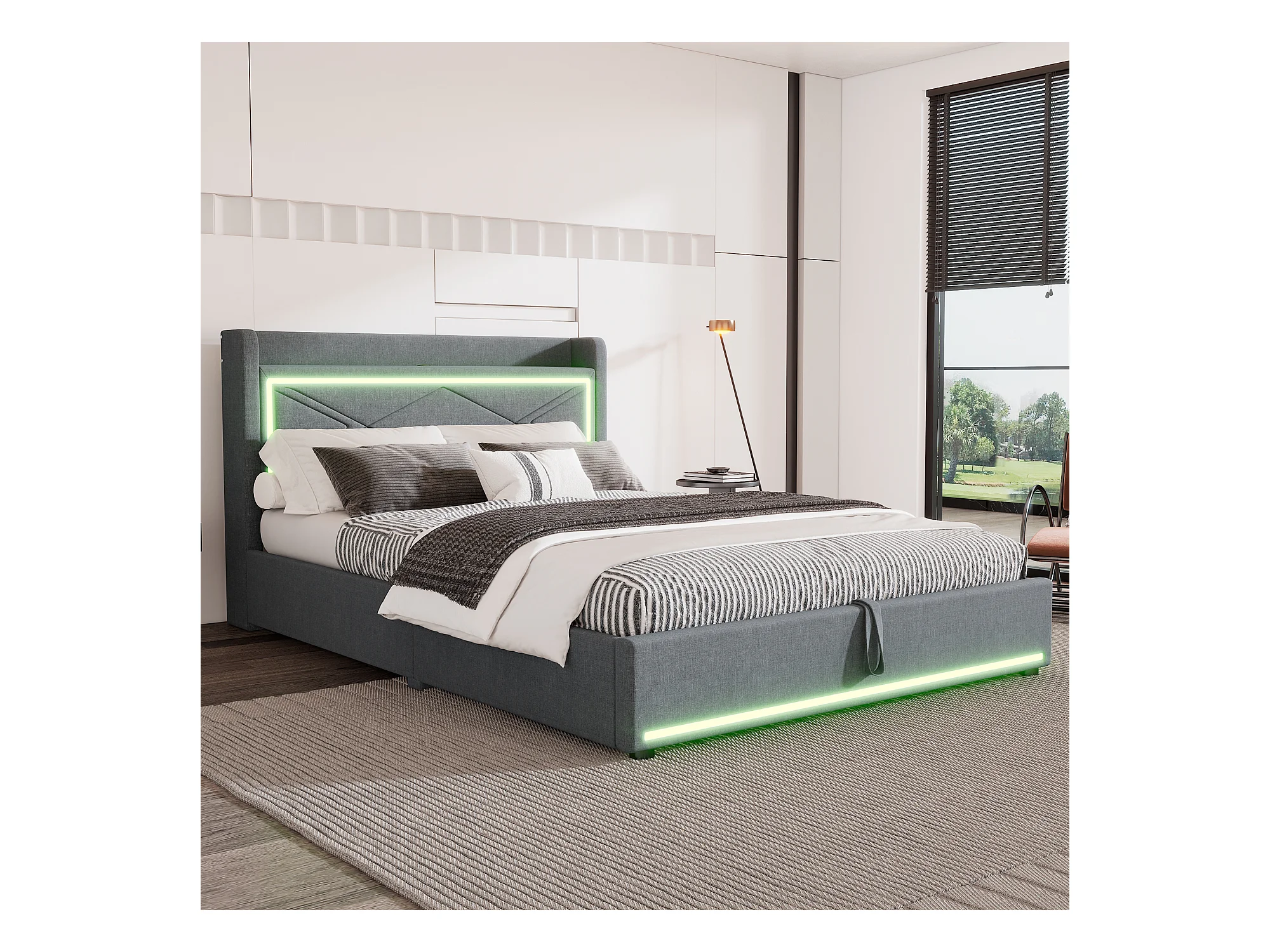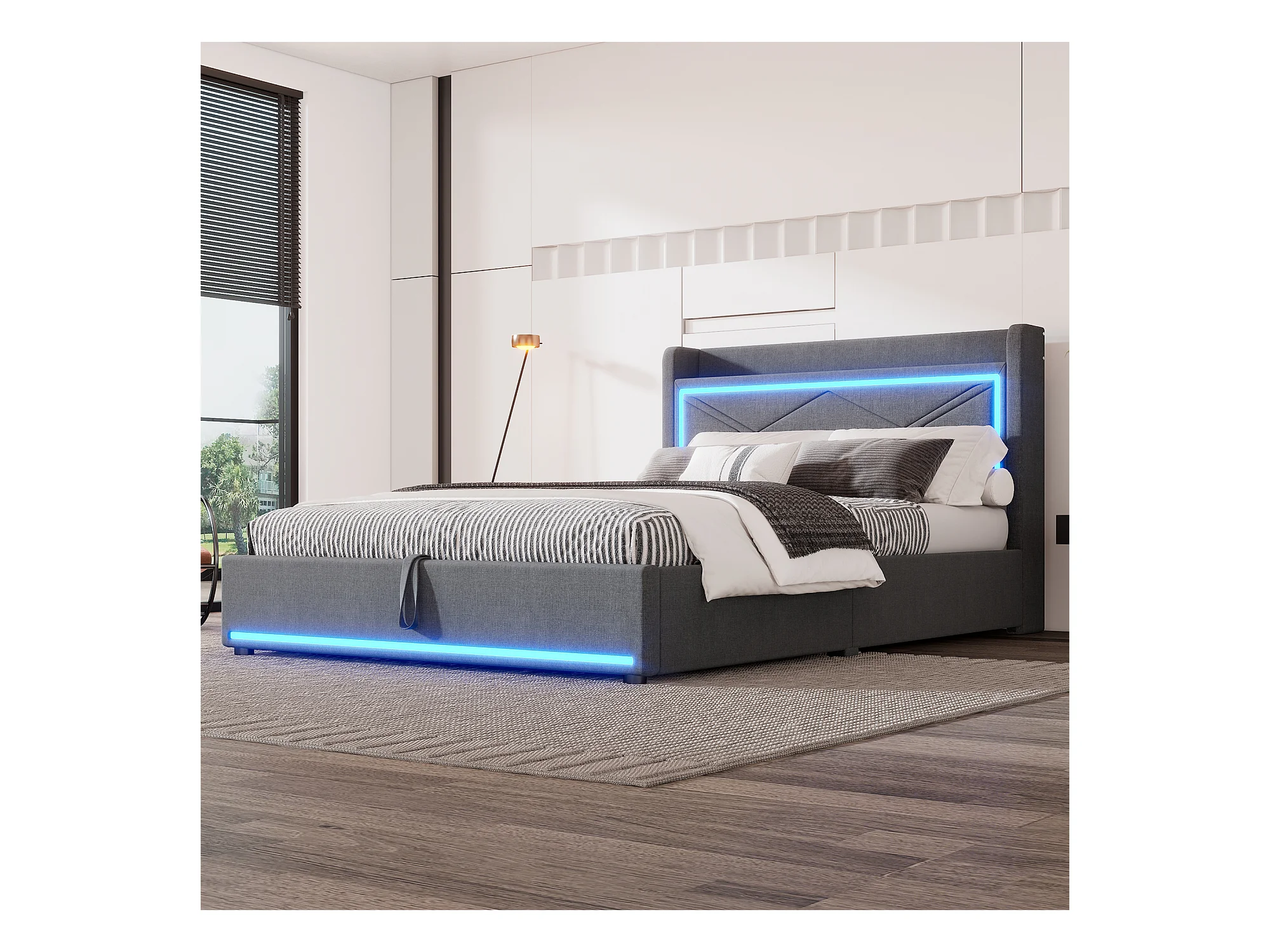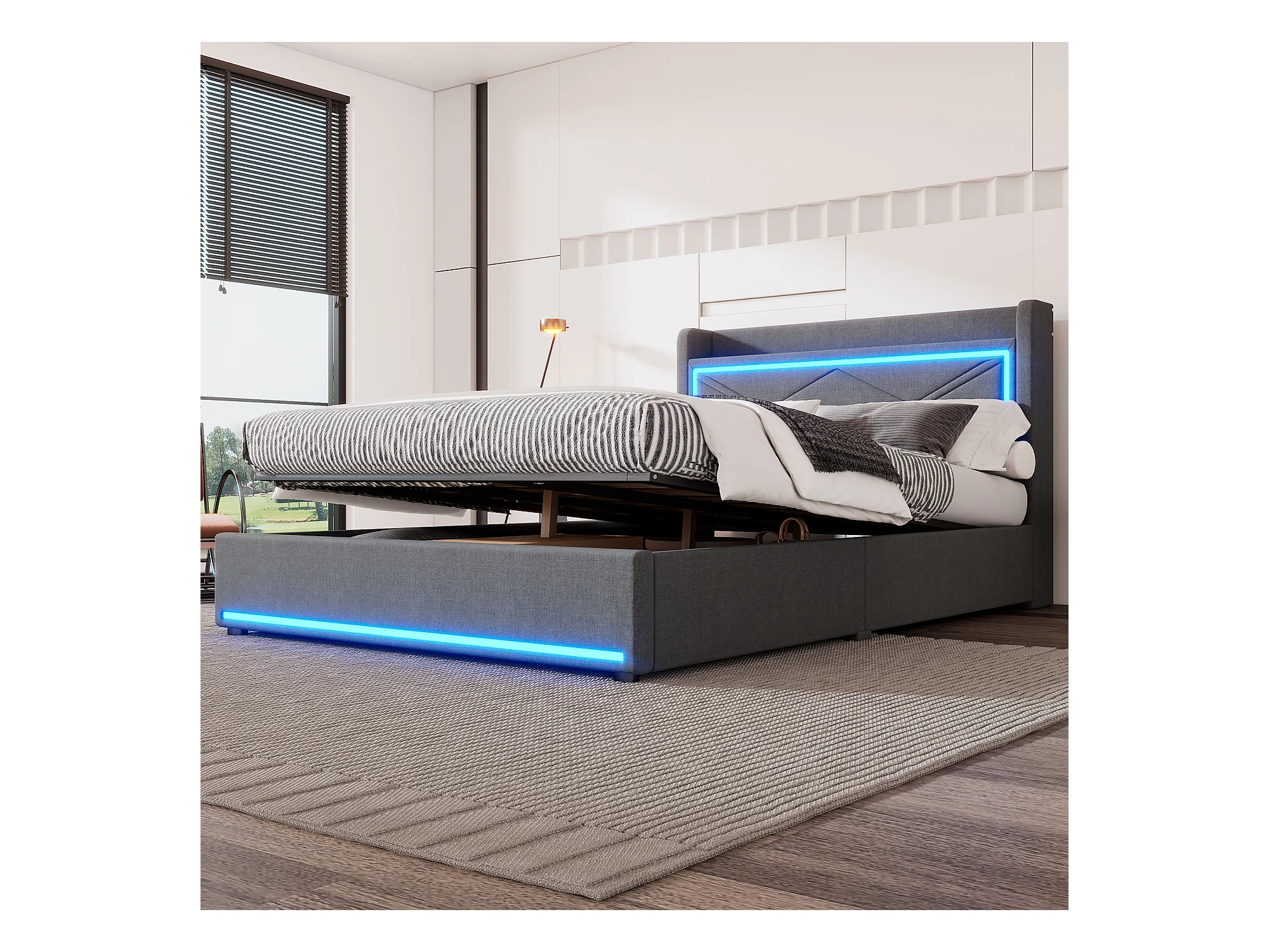 Lit coffre 140 x 200 cm avec tête de lit - LEDs et port USB - Tissu en lin - Style contemporain - Gris