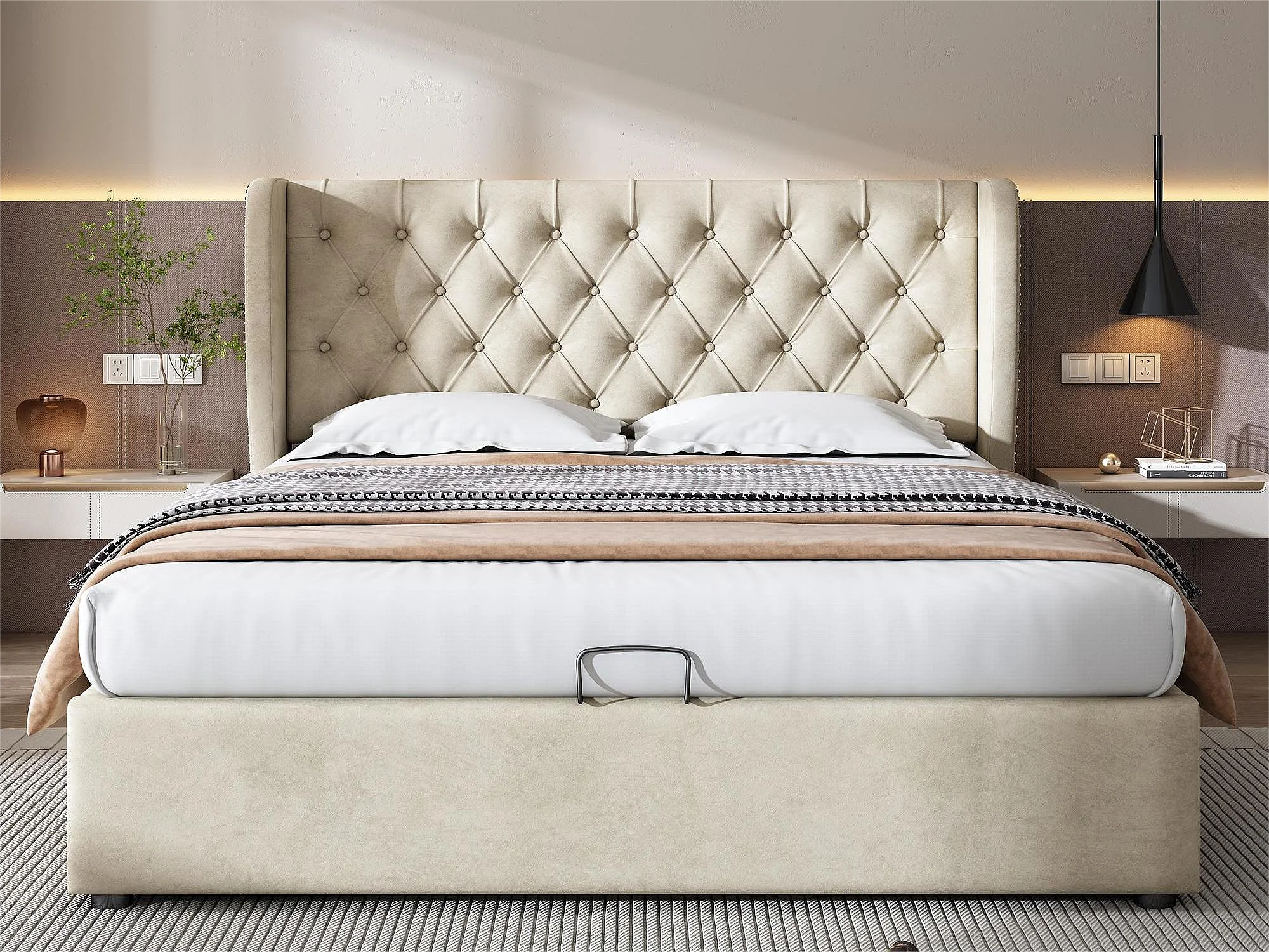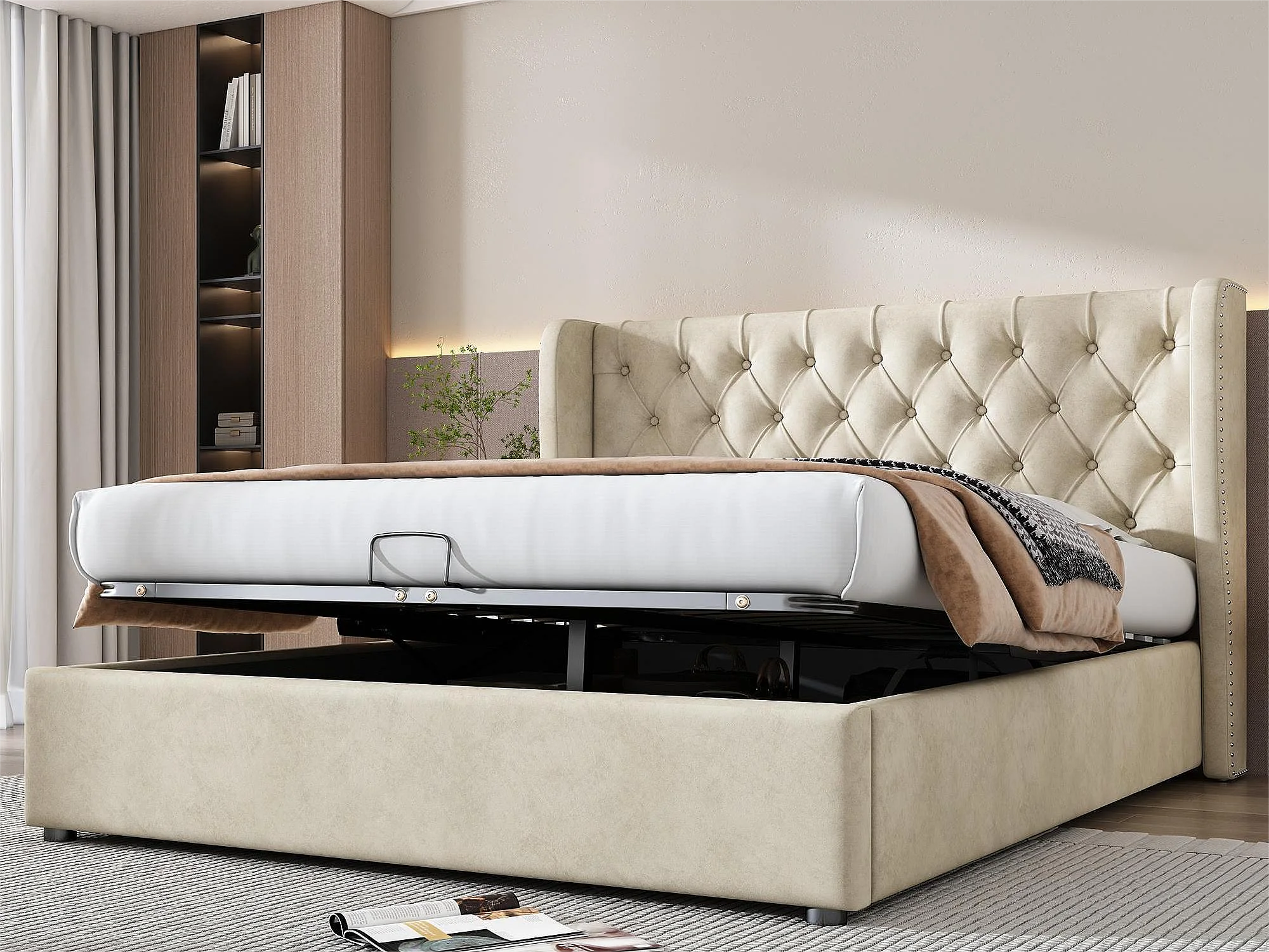 Lit coffre 140 x 200 cm, lit adulte rembourré en velours, décor avec rivets et boutons, sommier à lattes, beige
