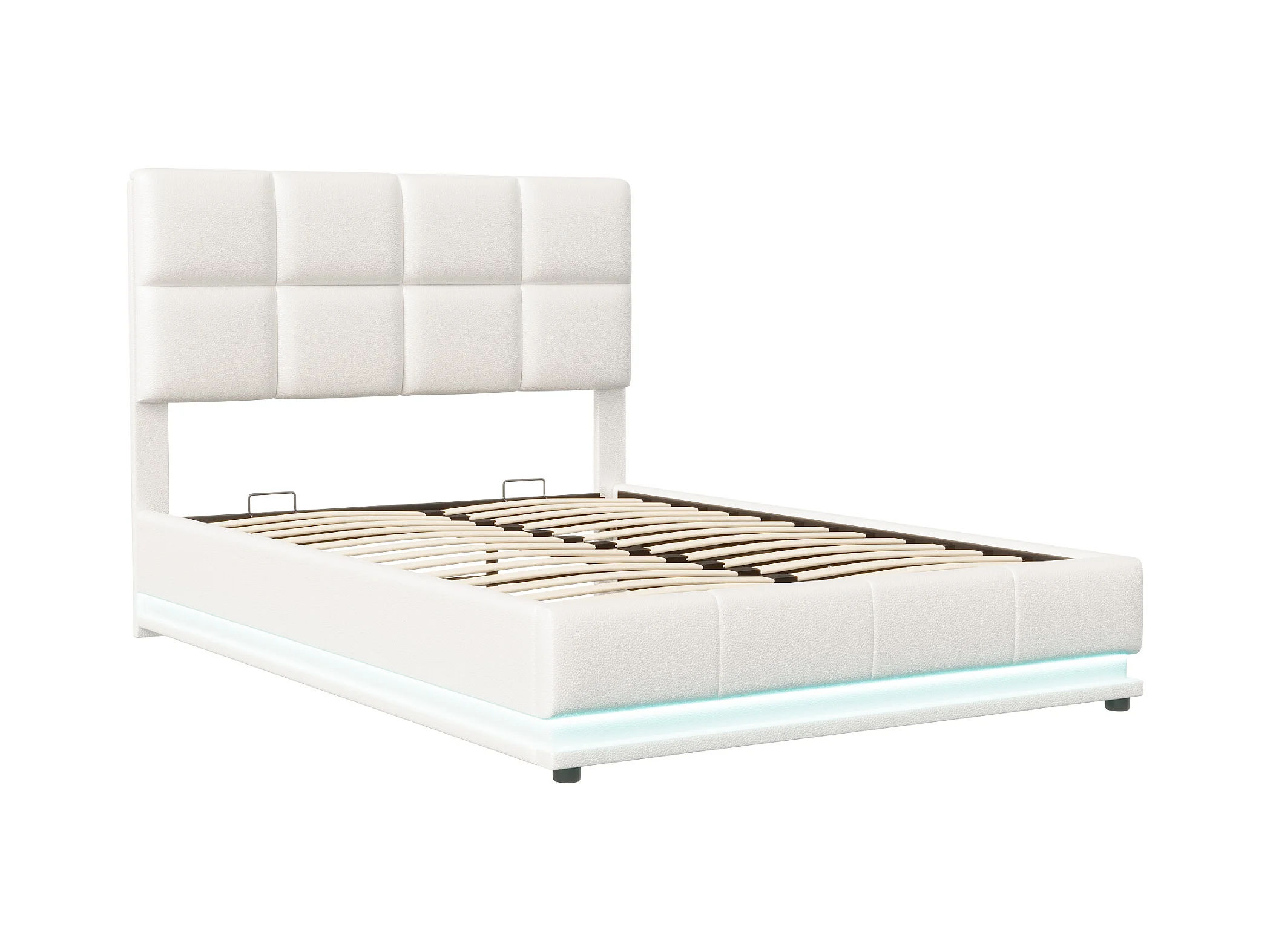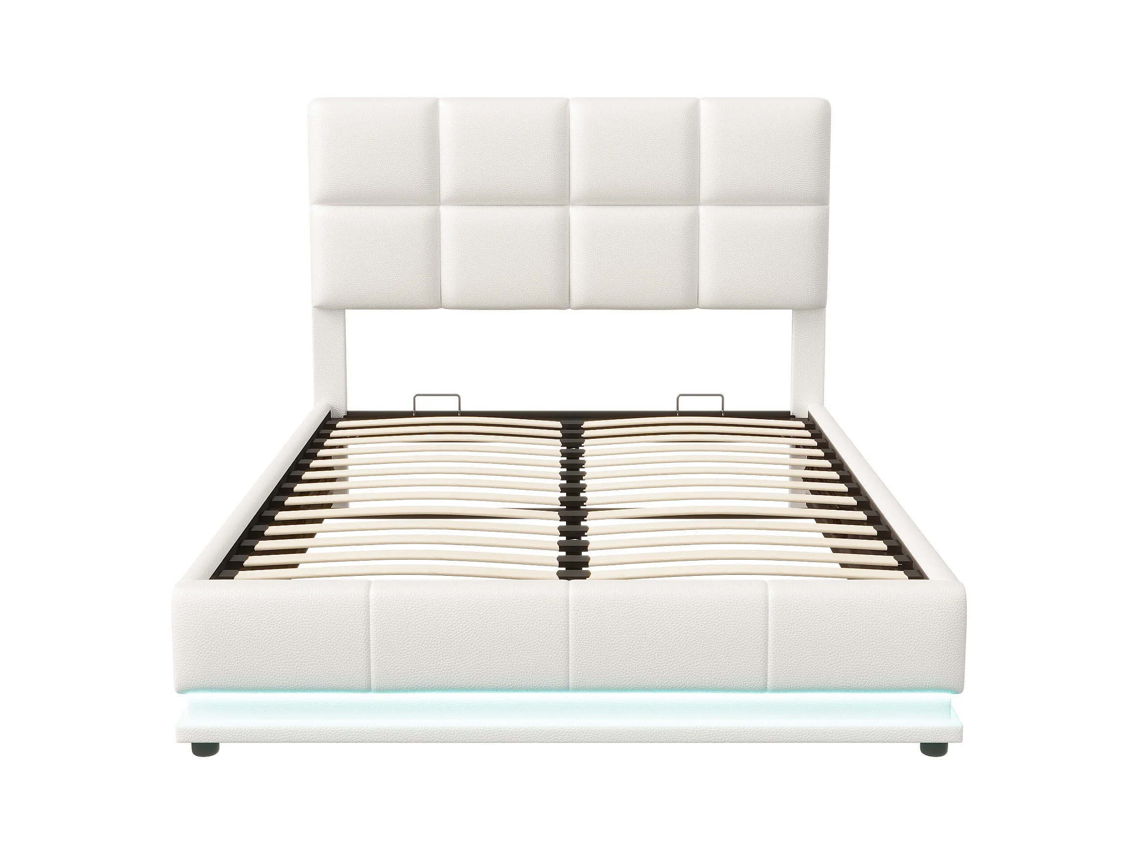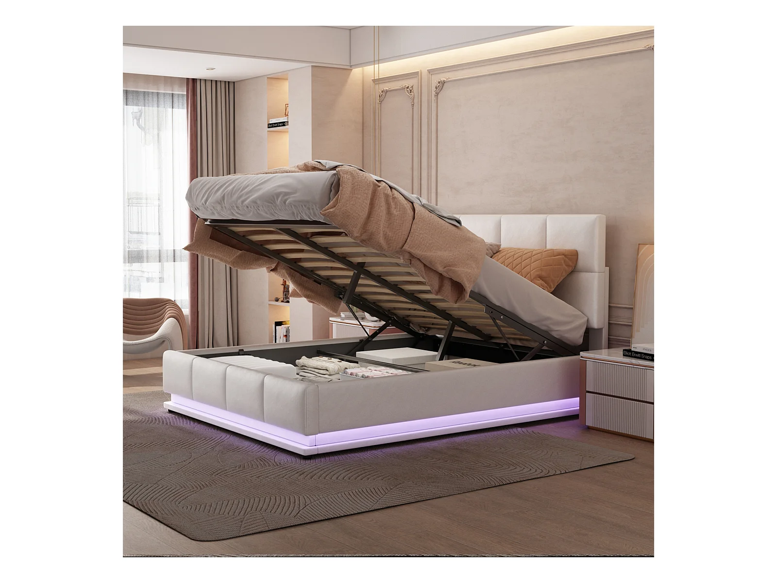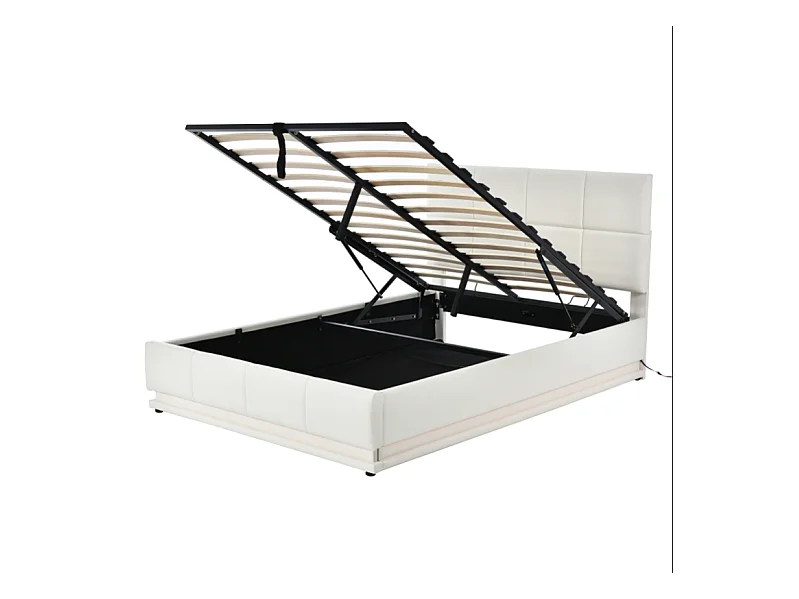 Lit coffre 140x190 cm, Lit doub LED capitonné relevable hydraulique avec sommier à lattes, Blanc