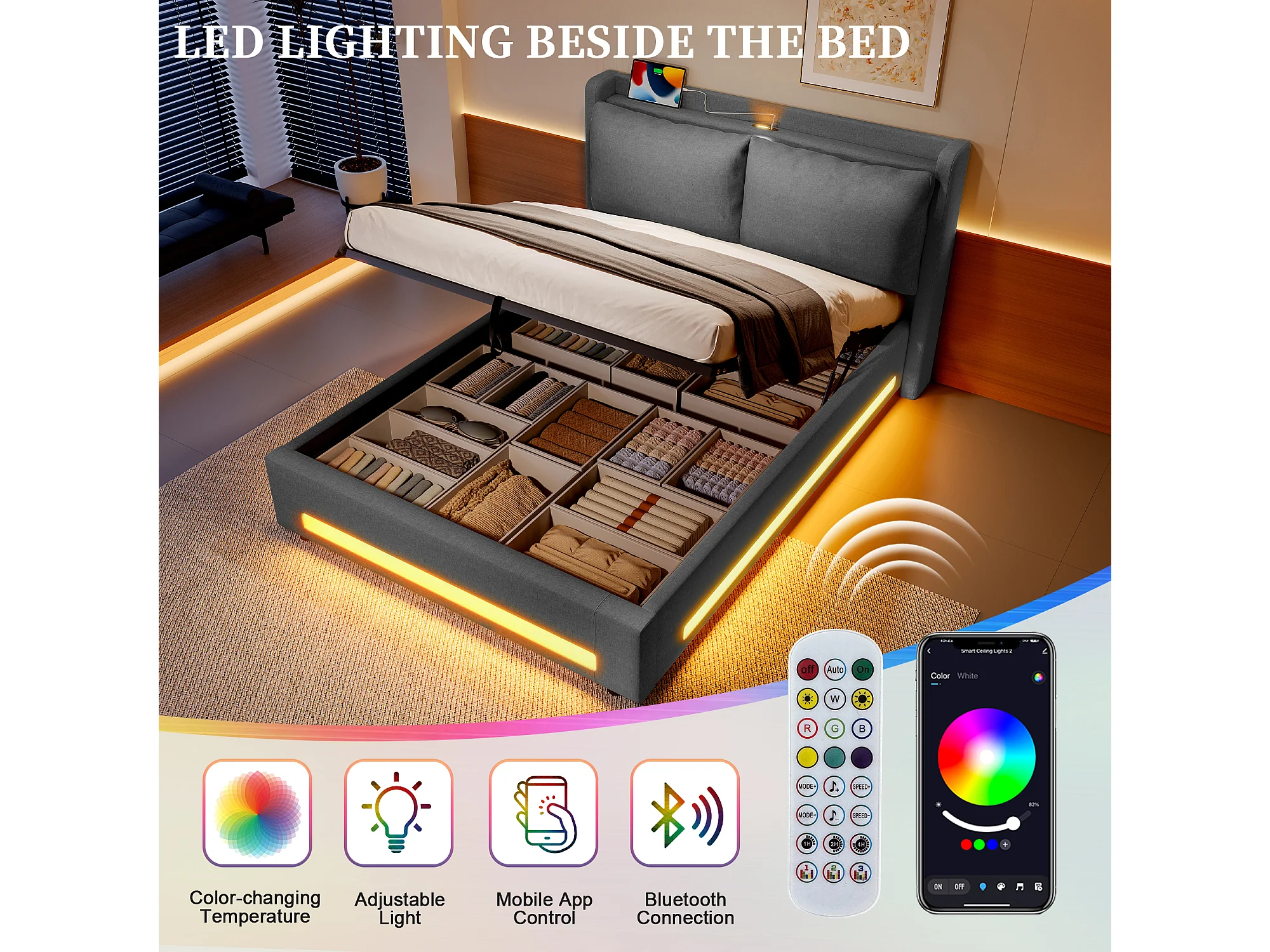 Lit Coffre 140x190 cm - Lit Rembourré - Rangement Hydraulique - Éclairage LED & USB-C - Coussin de Tête Amovible en Velours - Gris - Idéal Chambre