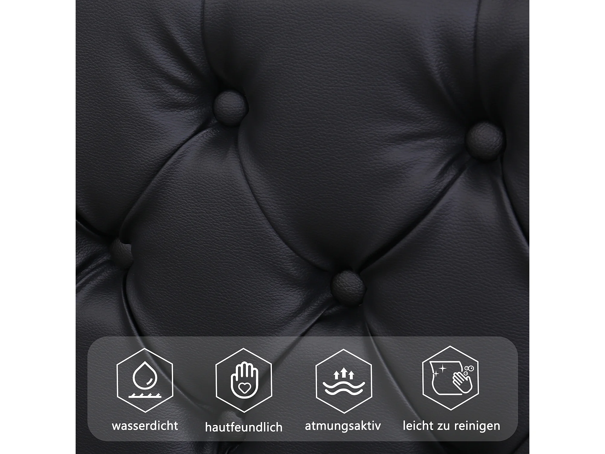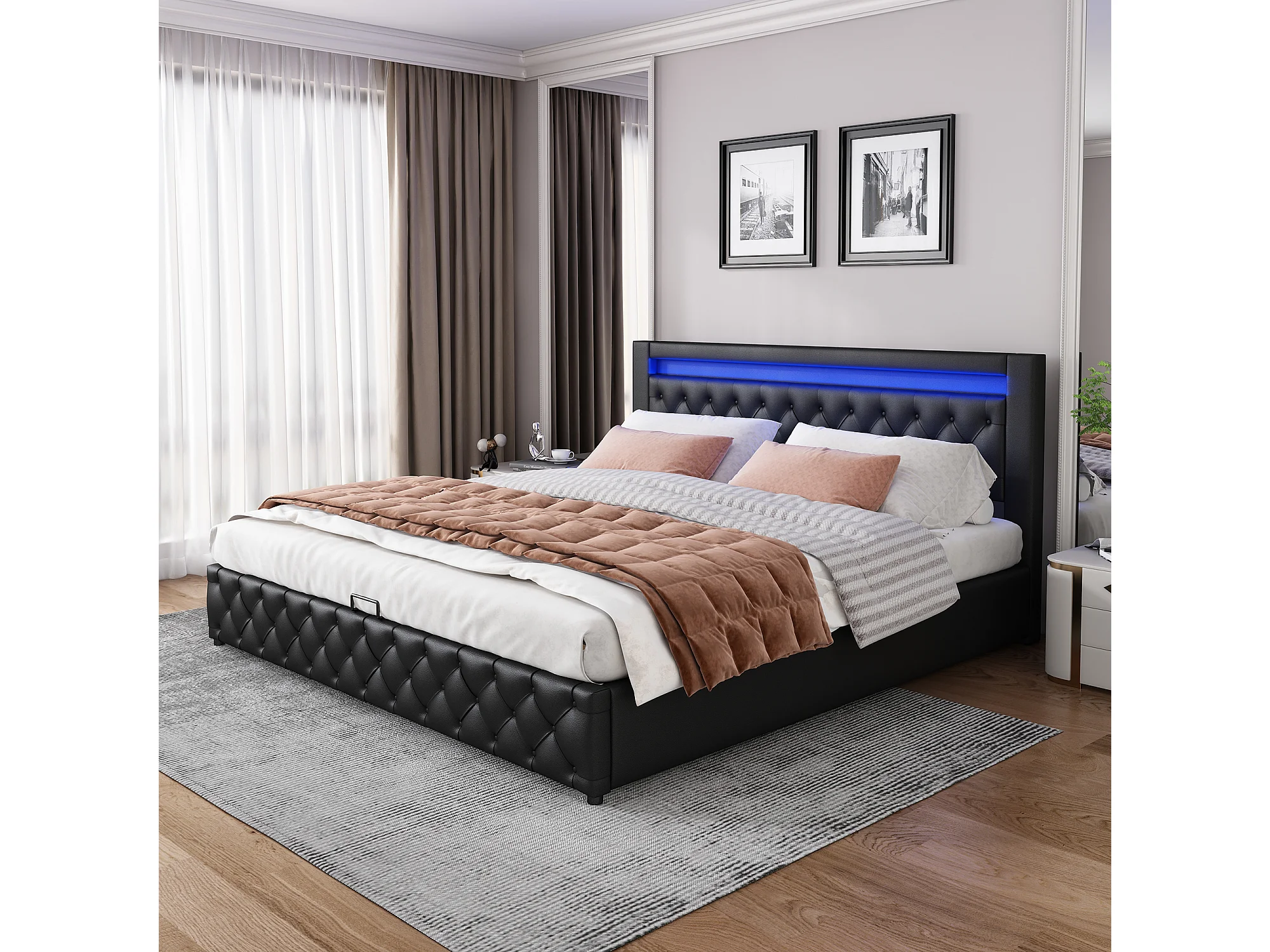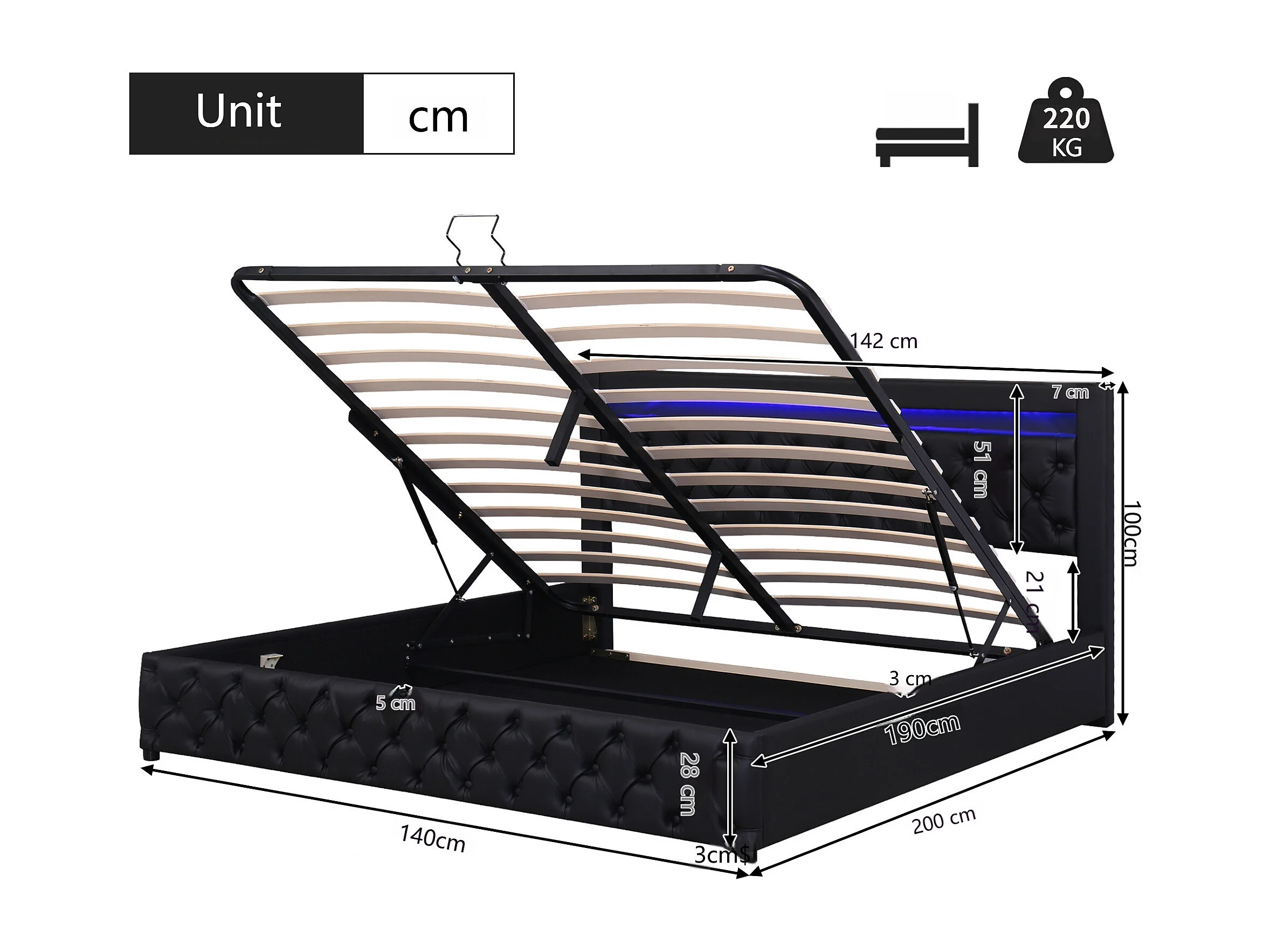 Lit coffre 140x190 cm avec sommier à lattes et rangement hydraulique, éclairage LED, revêtement PU, noir (Sans matelas)
