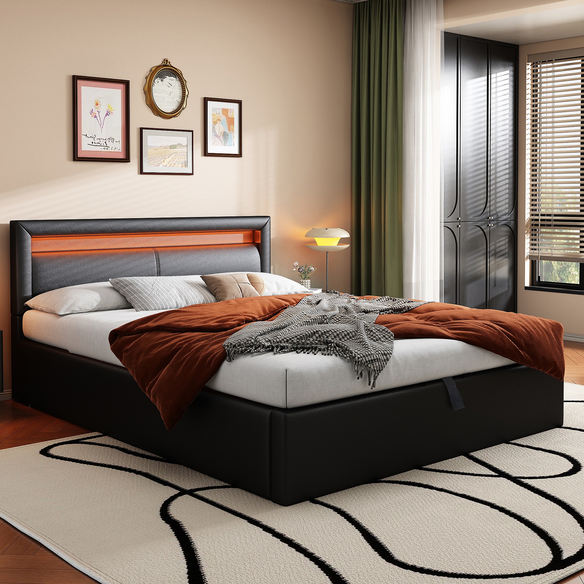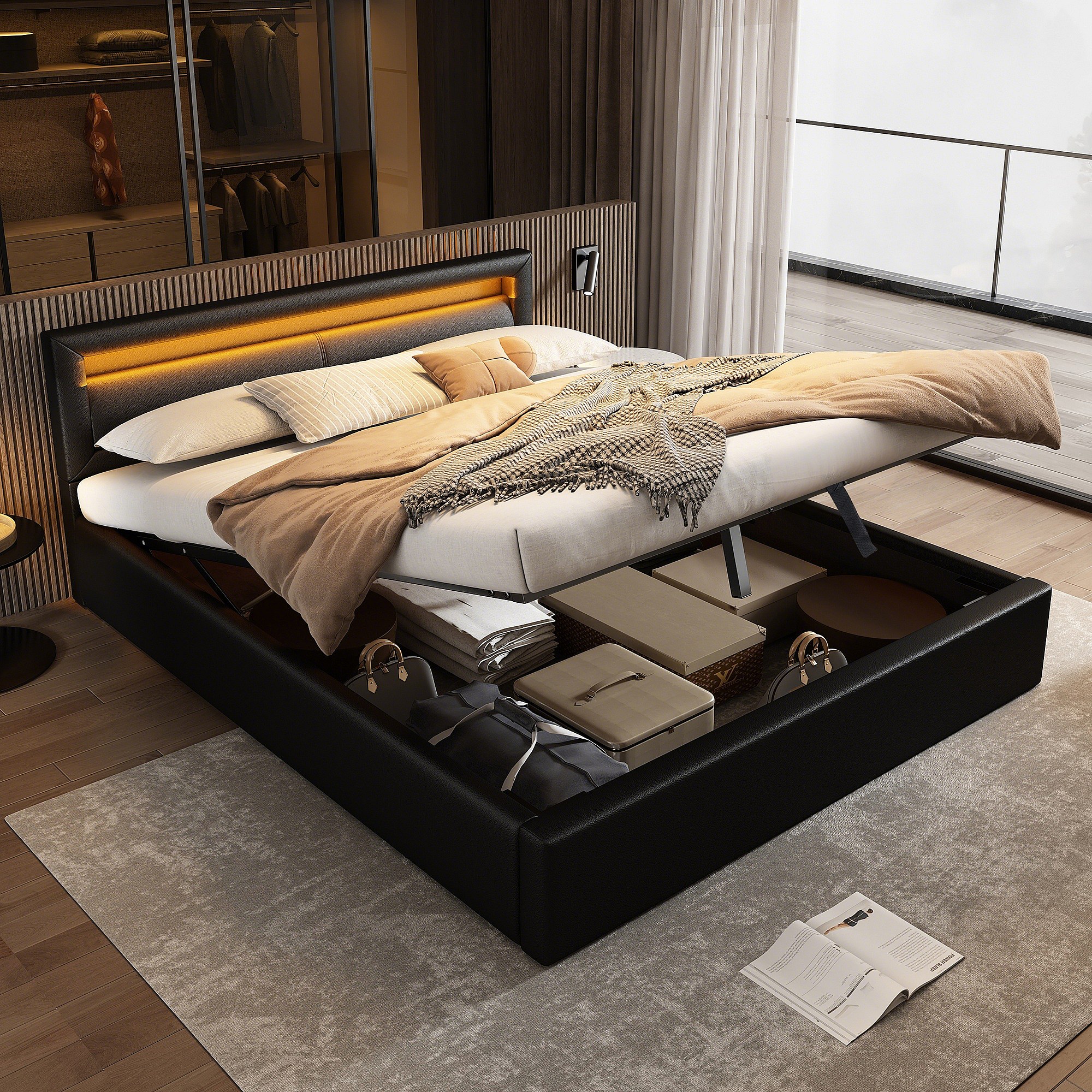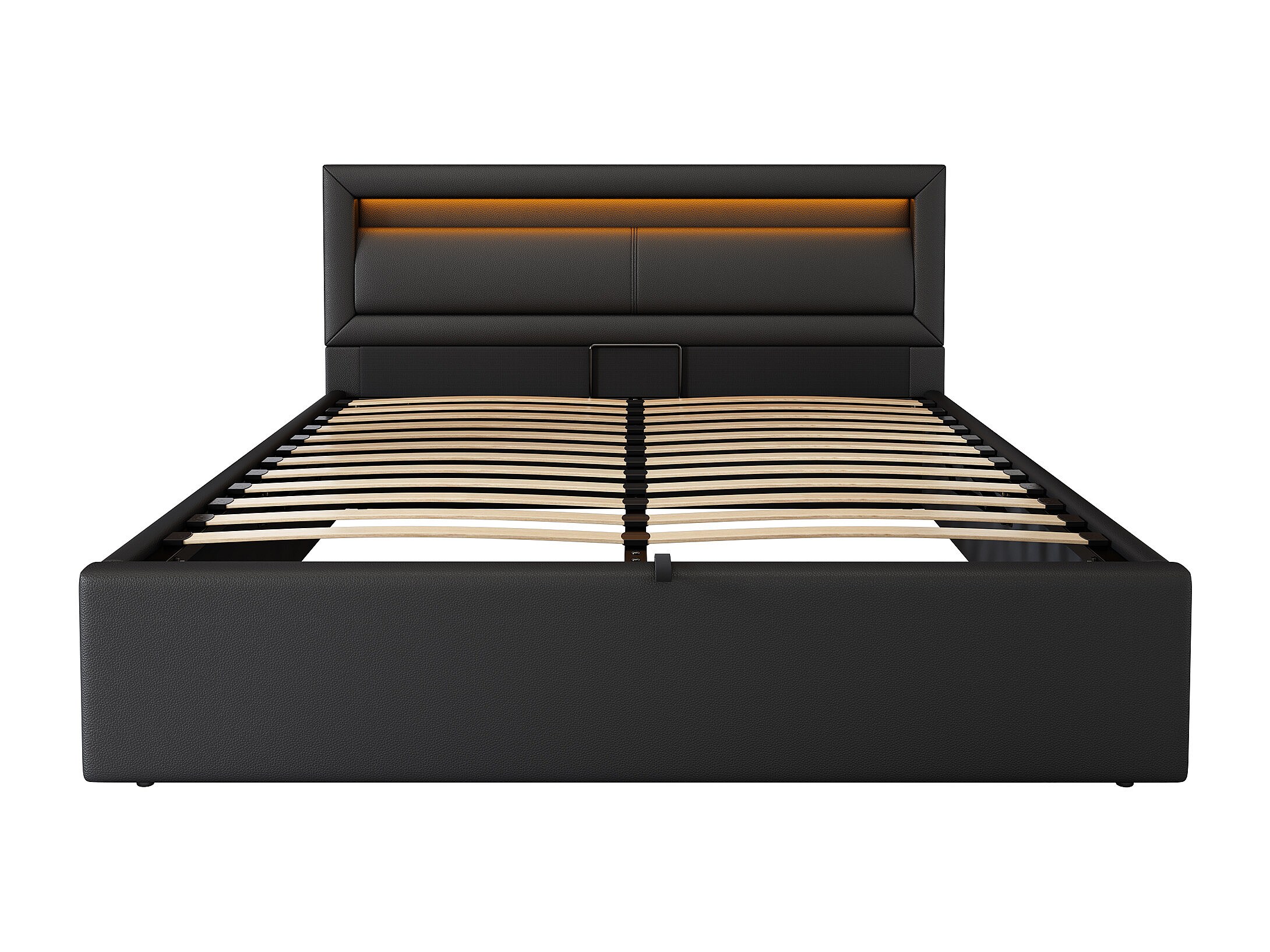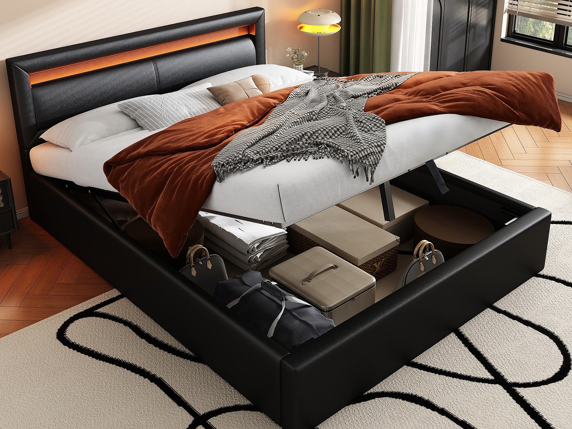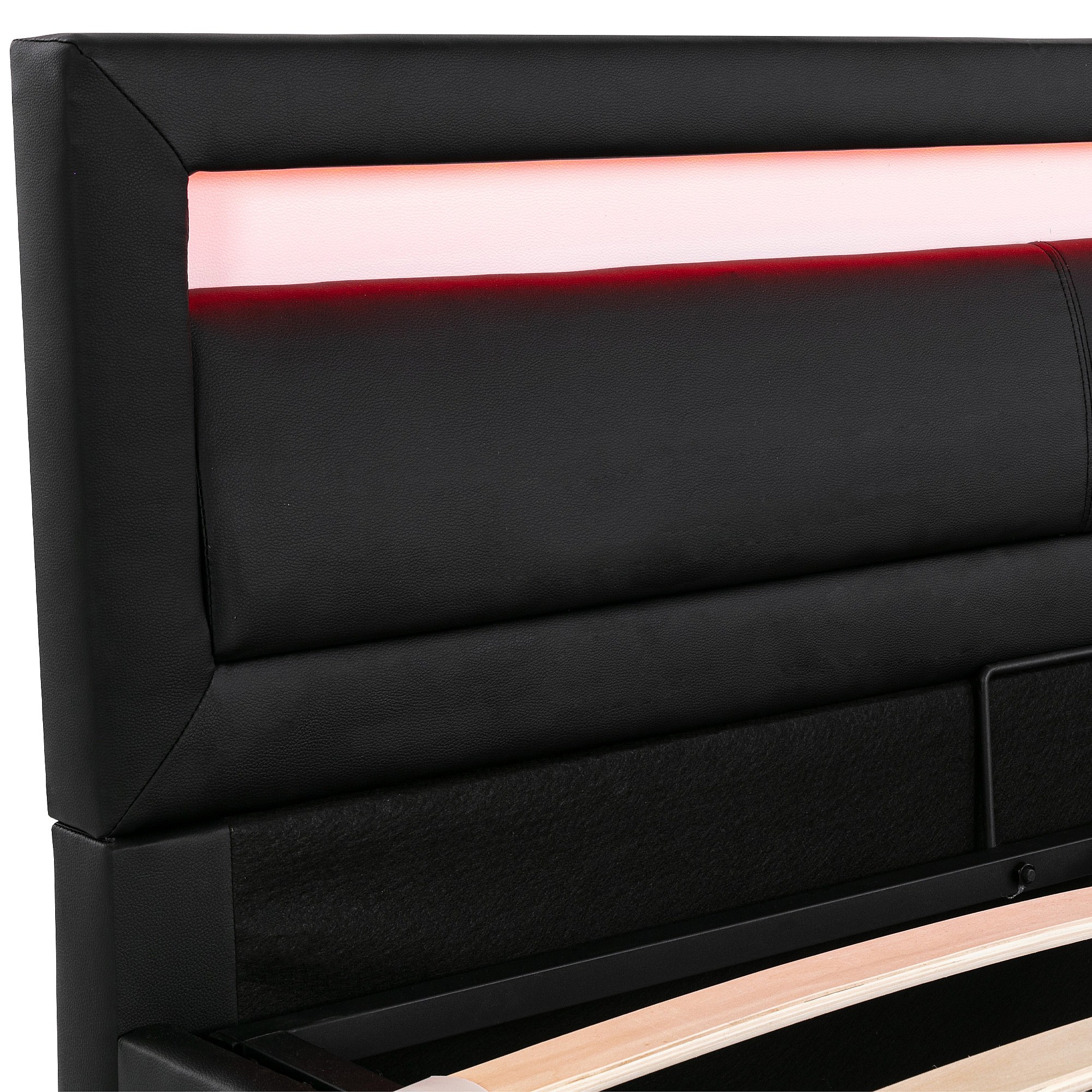 Lit coffre 140x190cm - avec LED - en similicuir - avec sommier à lattes - Noir
