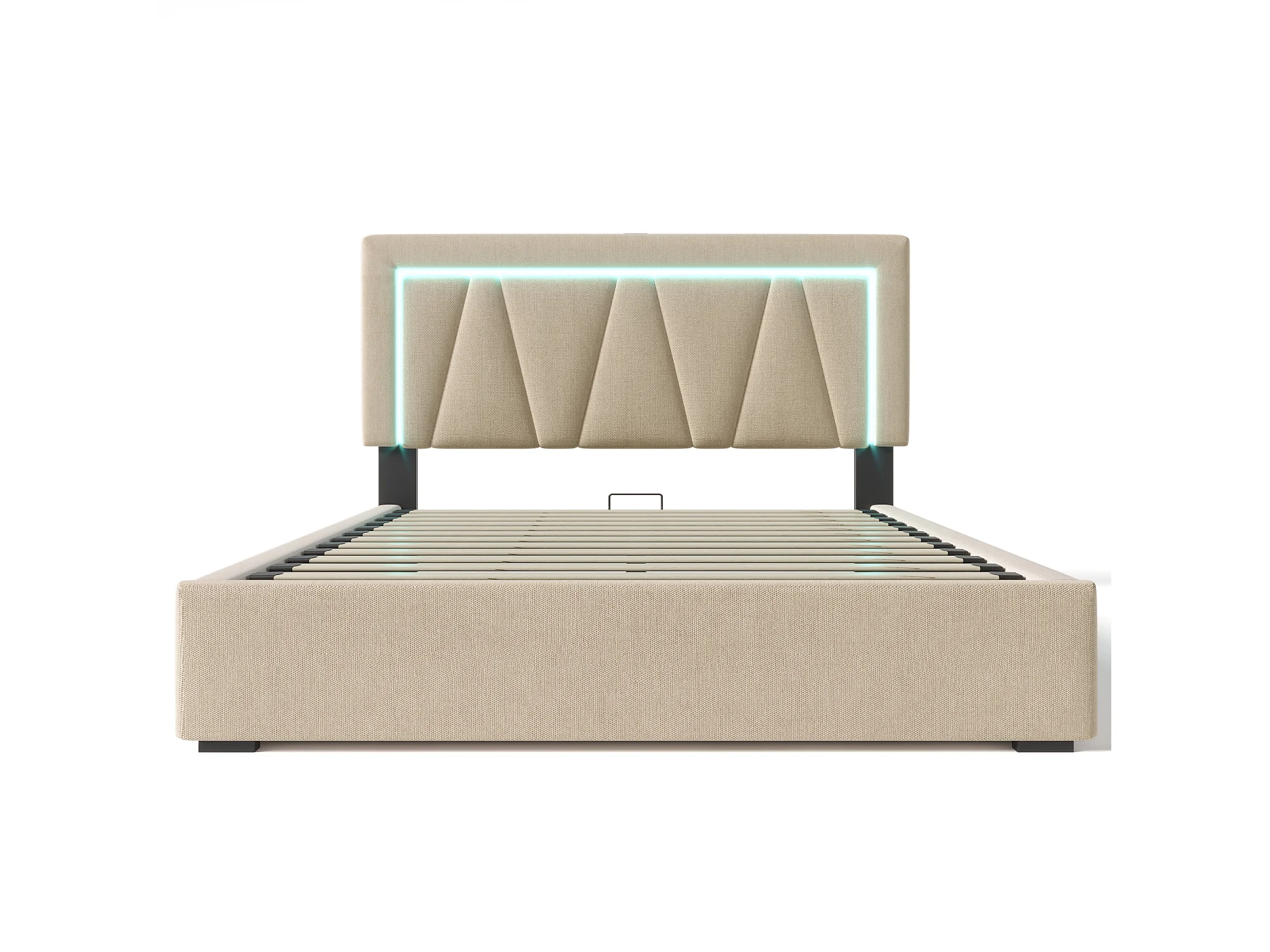 lit coffre 140x200 - avec tête de lit avec rangement, USB/Type-C, LED - en lin et métal - beige - matelas inclus