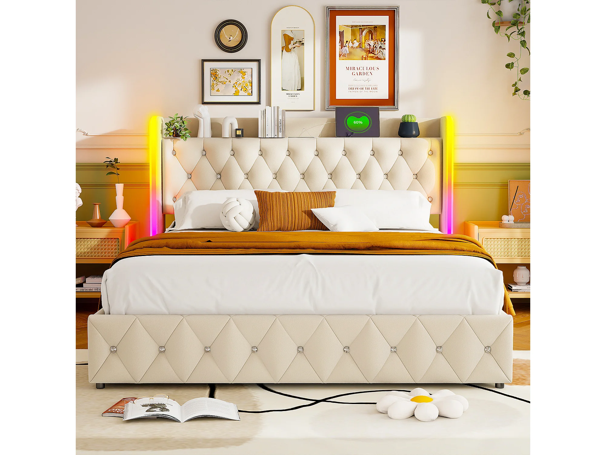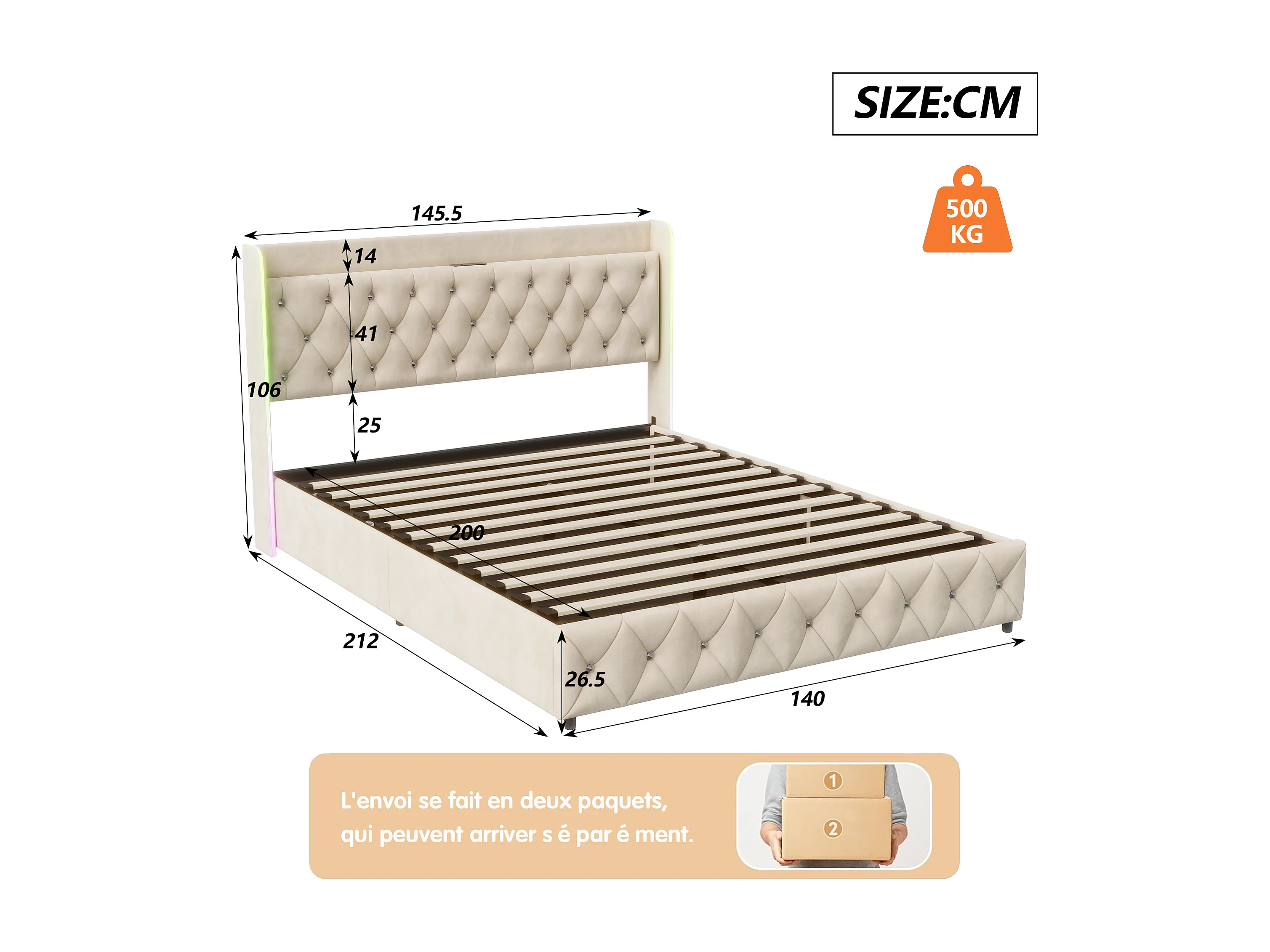 Lit coffre 140x200 cm avec LED RGB – Tissu velours beige – Sommier relevable – Rangement intégré