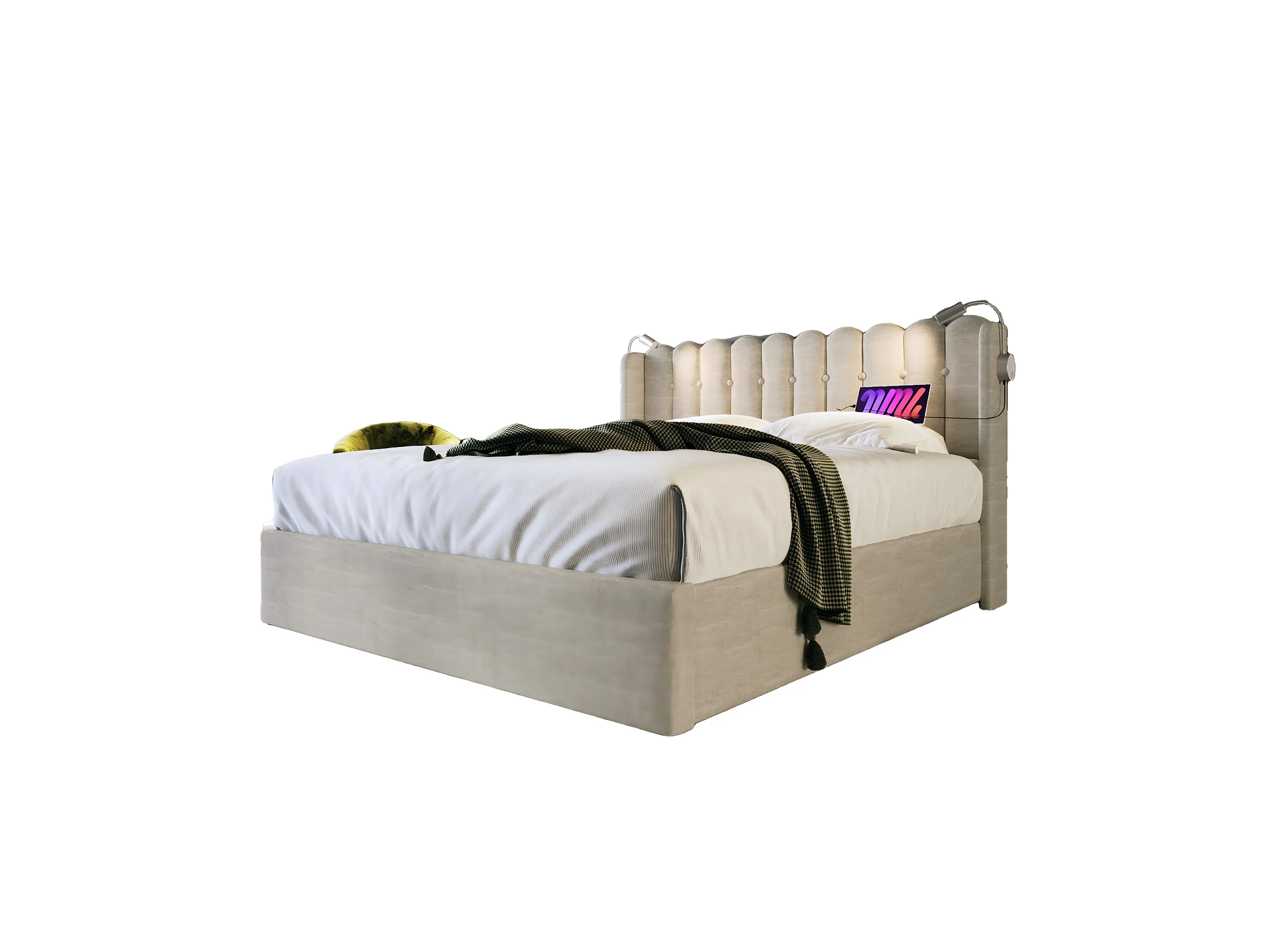 Lit coffre 140x200 cm - avec tête de lit, USB, sommier à lattes - en lin - beige - matelas inclus