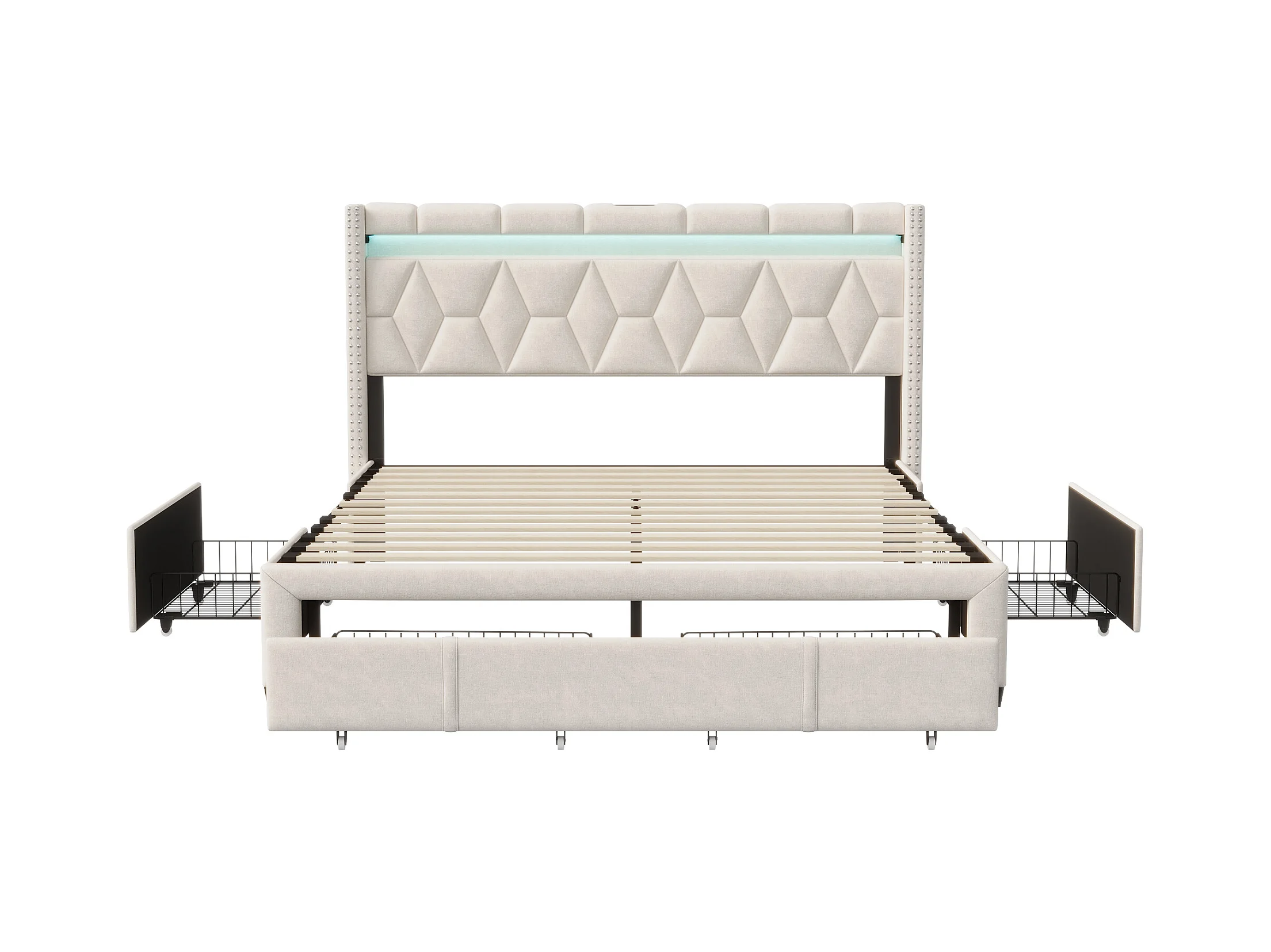 Lit coffre 140x200 cm beige en lin, 4 tiroirs, LED, USB & Type-C, sommier à lattes, tête de lit capitonnée – lit double pratique et moderne