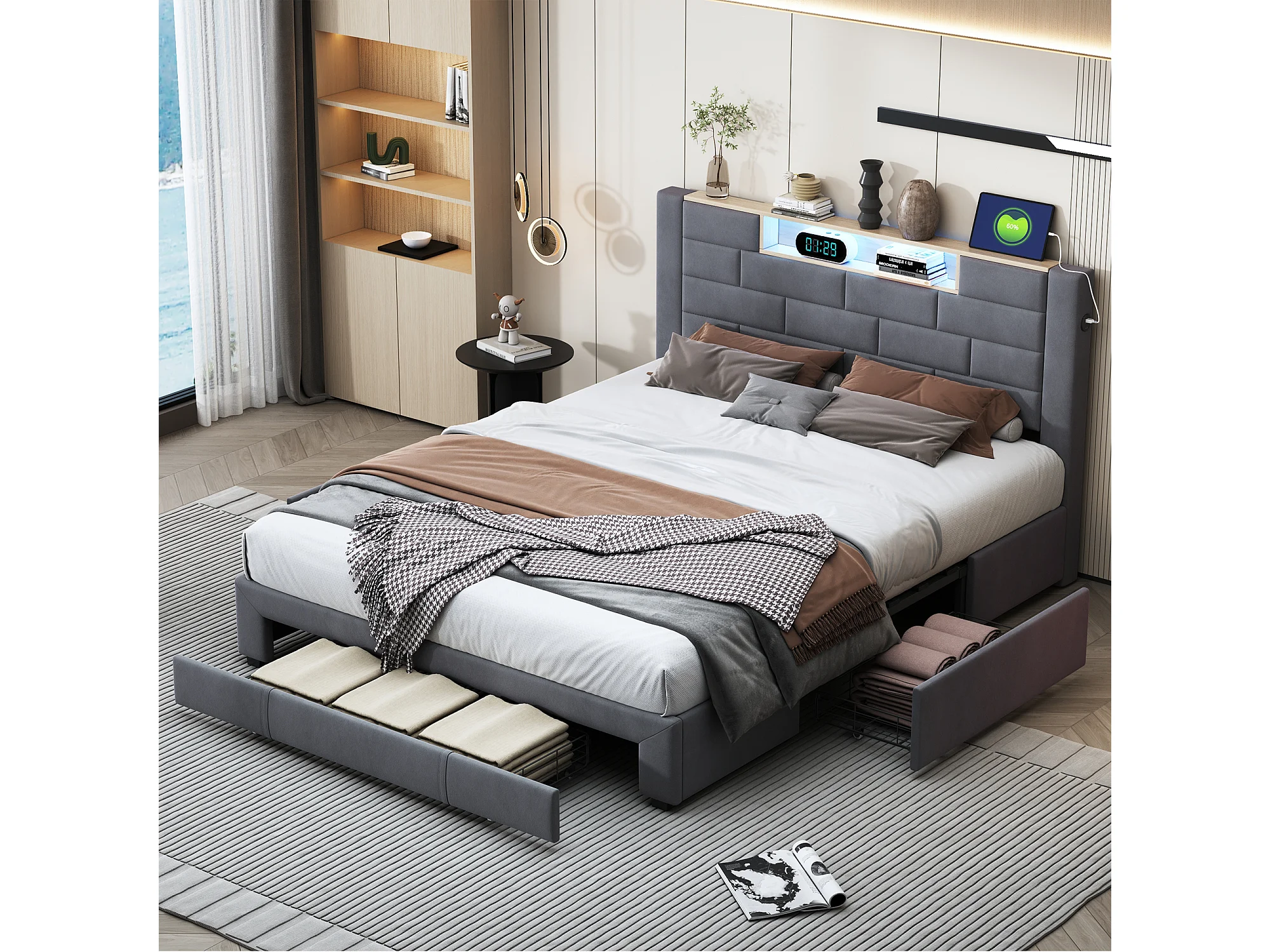 Lit double 140x200 cm en tissu aspect lin gris avec 2 tiroirs, tête de lit avec poches latérales, rangements intégrés et éclairage LED d’ambiance