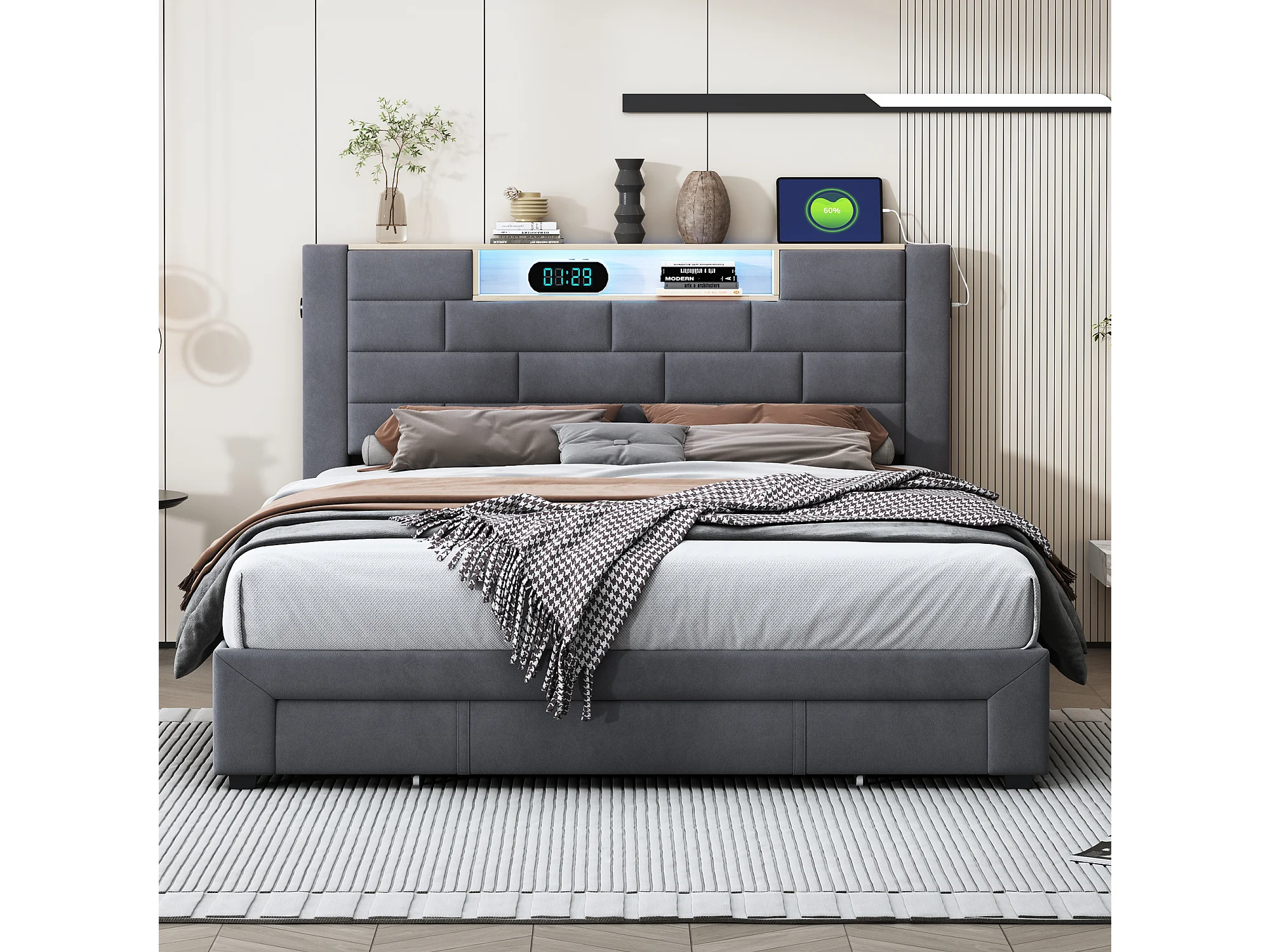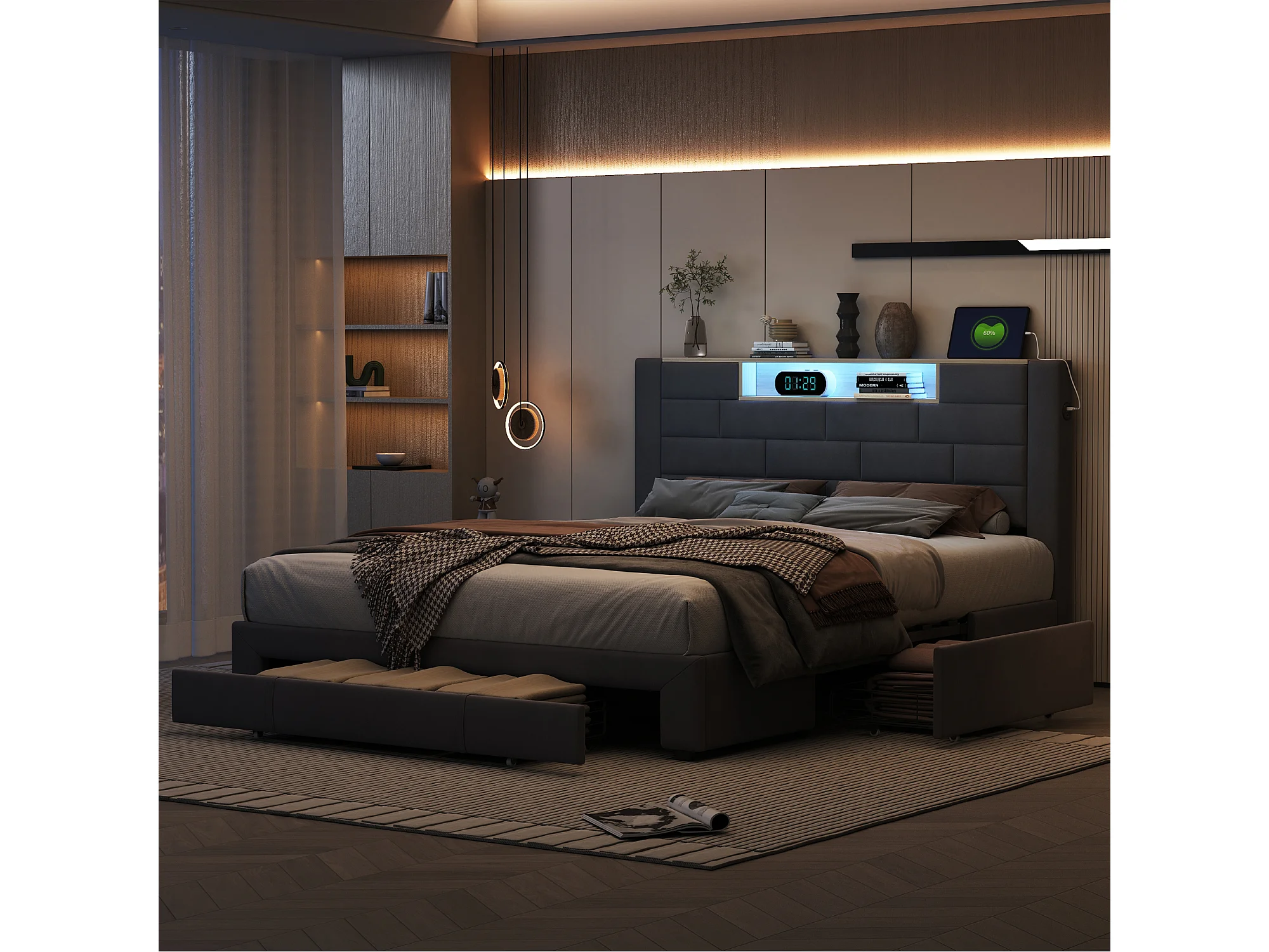 Lit double 140x200 cm avec tête de lit ergonomique inclinée, rangements cachés, ports USB/Type-C et 4 tiroirs gain de place