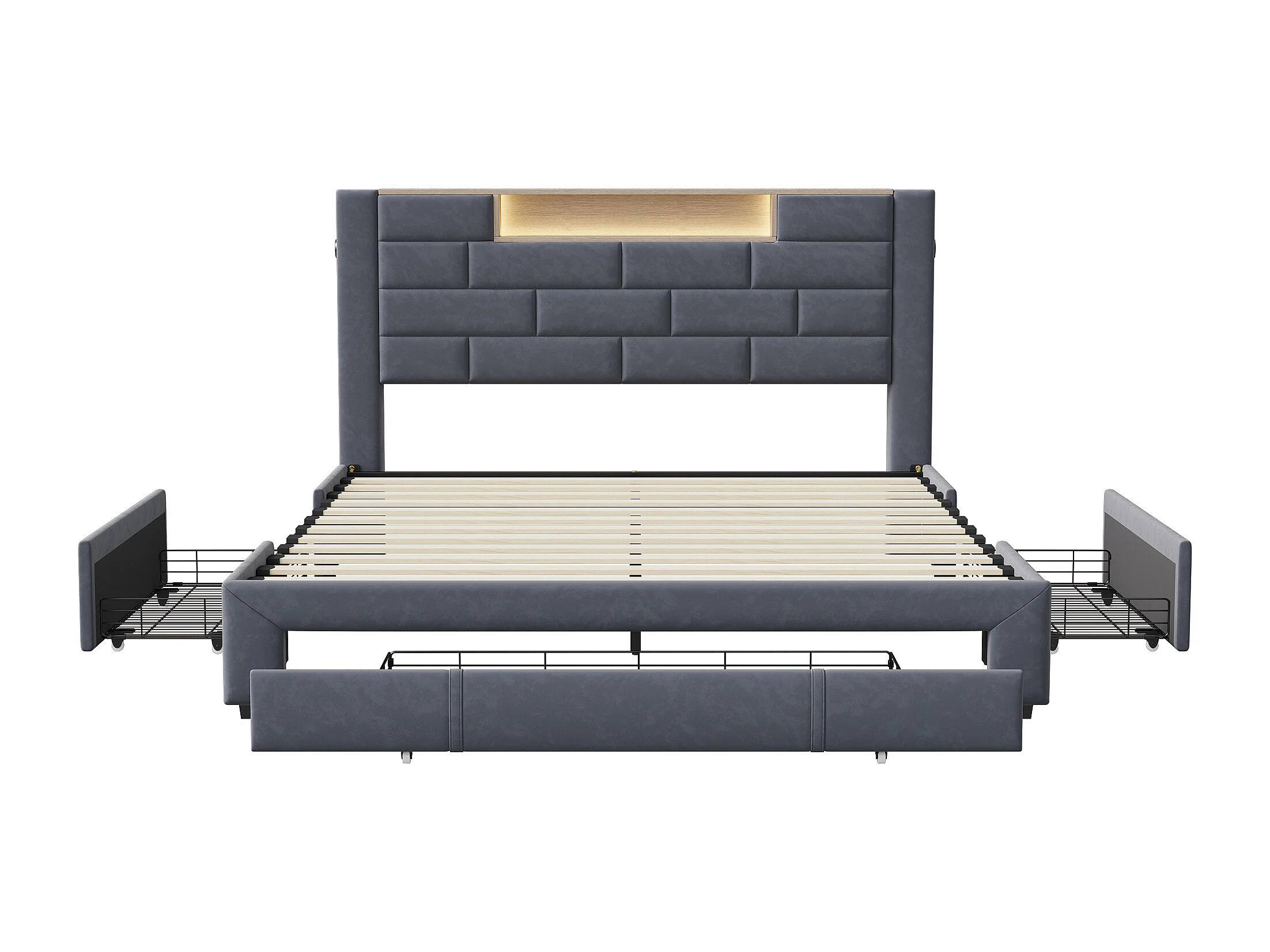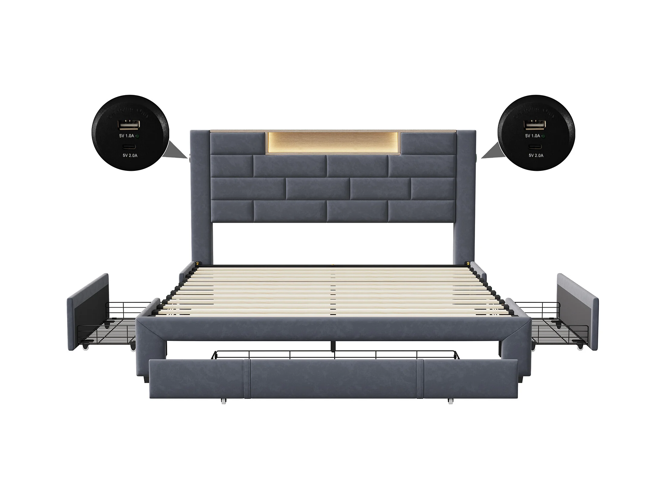 Lit 140x200 cm avec tête de lit losange, éclairage LED et ports USB, 4 tiroirs en métal, revêtement en lin gris, design moderne et pratique