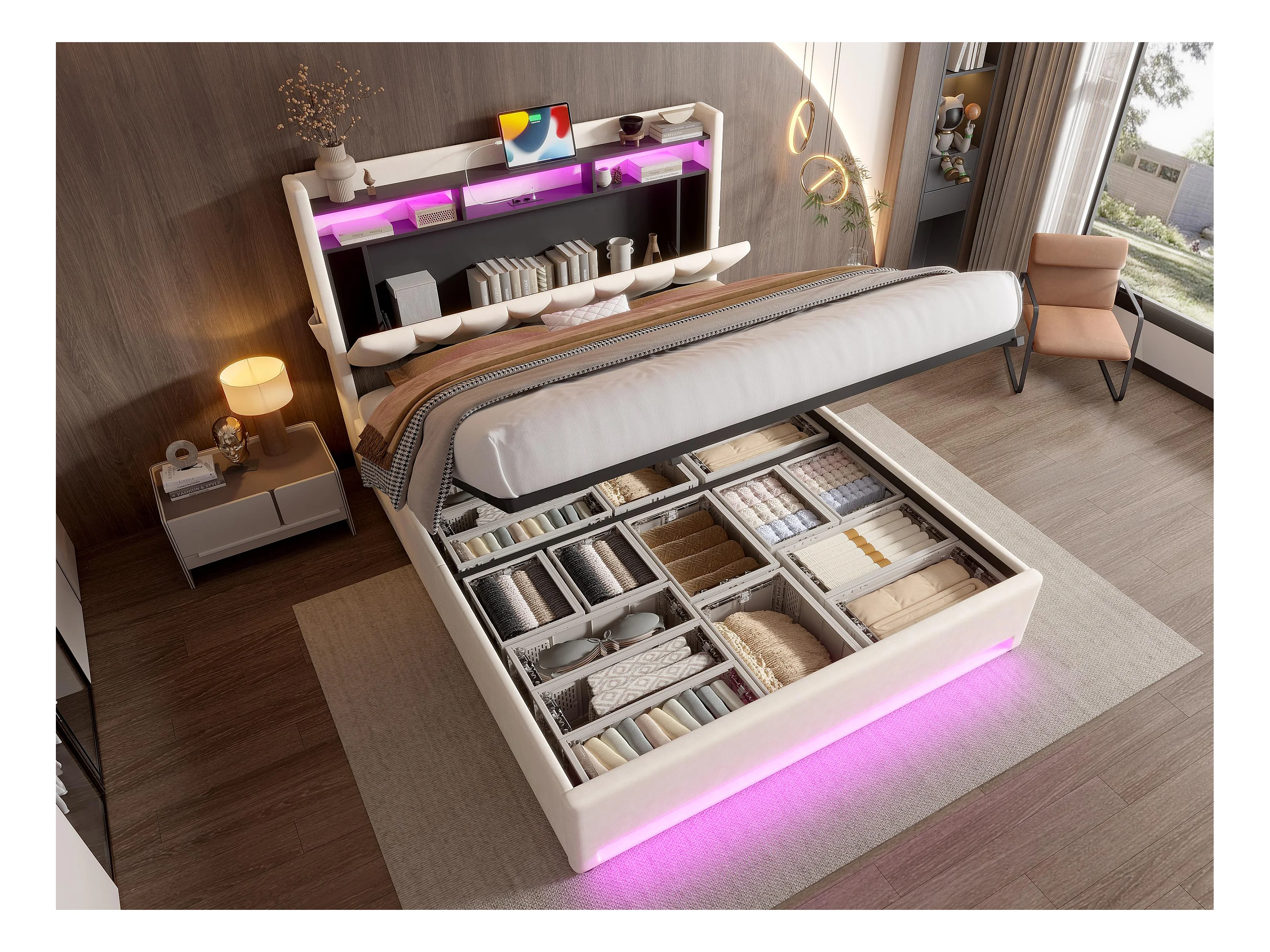 Lit Coffre 140×200 cm - Lit Rembourré en Velours Beige – Étagère Tête De Lit - LED/USB-C – Coffre Hydraulique – Style Contemporain
