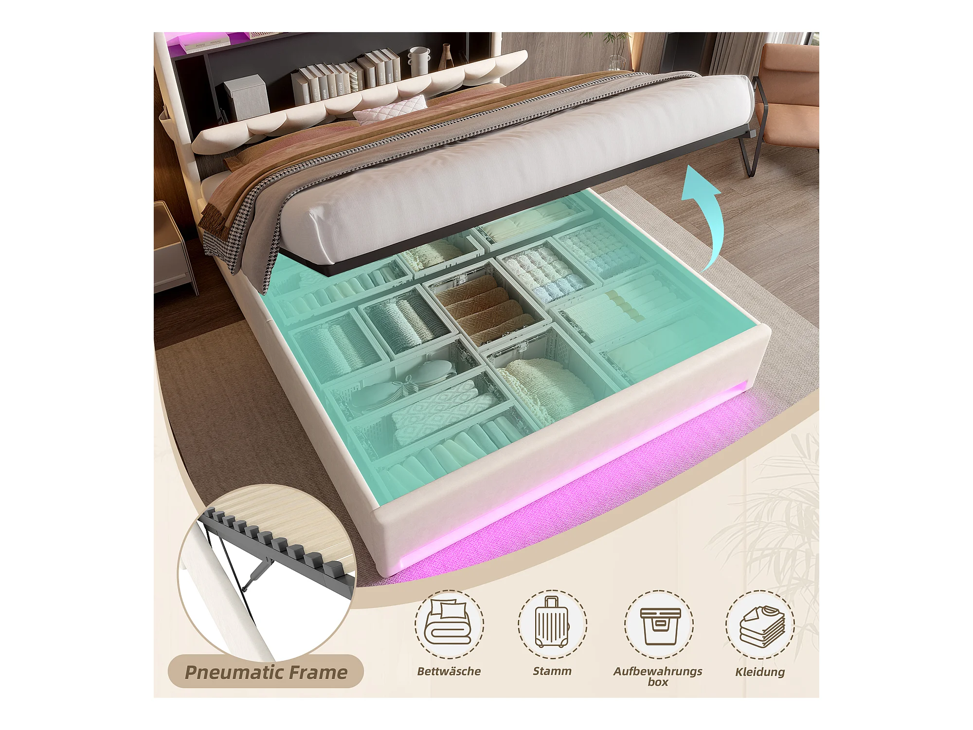 Lit Coffre 140×200 cm Velours Beige – Éclairage LED Multicolore - Ports USB+Type‑C - Rangement Sous Sommier – Style Contemporain