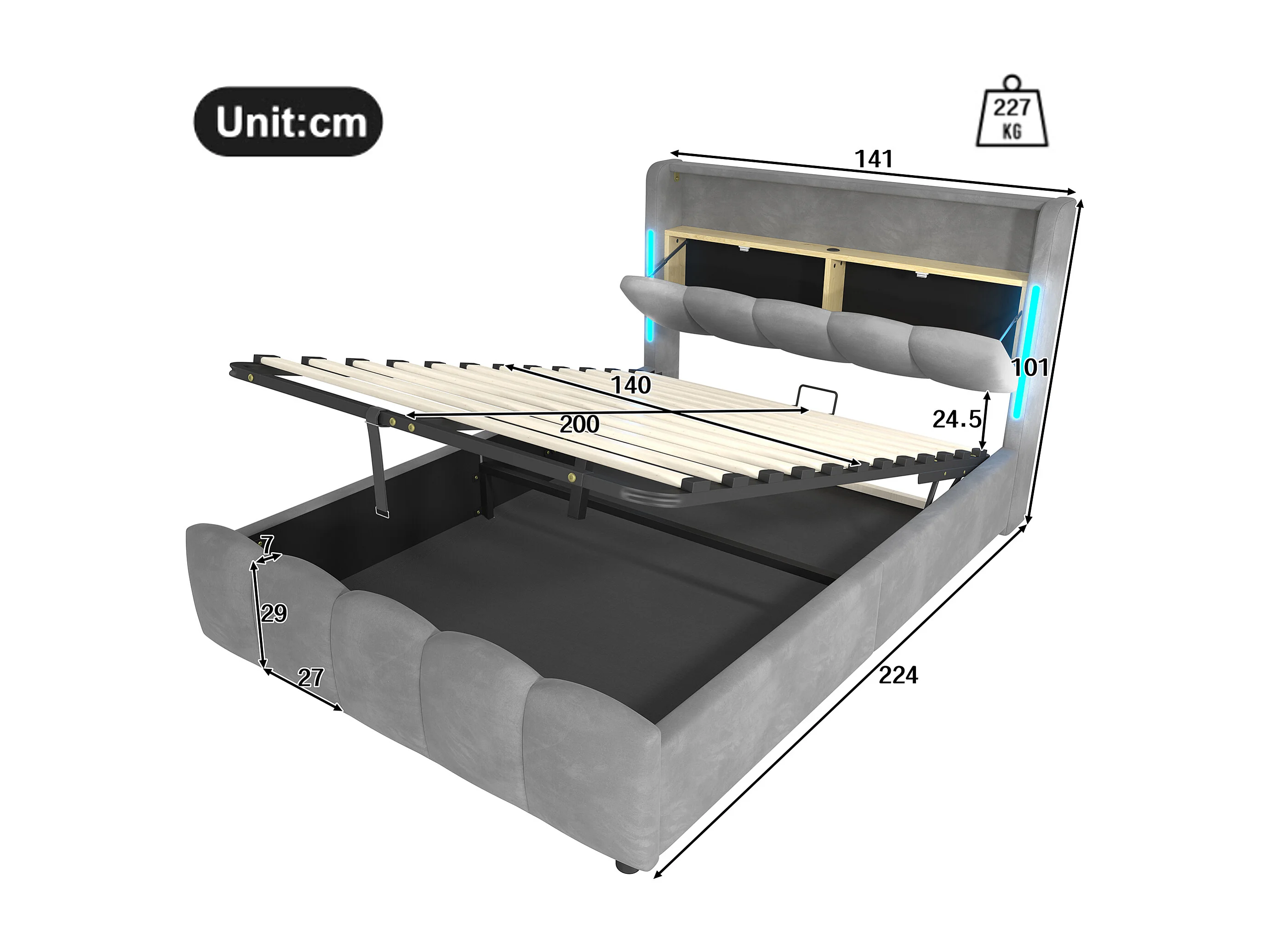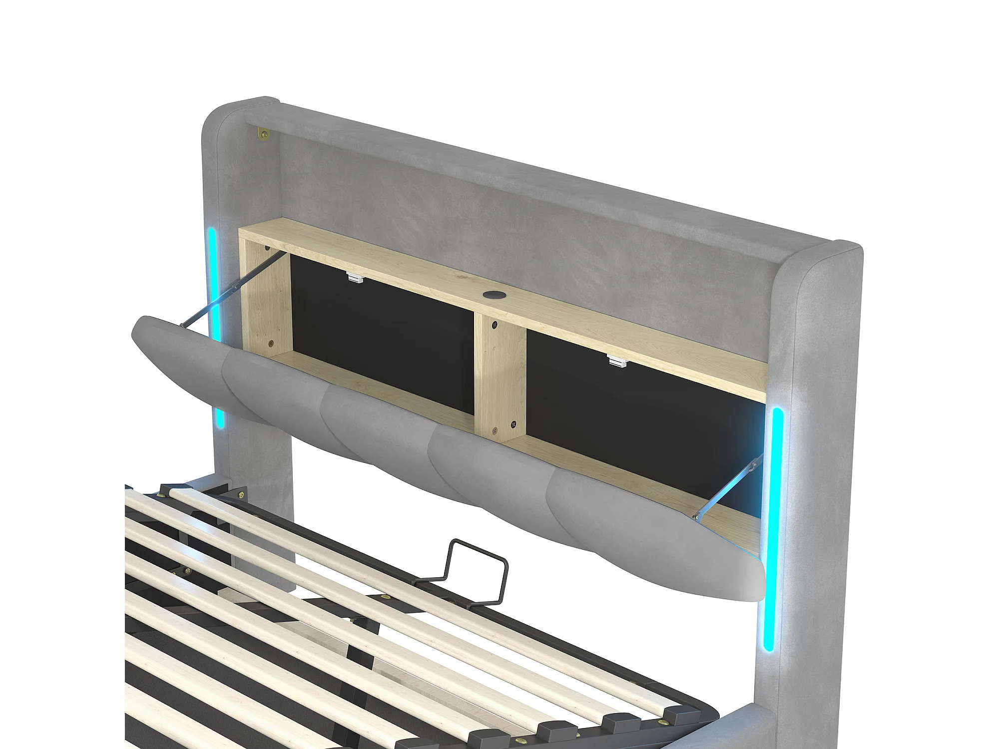 Lit coffre 140x200 cm, lit adulte avec LED et ports USB, tête de lit coffre - velours gris (sans matelas)