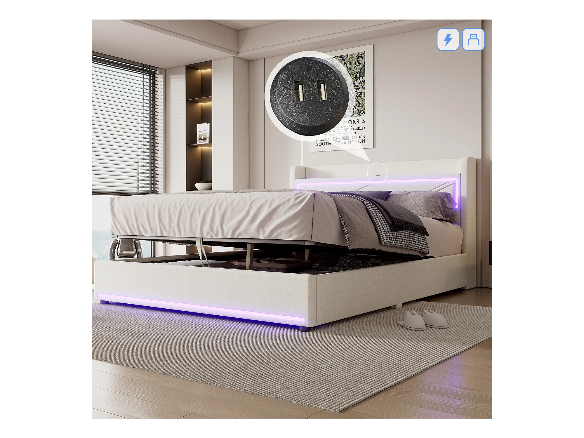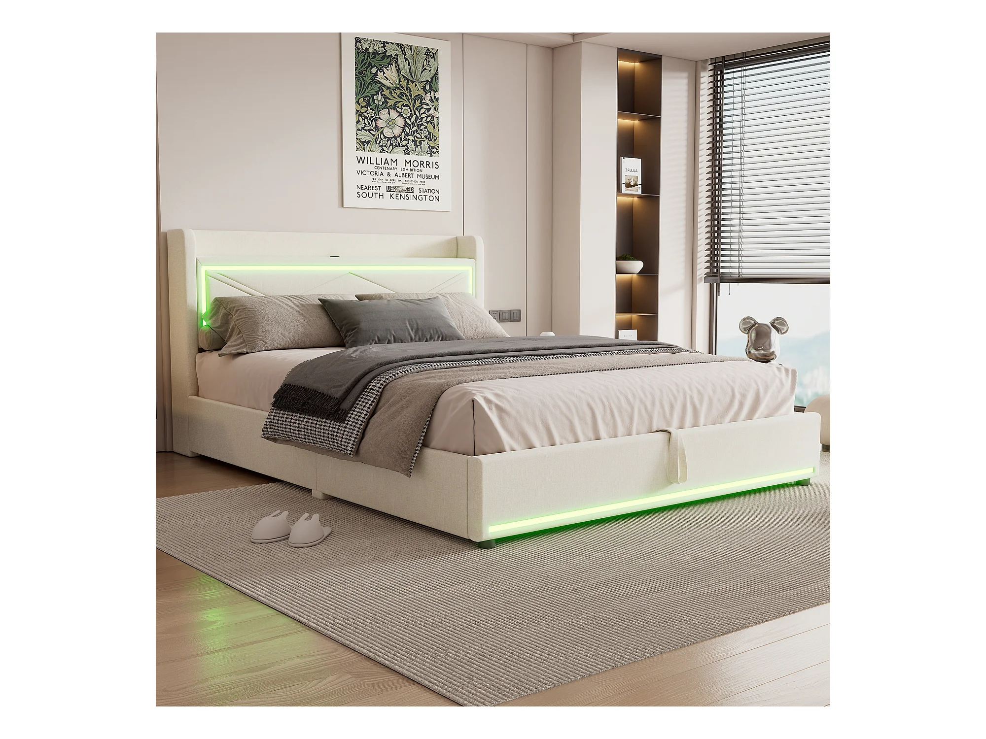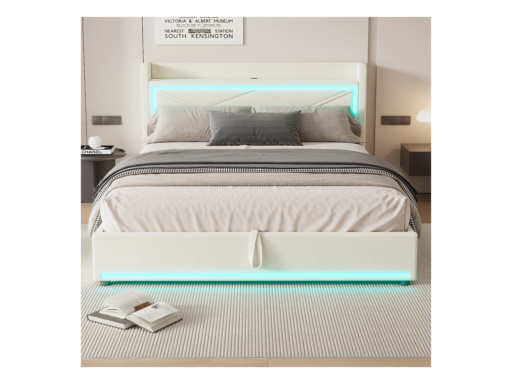 Lit coffre 160 x 200 cm avec tête de lit - LEDs et port USB - Tissu en lin - Style contemporain - Beige