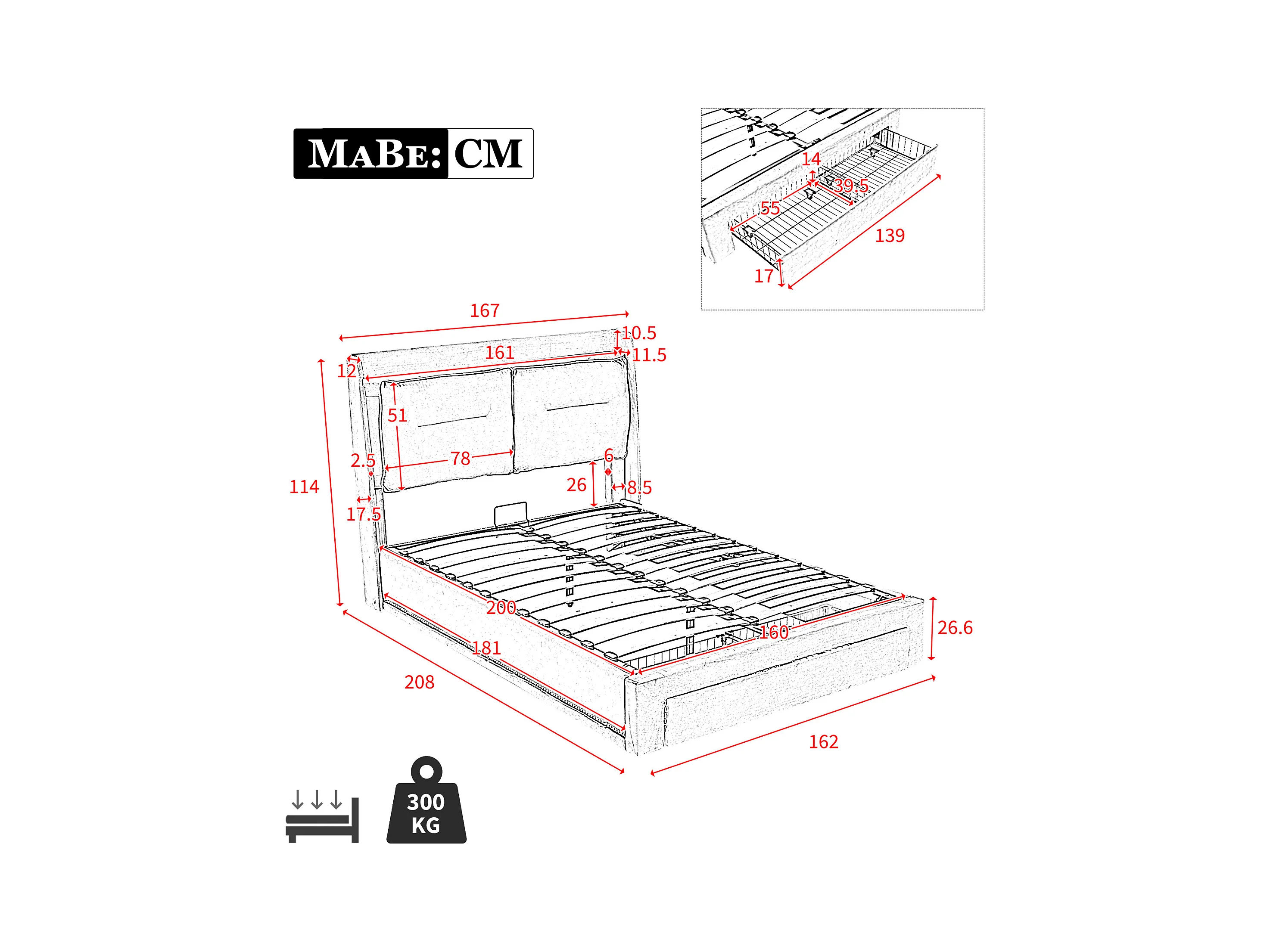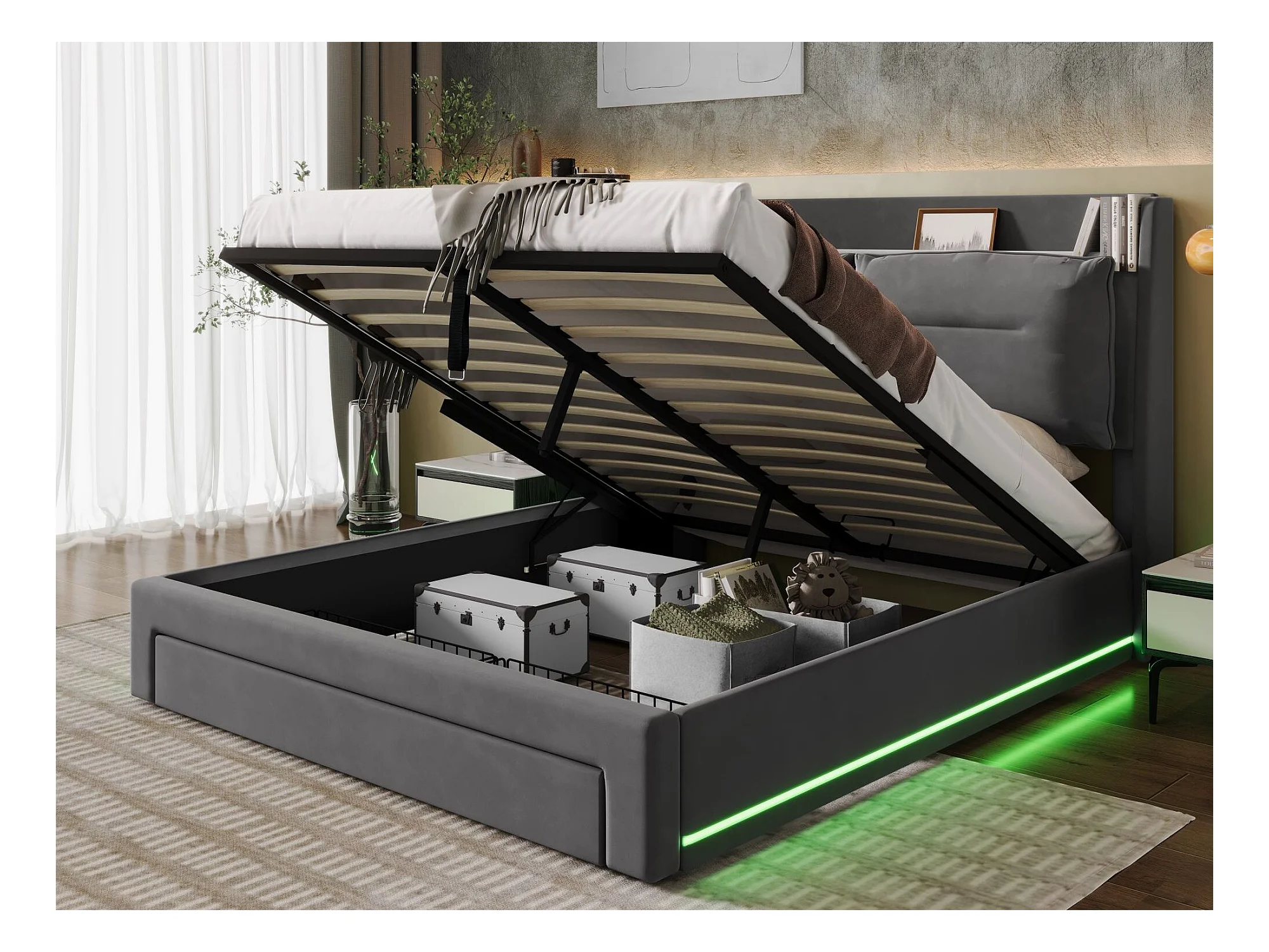 Lit coffre 160 x 200 cm avec tiroir et étagère - LEDs - Tissu en velours - Gris