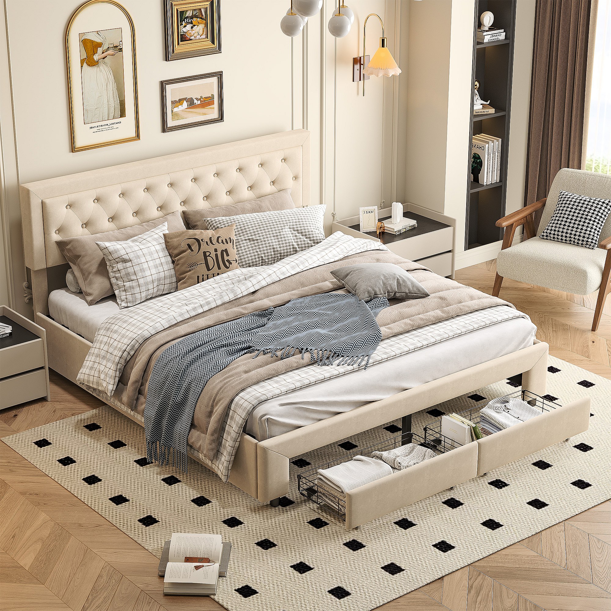 Lit coffre 160x200 avec 2 tiroirs, Lit rembourré avec sommier à lattes, tissu en velours et décoration de boutons, beige