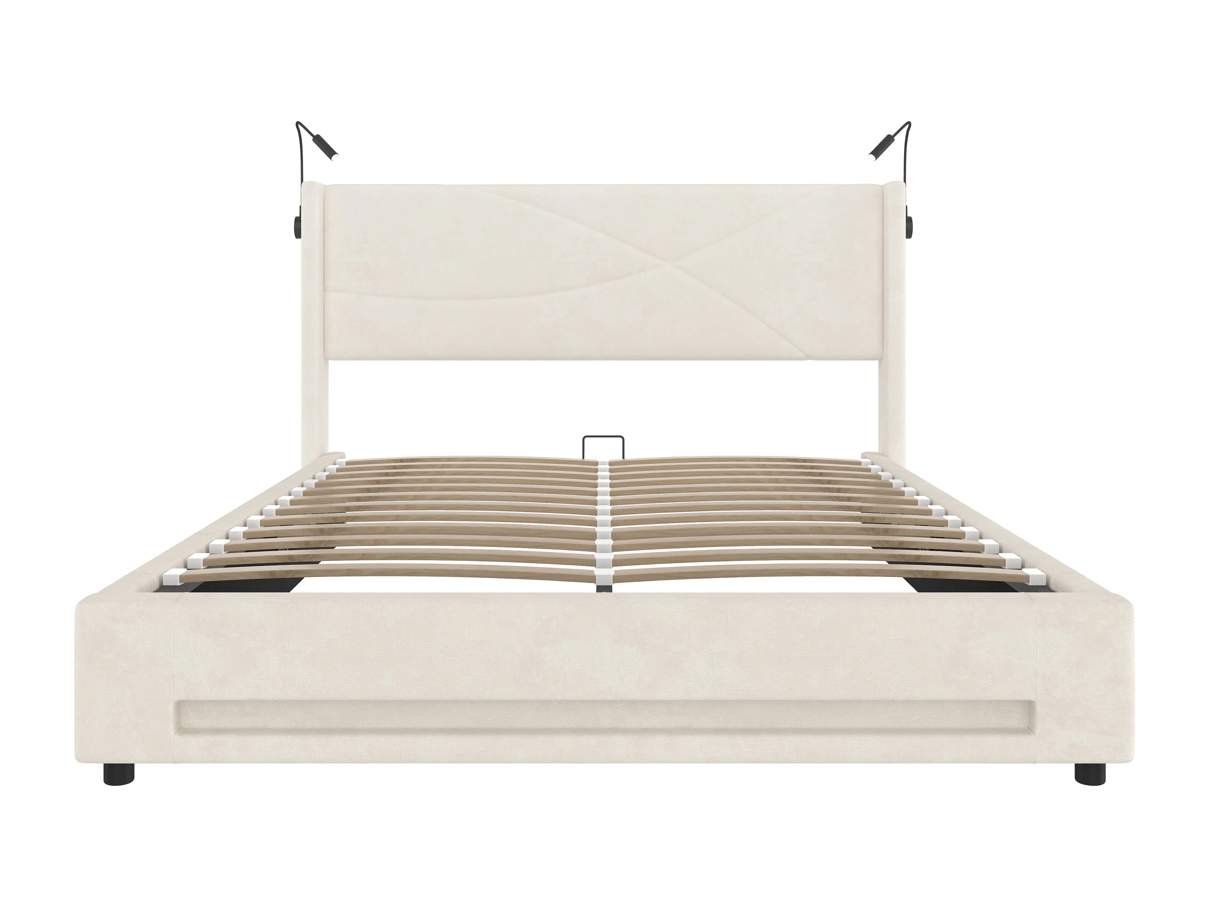 Lit coffre 160x200 cm avec 2 liseuses et éclairage LED, port USB - velours beige - sans matelas
