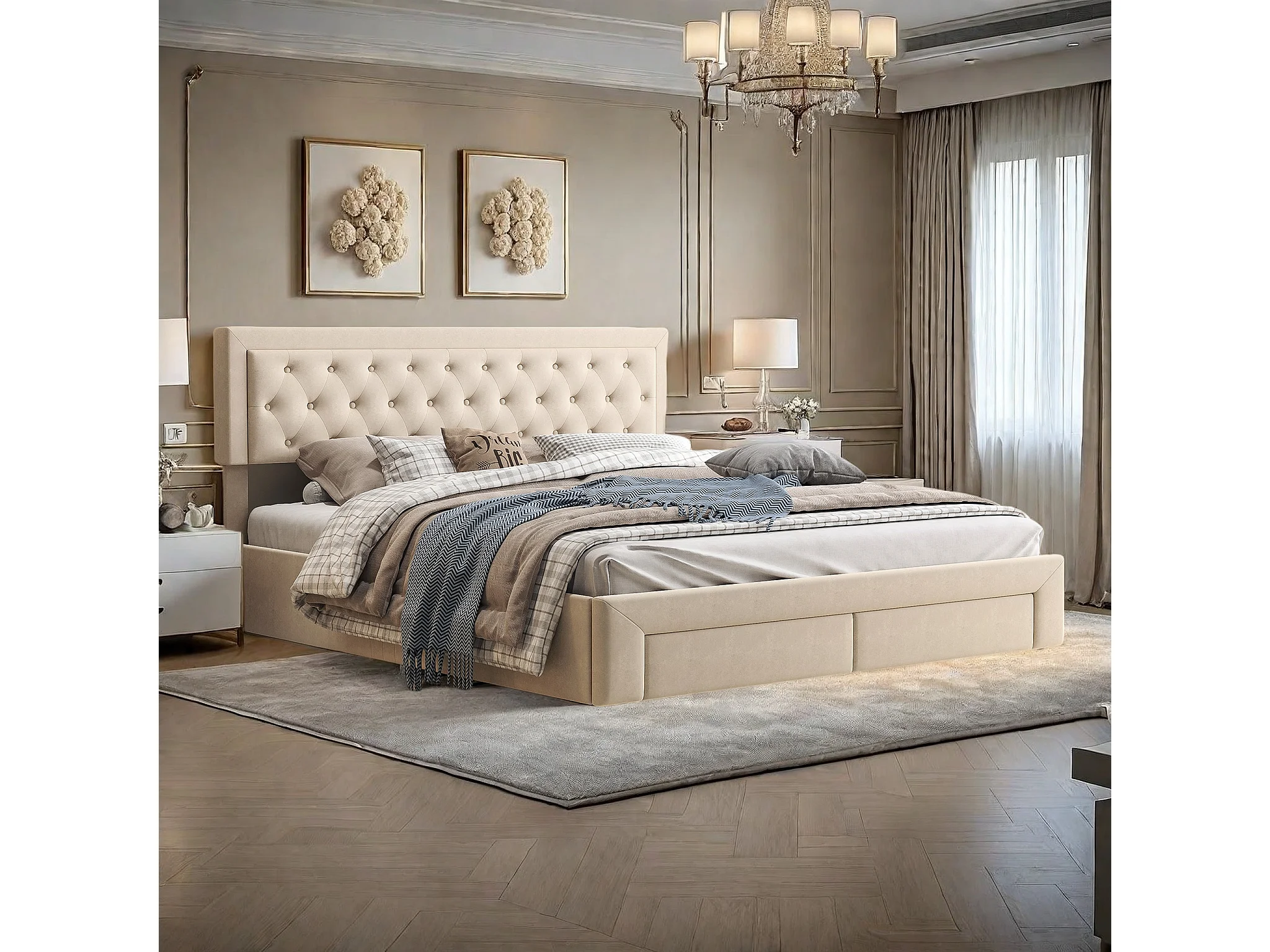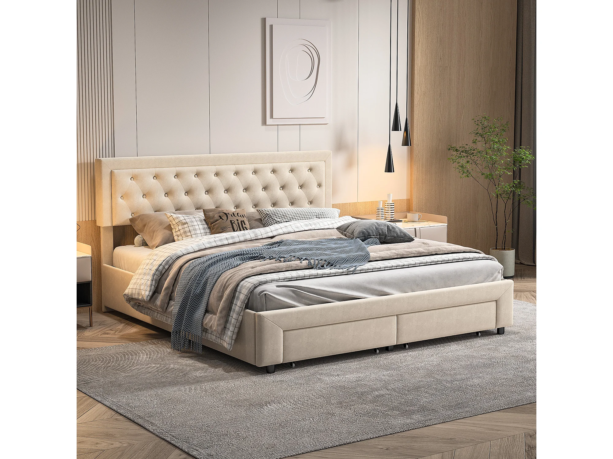 Lit double rembourré, 160 x 200 cm, hydraulique, avec espace de rangement, sommier à lattes, velours, sans matelas, Beige