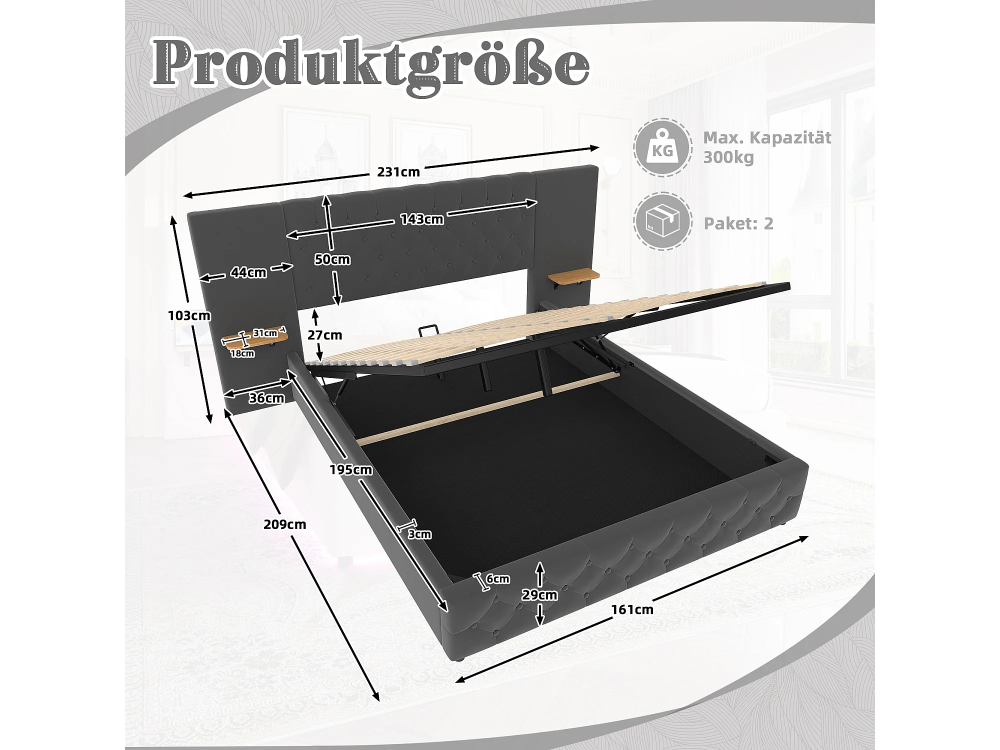 Lit coffre 160x200 cm - avec LED et port USB - velours gris - sans matelas