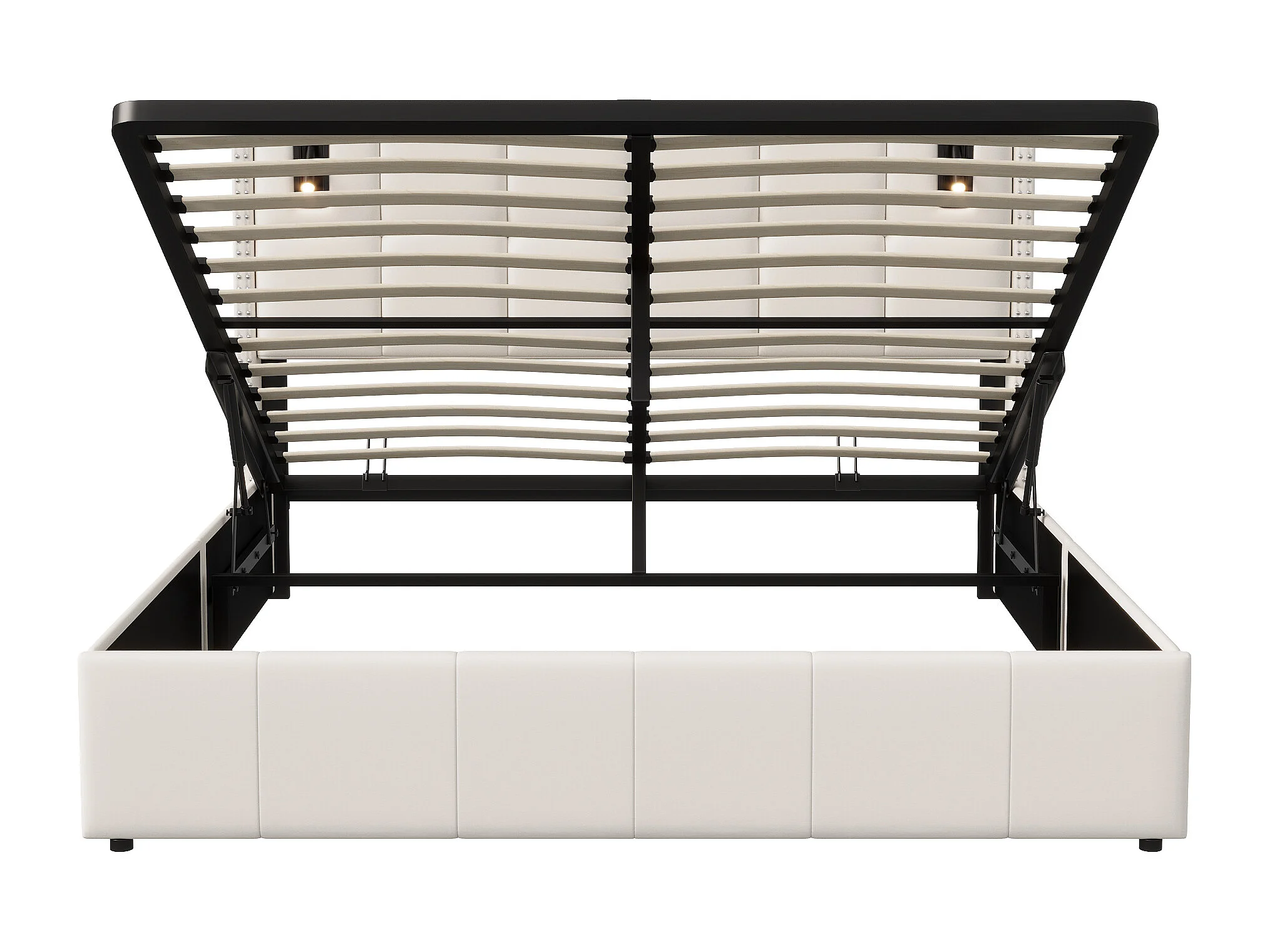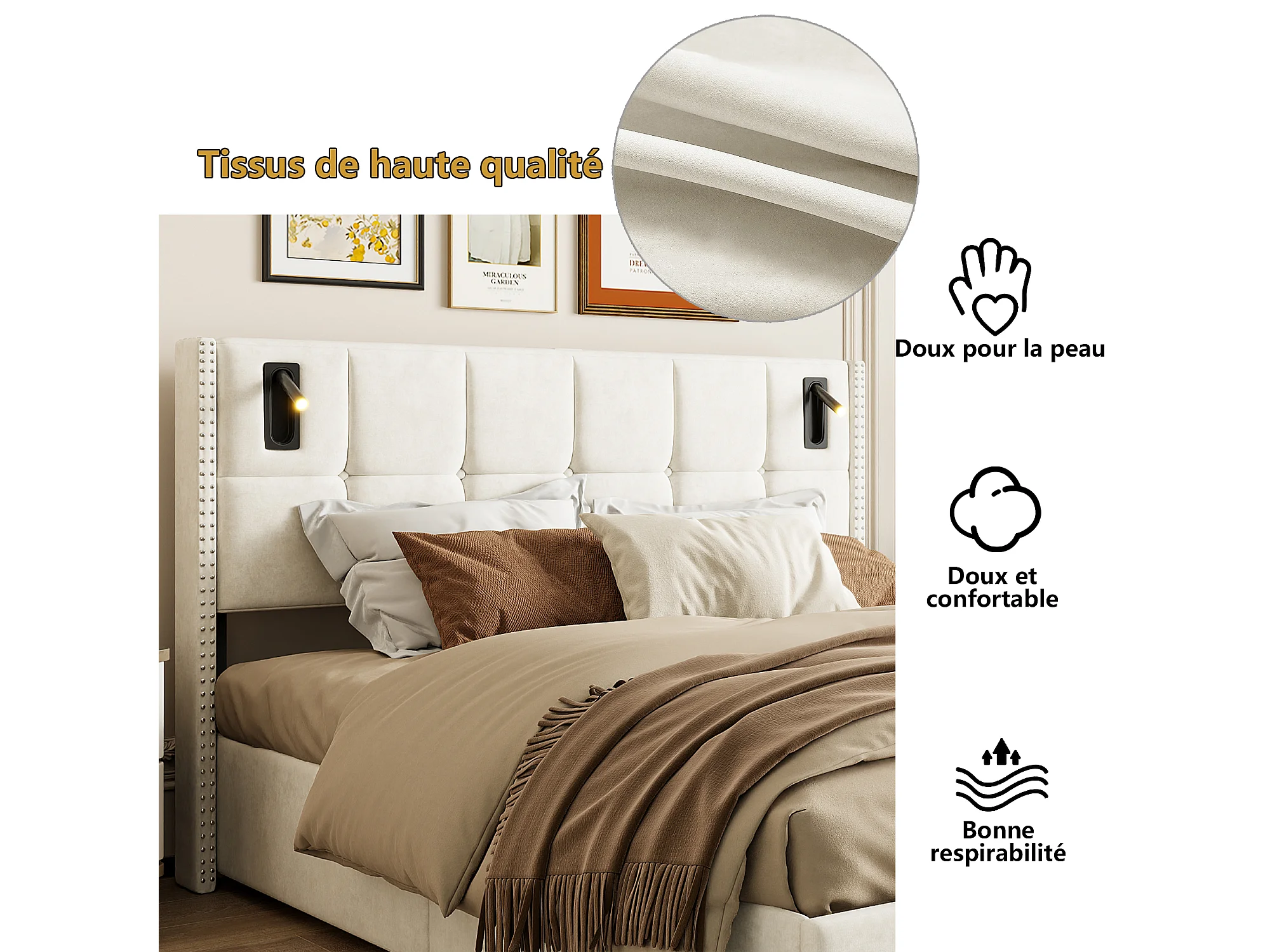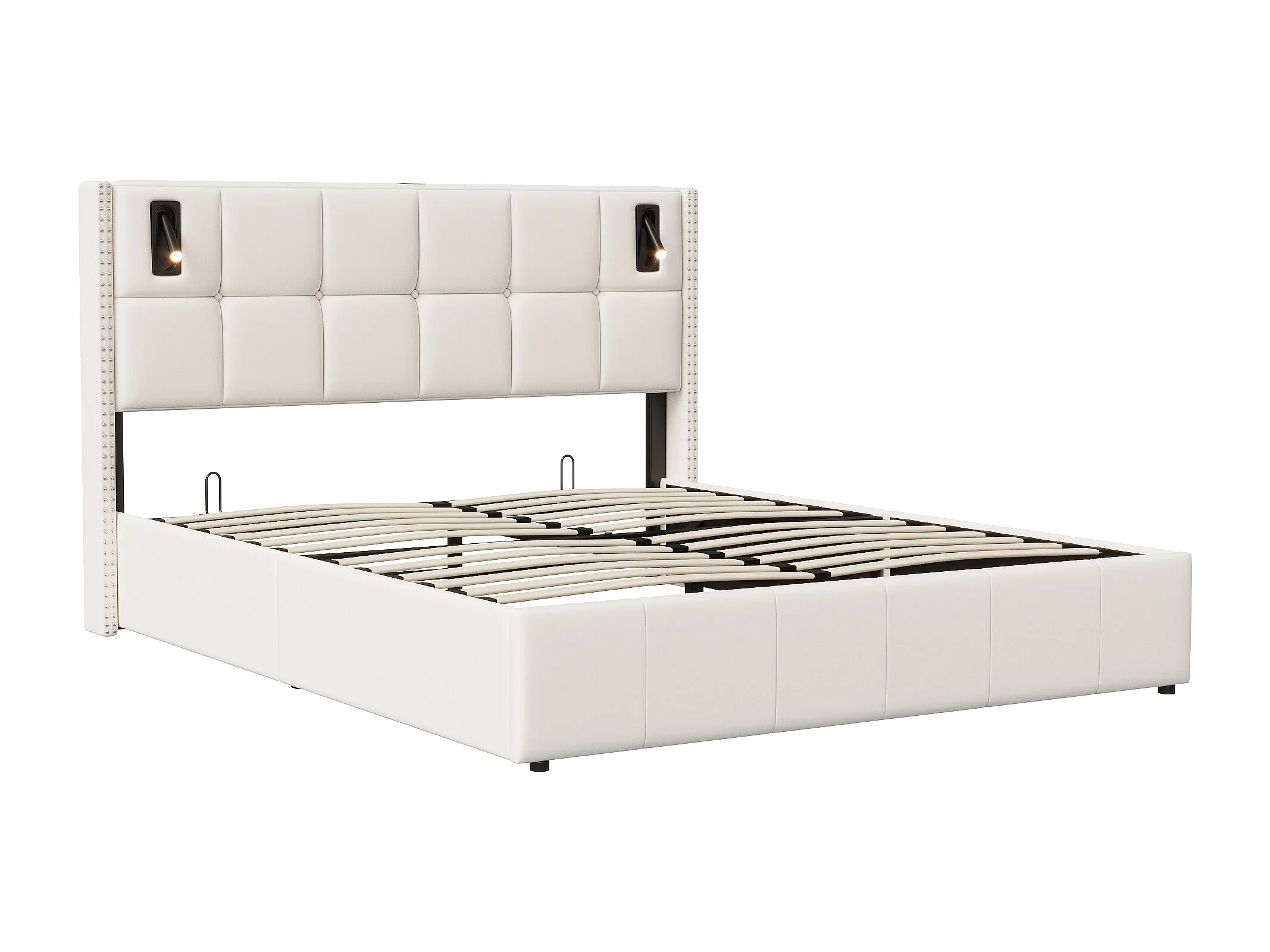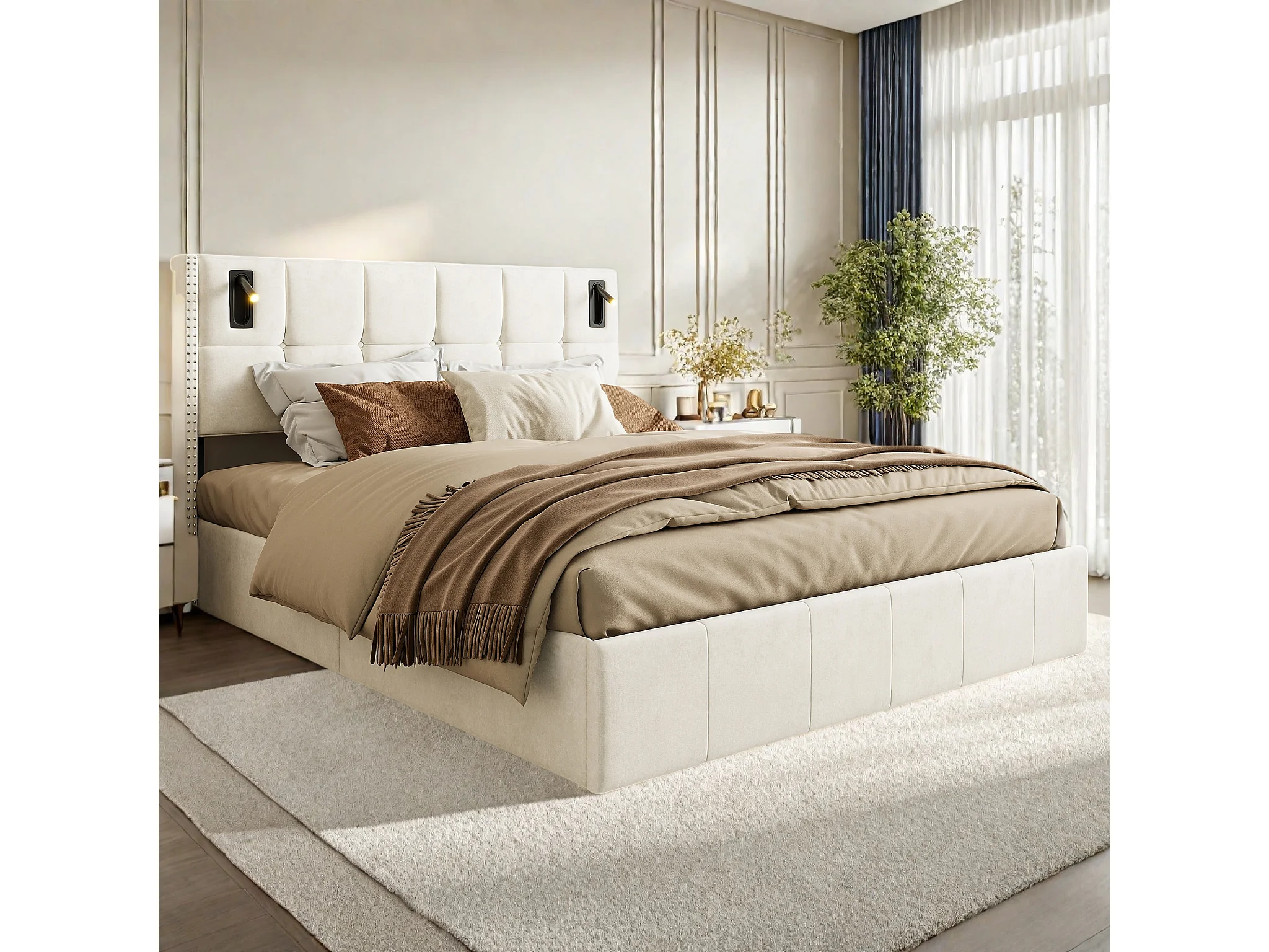 Lit double rembourré, 160 x 200 cm, avec espace de rangement hydraulique, éclairage LED et housse en velours, sommier à lattes, sans matelas, Beige