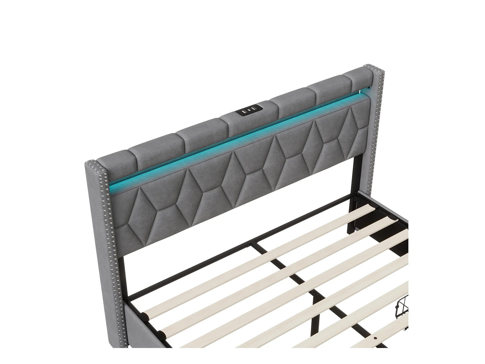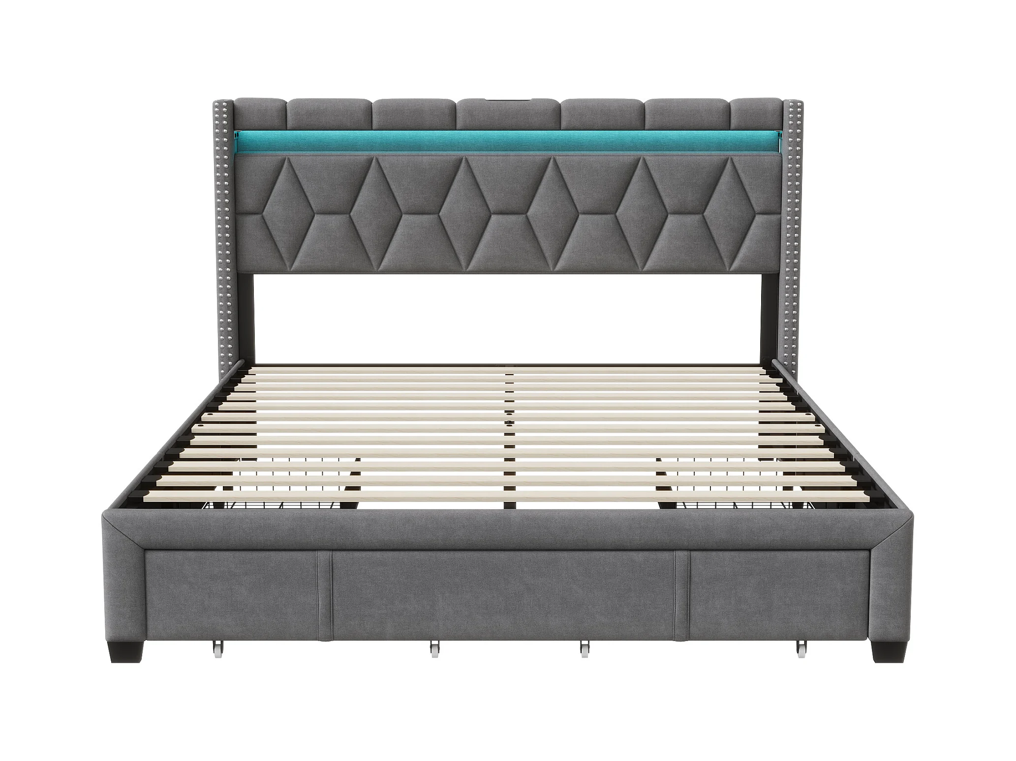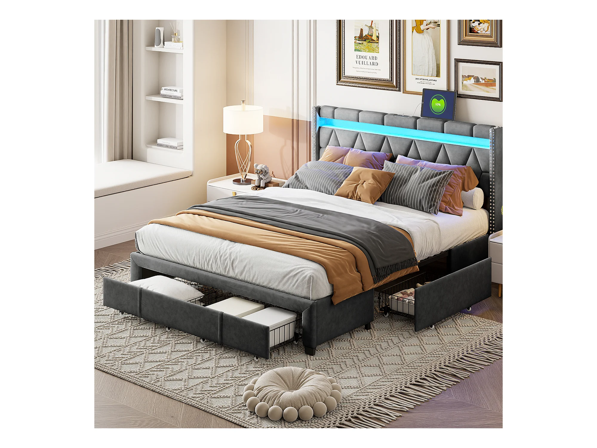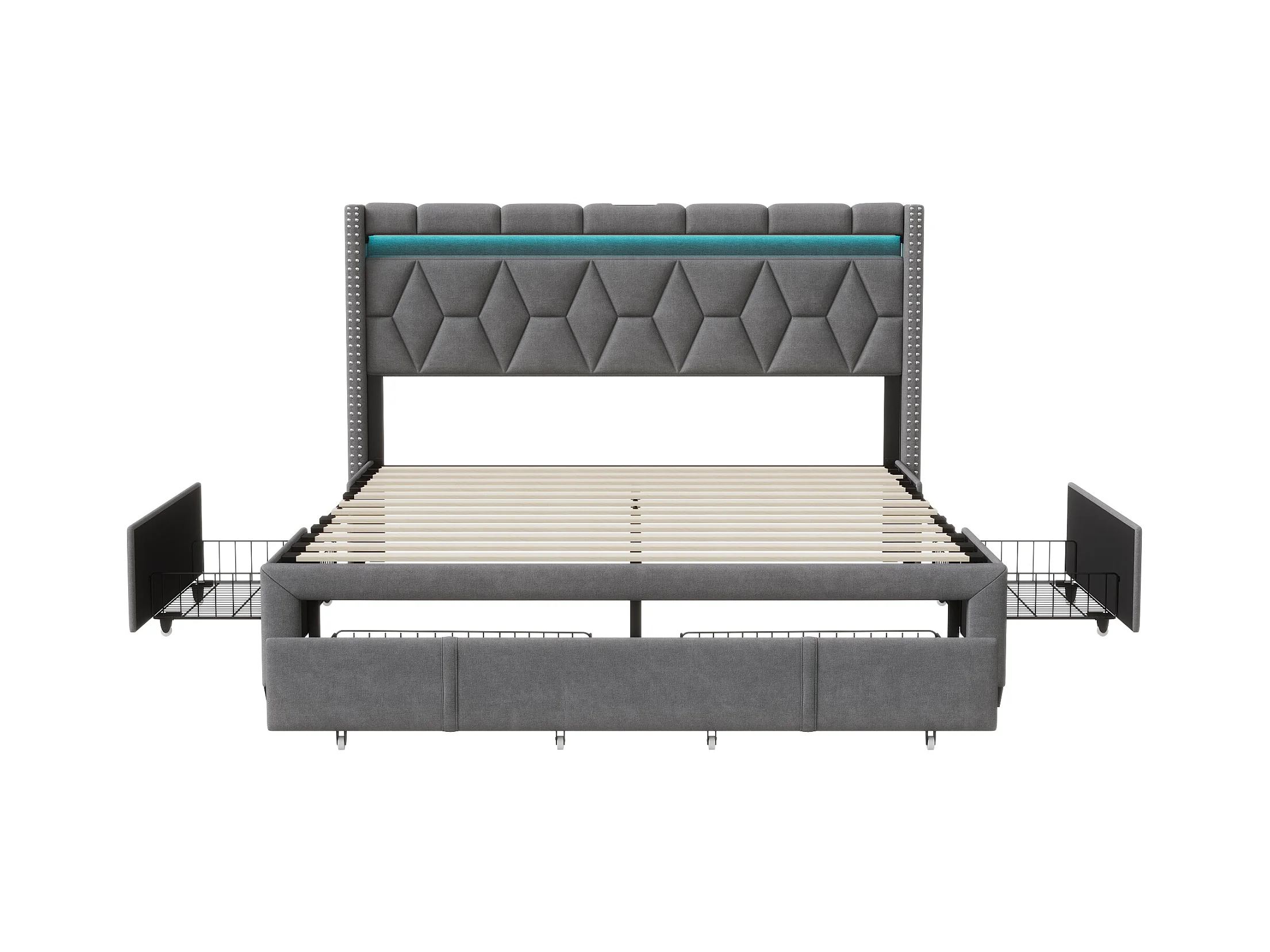 Lit coffre 160x200 cm avec USB et Type-C, Lit capitonné 160x200 avec 4 Tiroirs et LED, Cadre de Lit avec Sommier à Lattes et Tete de Lit, Lit 2 Personnes, Lin, Gris