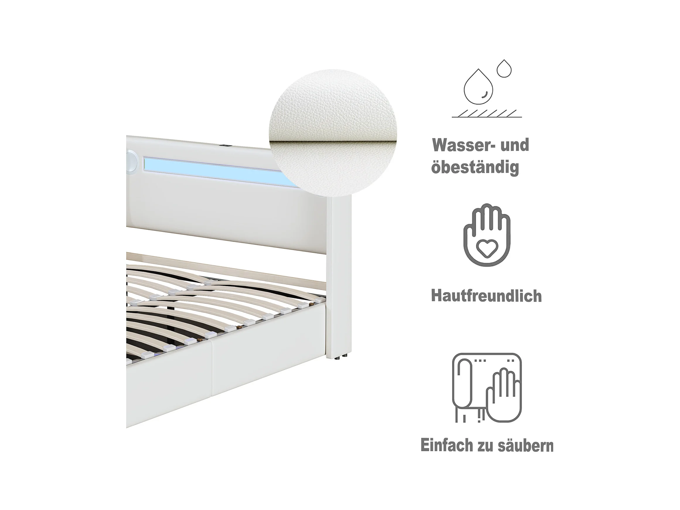 Lit coffre 160x200 cm en PU cuir blanc, éclairage LED, lecteur Bluetooth, port USB, sommier double