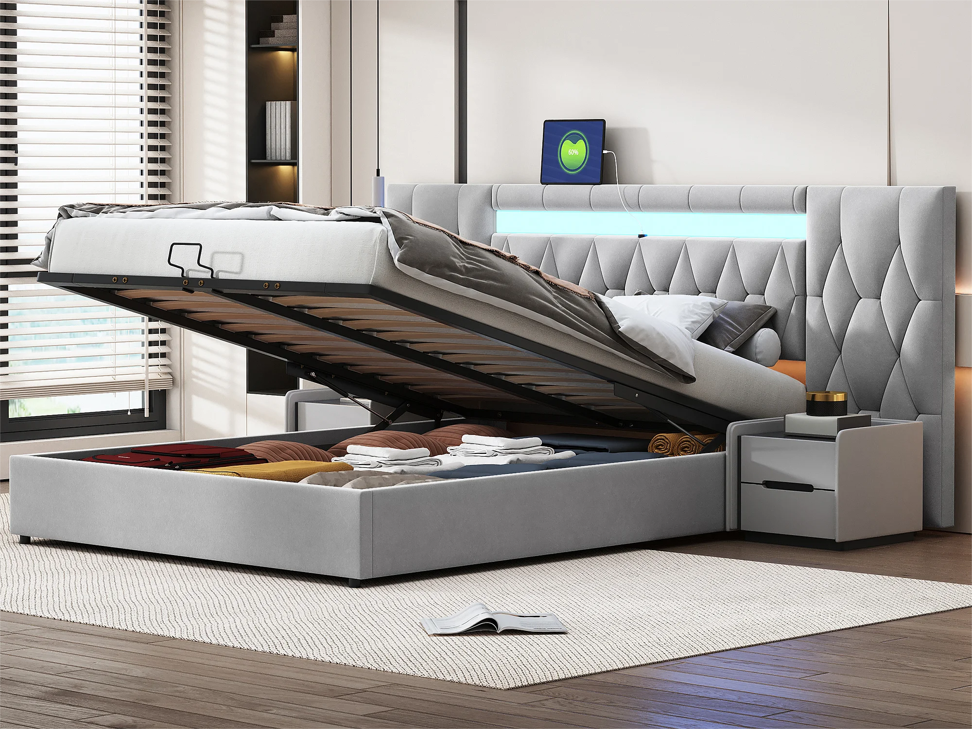 Lit coffre 160x200 cm en velours - avec LED et prise USB - Gris