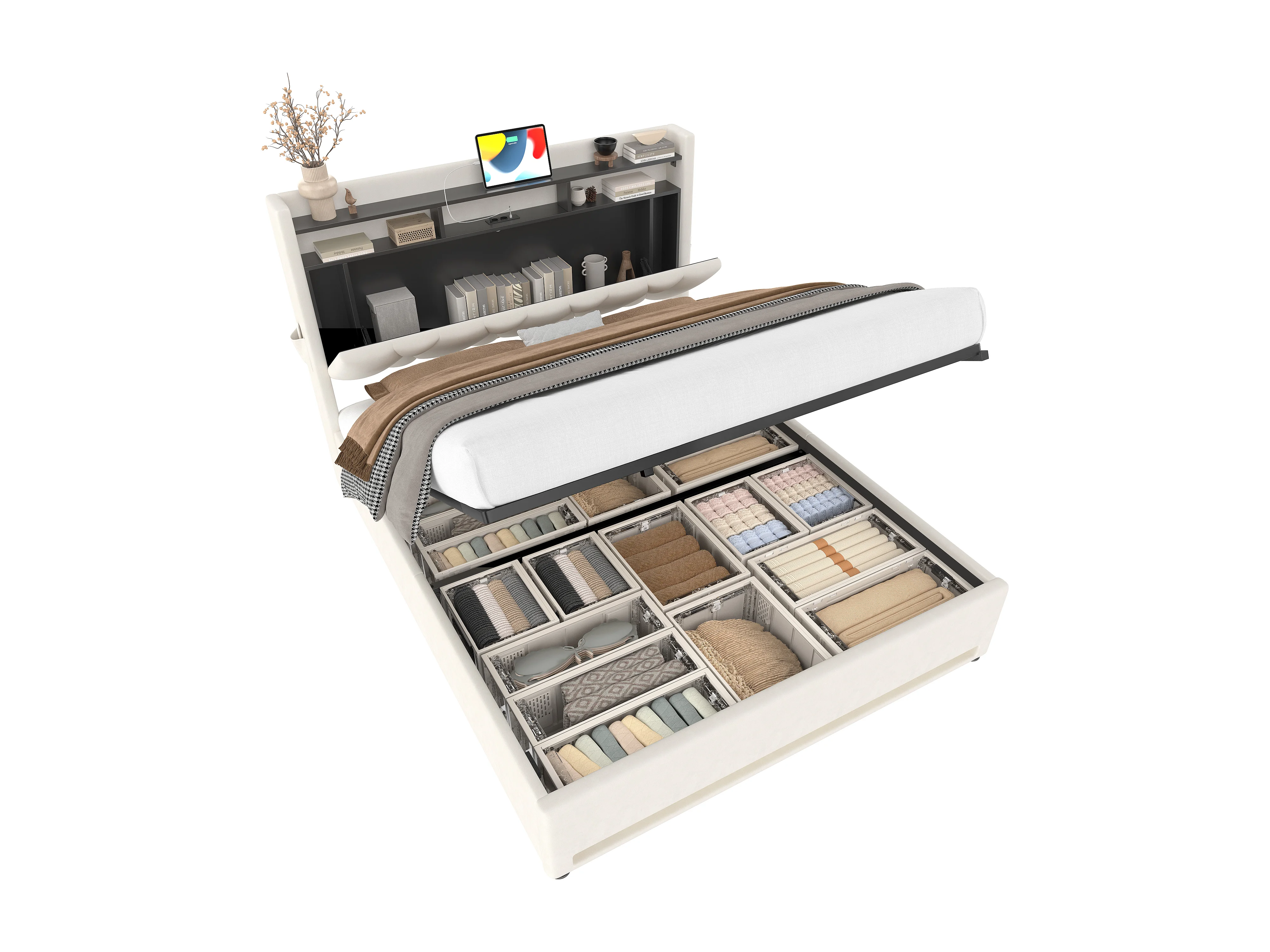 Lit Coffre Rembourré 160×200 Cm Velours Beige –Étagère tête de lit - LED/USB‑C – Grand Coffre Sous Sommier – Style Contemporain