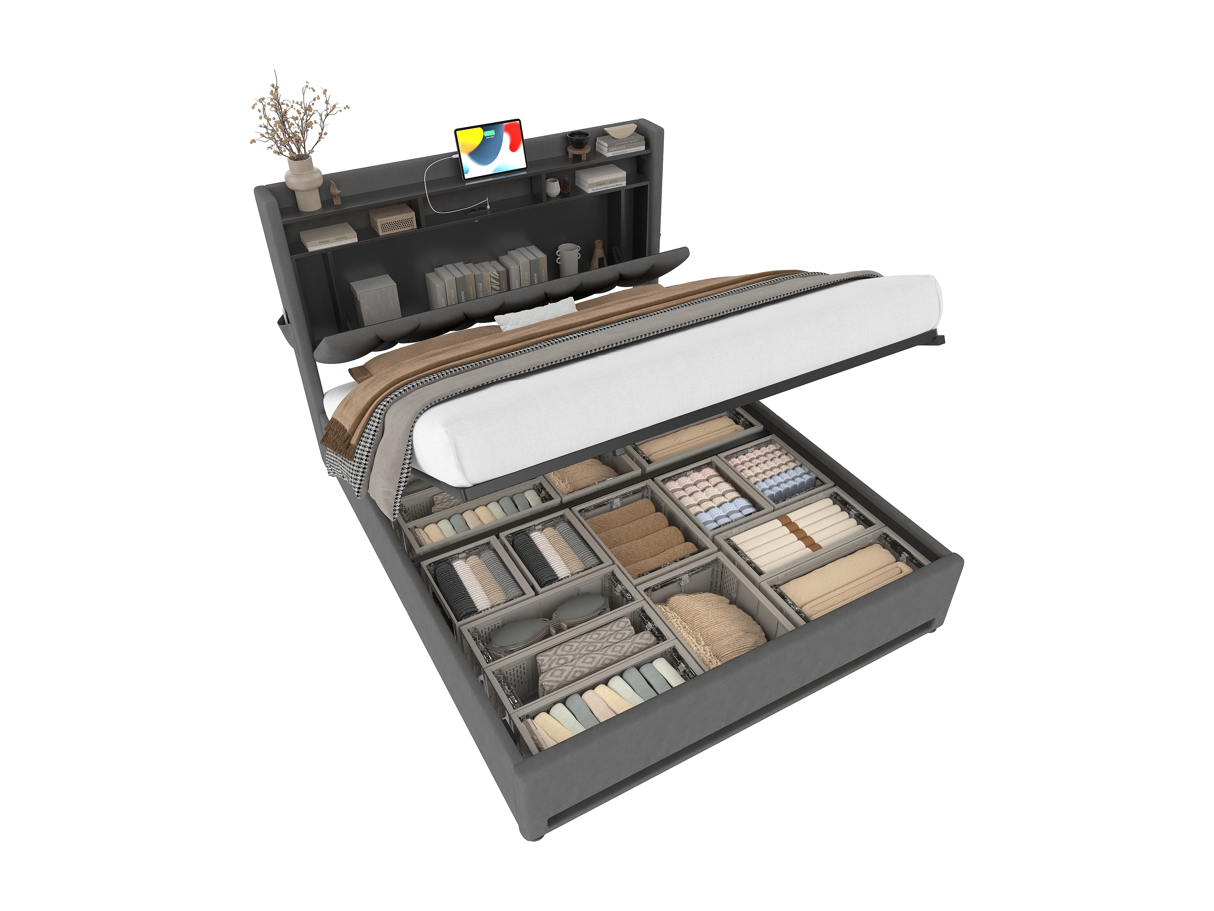 Lit Coffre Rembourré 160×200 Cm Velours Gris Foncé –Étagère tête de lit - LED/USB‑C – Grand Coffre Sous Sommier – Style Contemporain