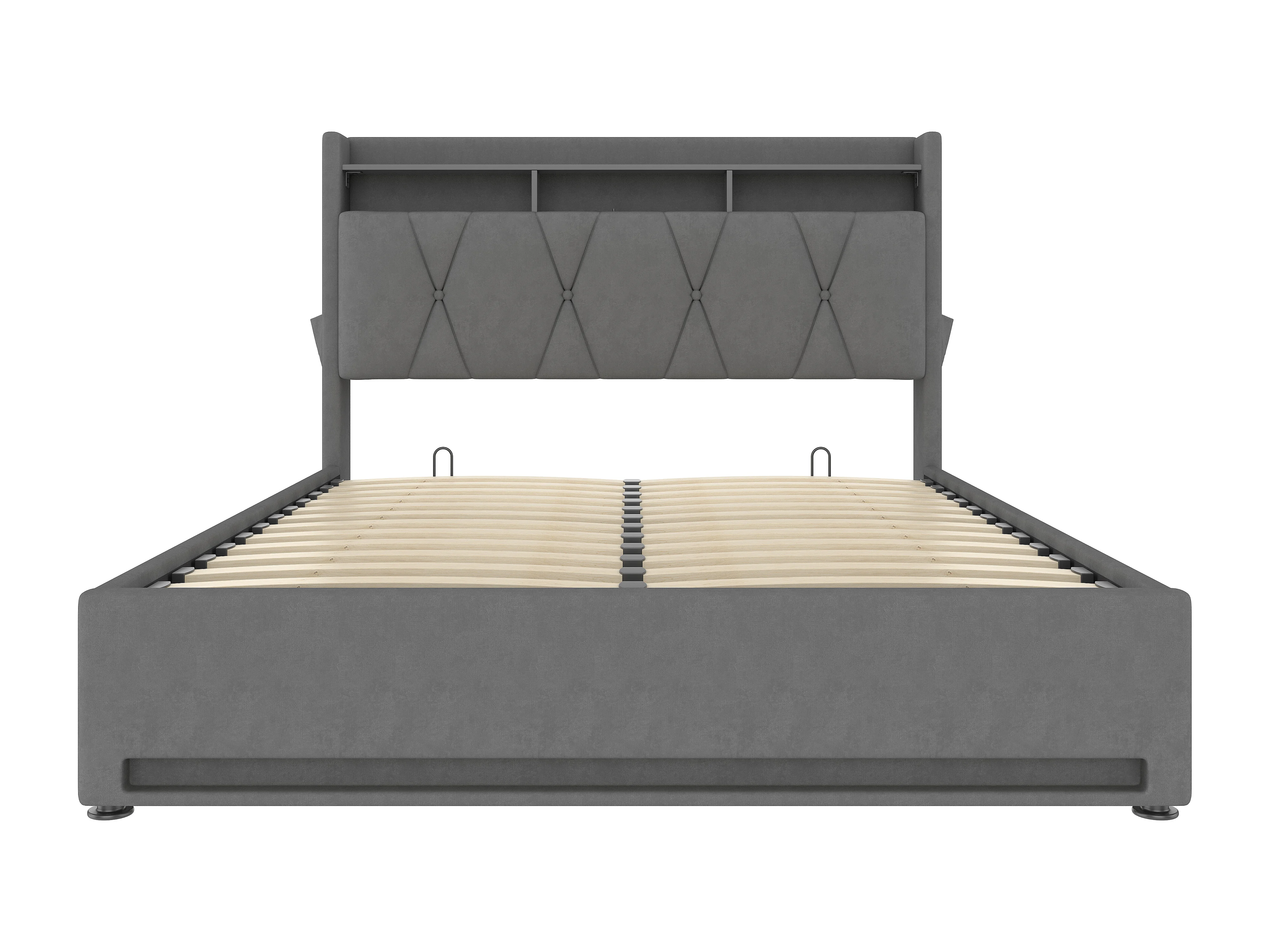 Lit Coffre 160×200 cm - Lit Rembourré en Velours Gris – Étagère Tête De Lit - LED/USB-C – Coffre Hydraulique – Style Contemporain