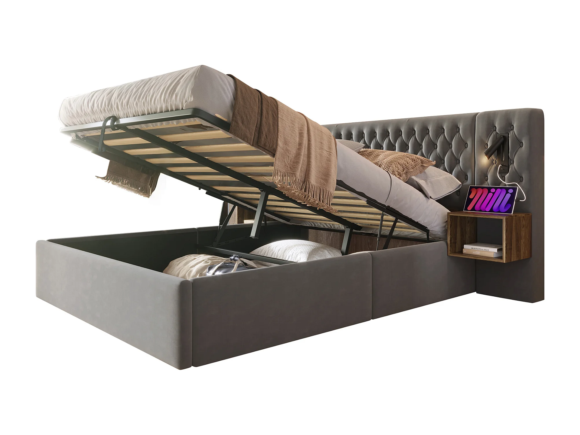 Lit coffre 160x200 cm - Lit adulte avec table de chevet, lampe de lecture et port USB - velours gris - sans matelas