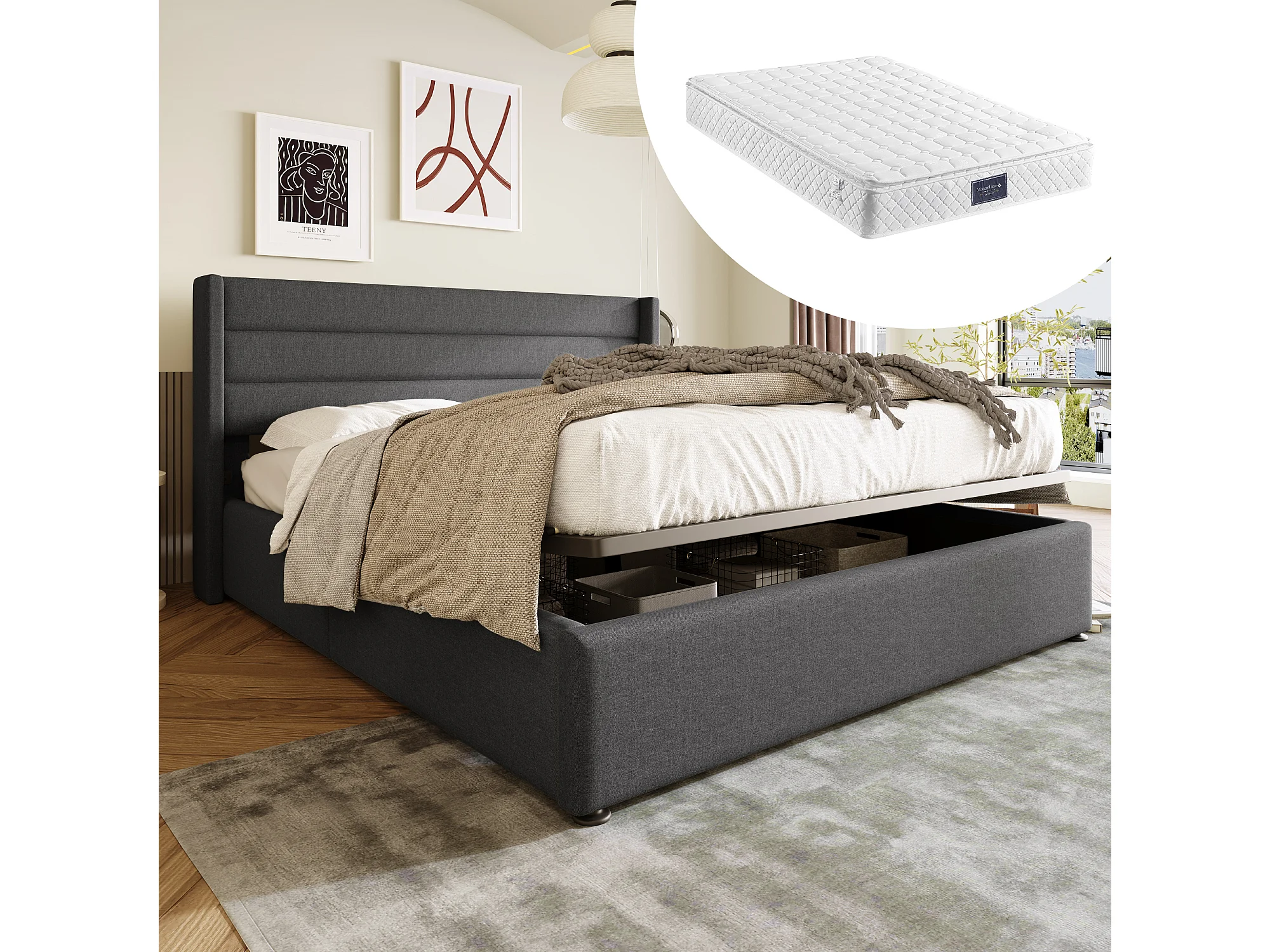Lit coffre 160x200 cm - Lit adulte avec tête de lit - gris lin - matelas inclus