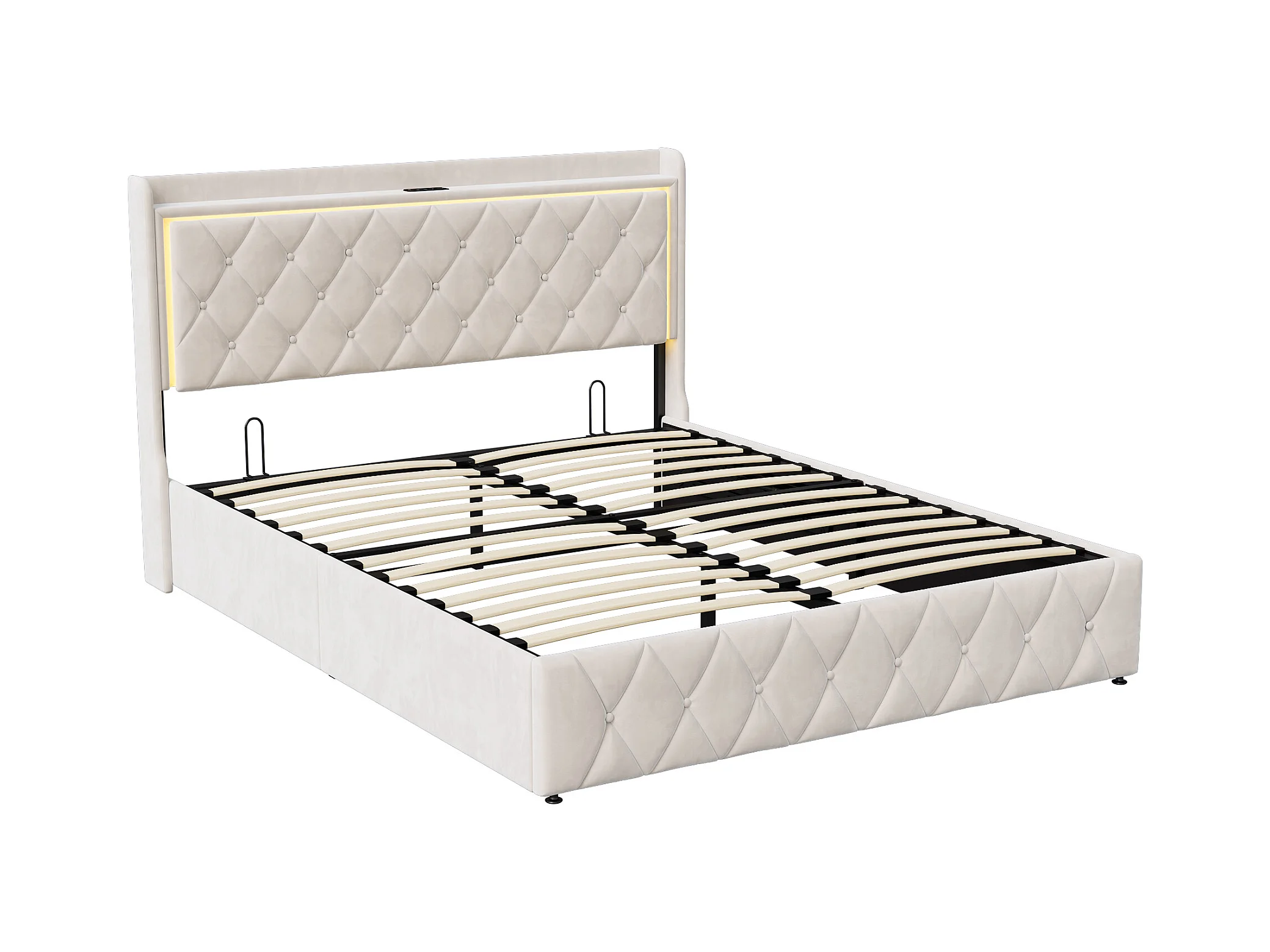 Lit Coffre 160x200 Cm Avec LED, Tête De Lit Est Pliable ,hydraulique, Velours, Beige