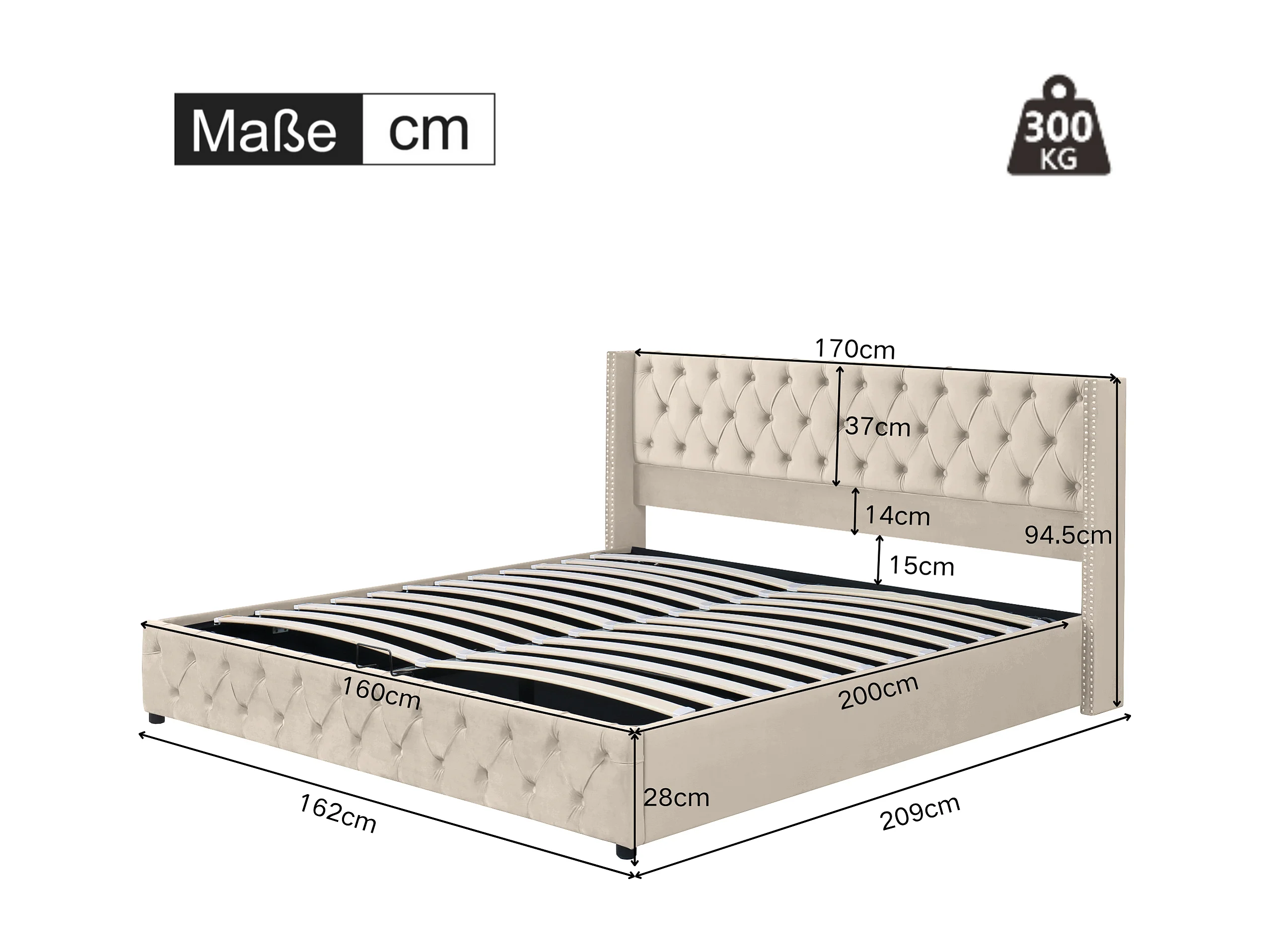 Lit coffre 160x200 cm - lit adulte en forme d'oreille double rangée de rivets - lit double - velours - beige