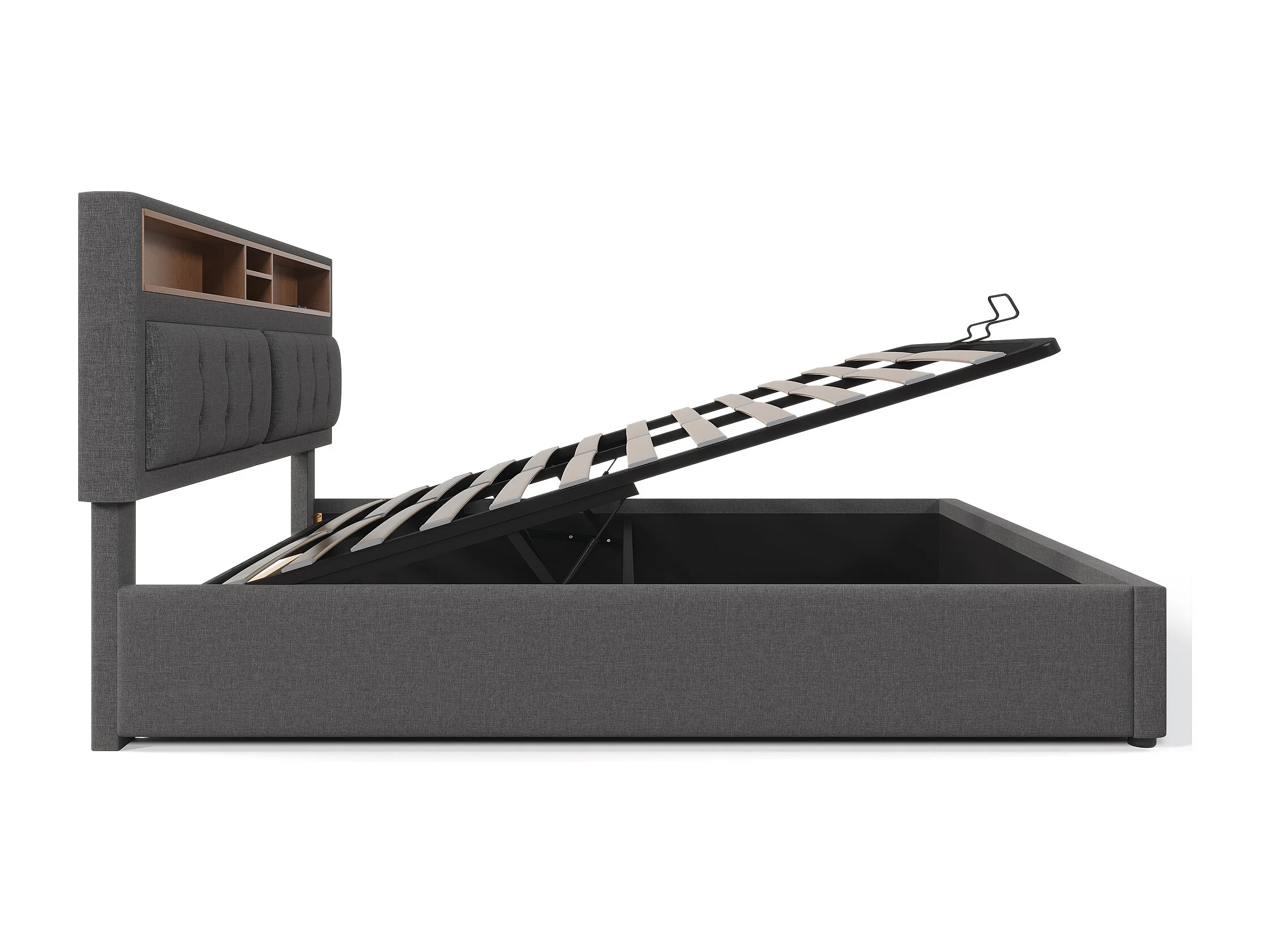 Lit coffre 160x200 cm - lit double capitonné avec tête de lit fonction chargement prise USB C - lin - gris - sans matelas