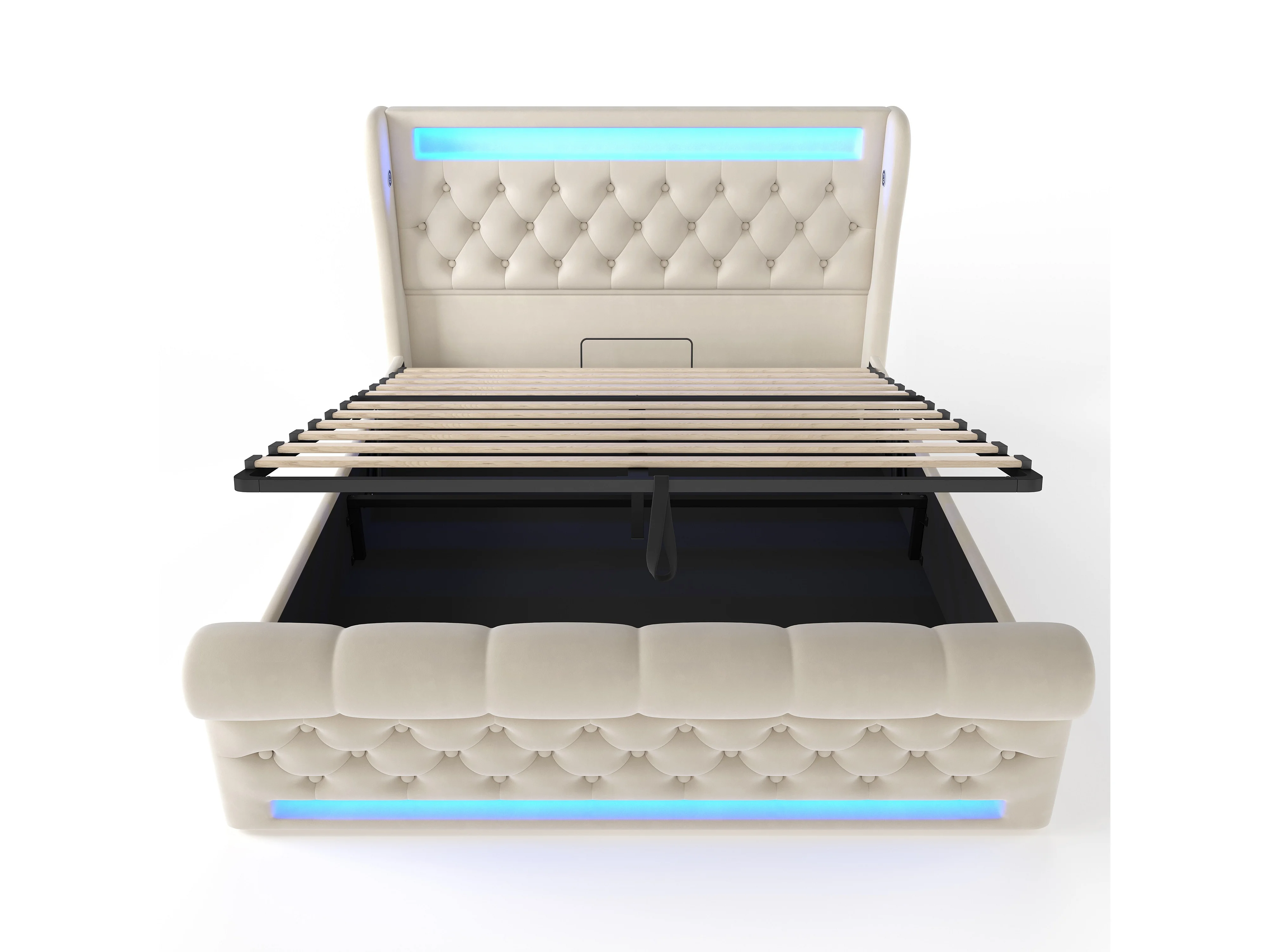 Lit coffre 160x200 cm, velours beige, Lit double avec LED et ports USB - sans matelas