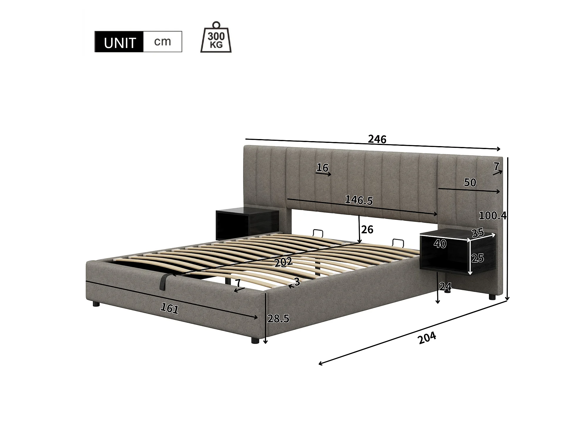 Lit coffre 160x200cm en tissu lin - avec 2 tables de chavet et sommier à lattes - Gris