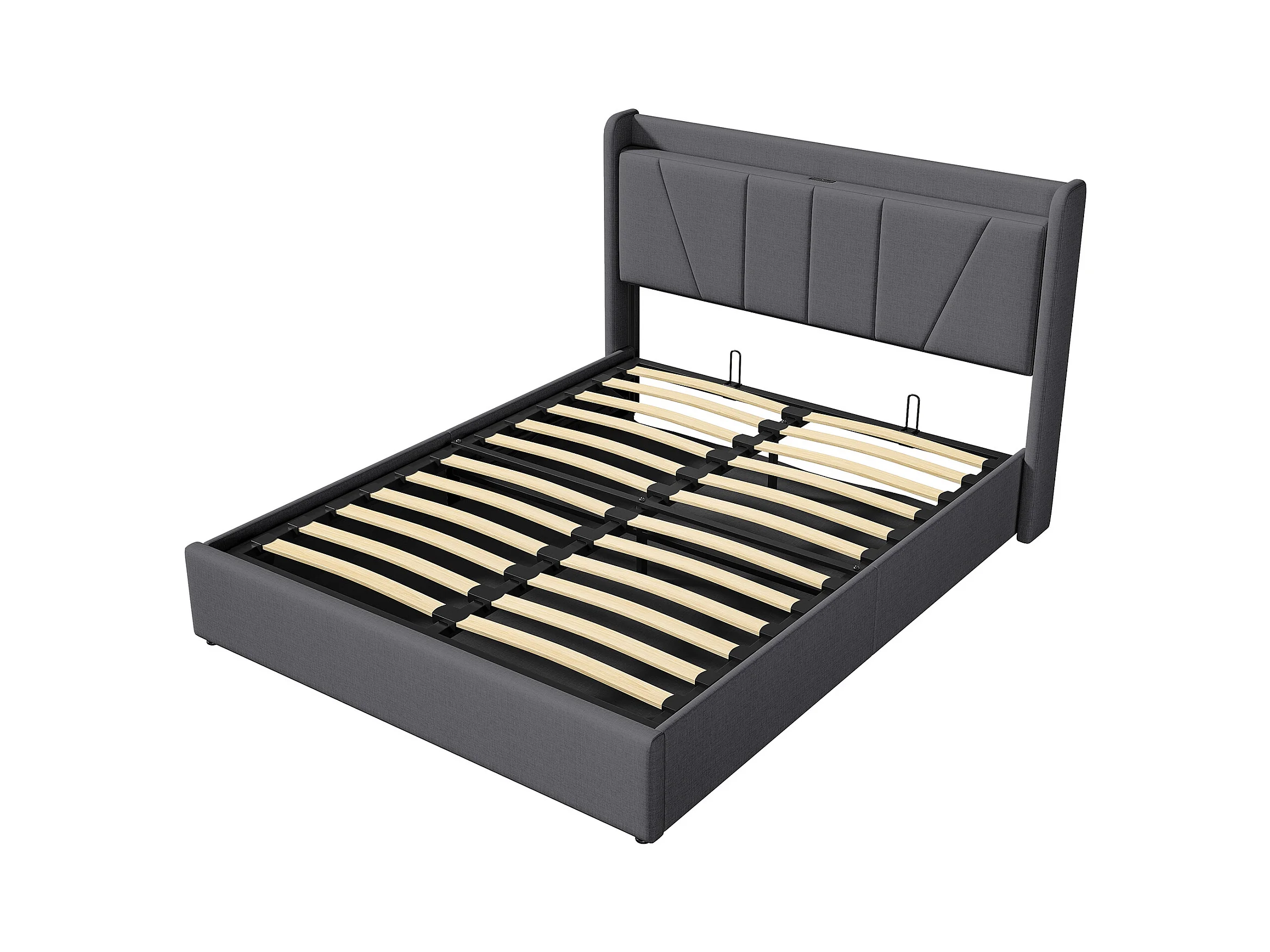 Lit coffre 160x200cm en tissu lin avec port USB - tête de lit et sommier à lattes - Gris