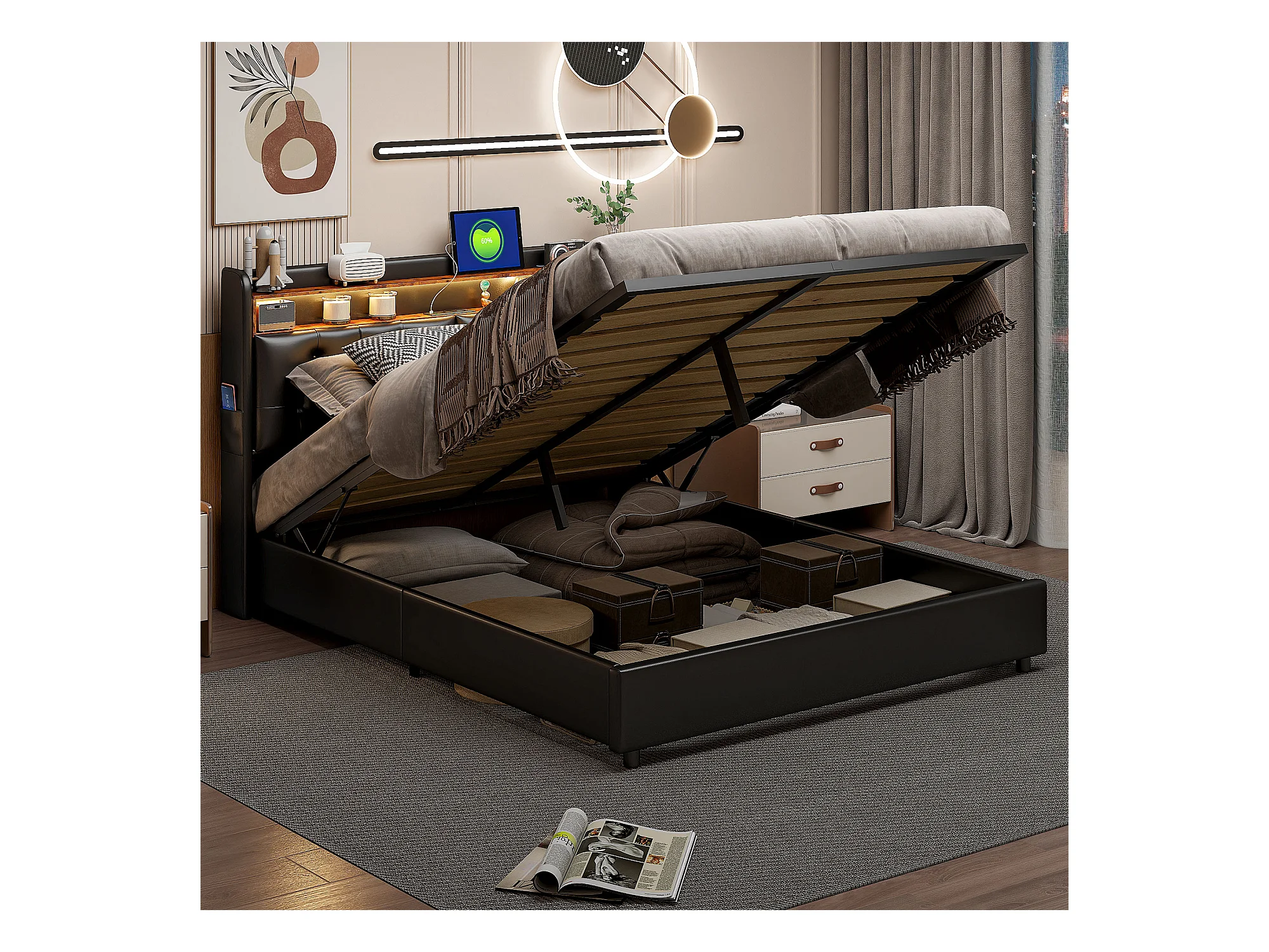 Lit coffre 160x200cm - lit double avec sommier à lattes et tête de lit LED avec étagères et port charge - cuir noir