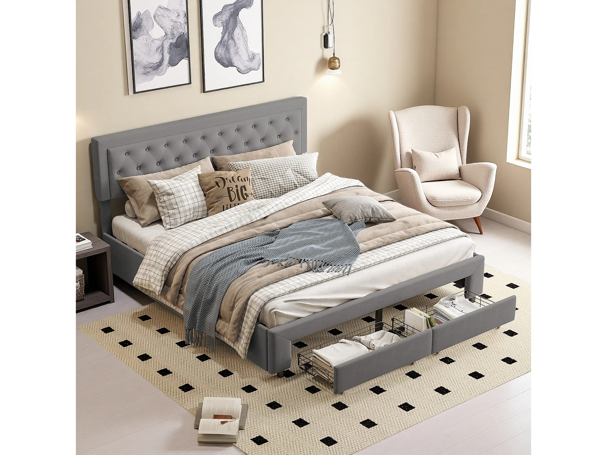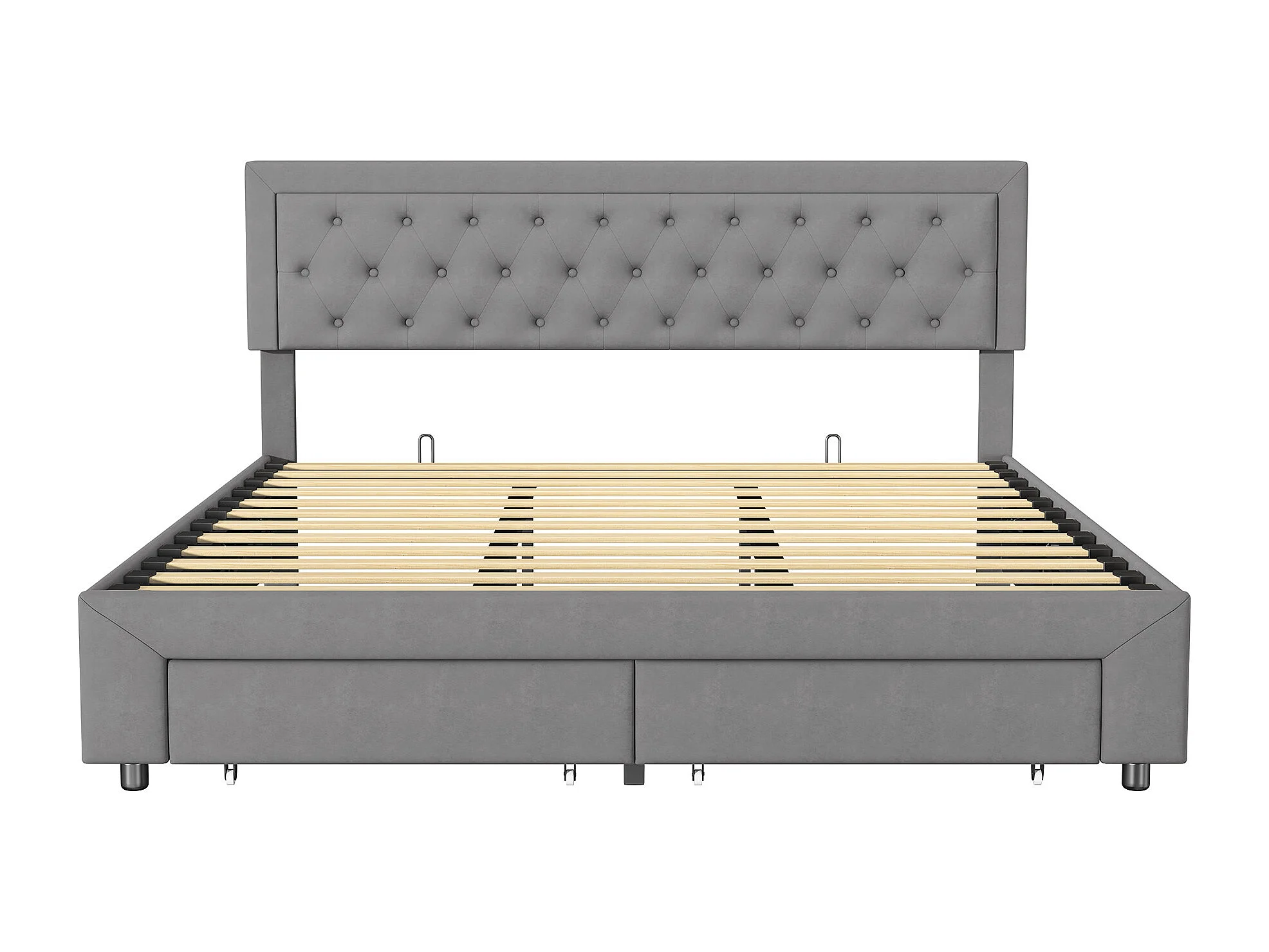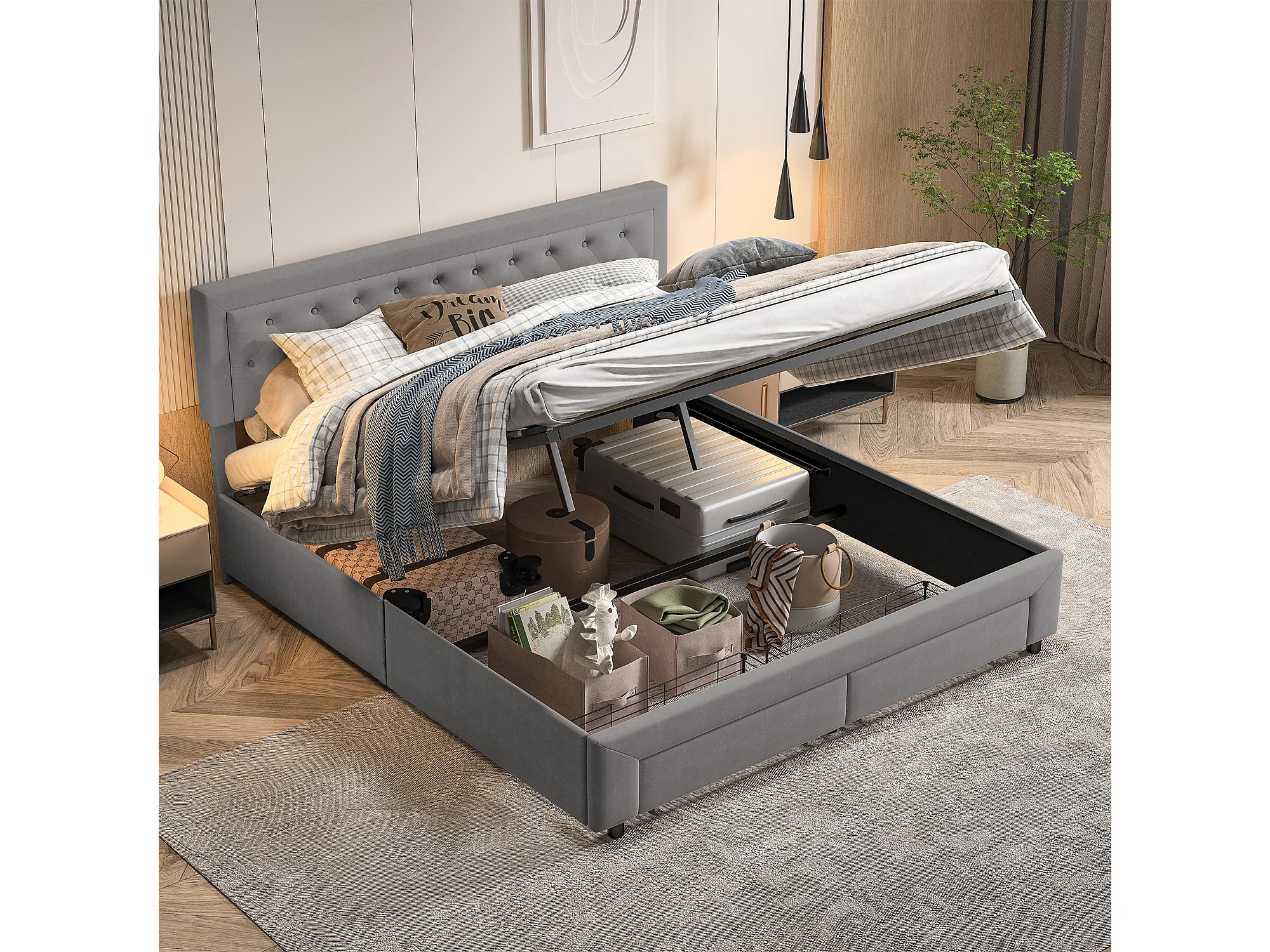 Lit double rembourré, 180 x 200 cm, hydraulique, avec espace de rangement, sommier à lattes, velours, sans matelas, gris