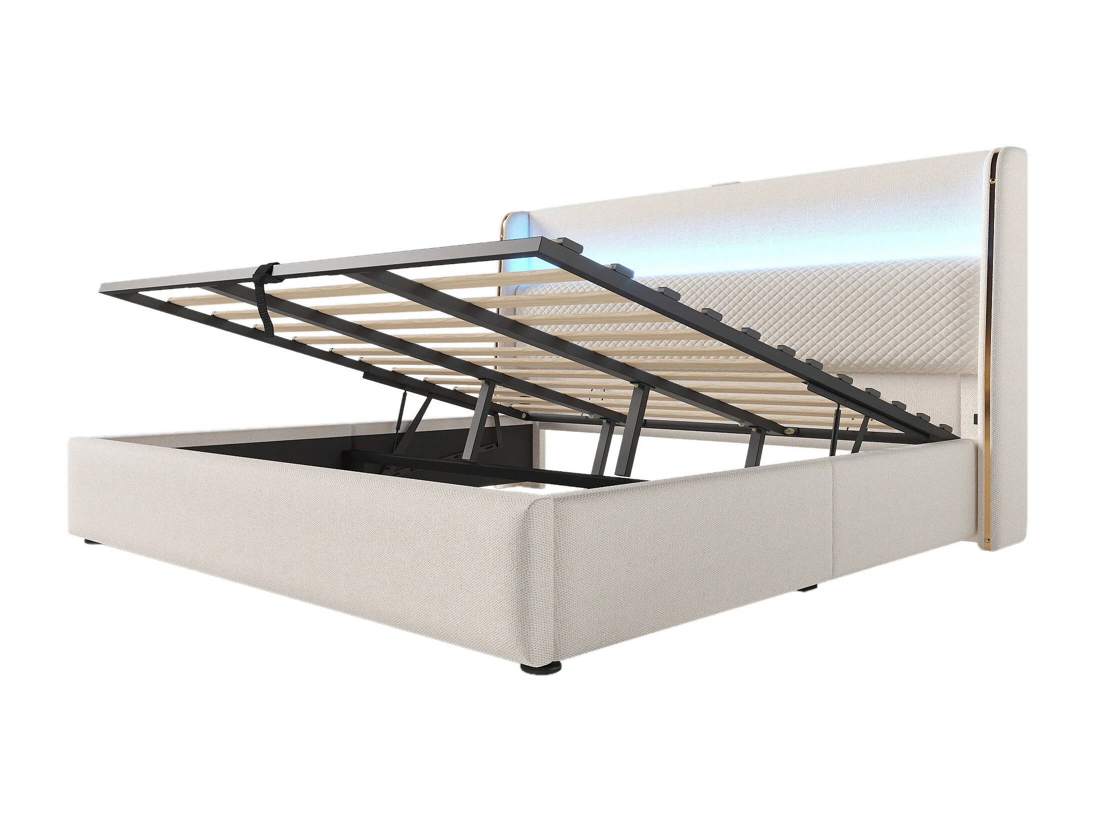 Lit coffre 180x200 cm Lit double avec LED et port USB, tête de lit capitonnée - Lin beige (sans matelas)